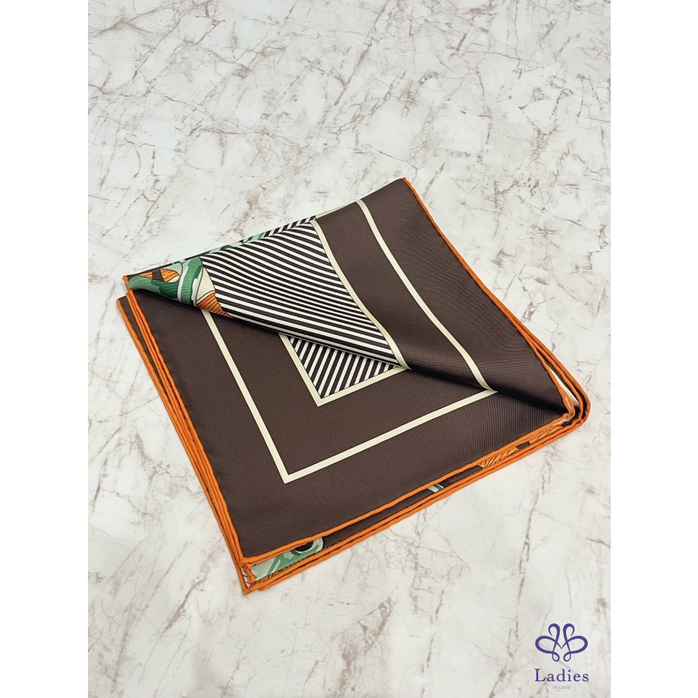 這款 Hermès 經典方巾以馬術與襯衫元素為靈感,搭配 Detail Wash 水彩洗染工藝,讓巧克力棕與暖橘、米色柔和交融,宛如一幅復古畫作,散發法式優雅韻味🎨。