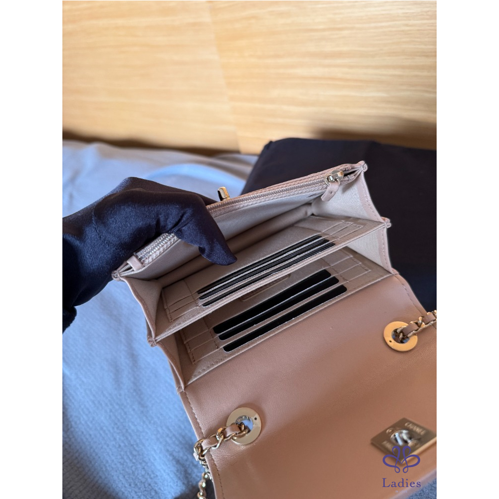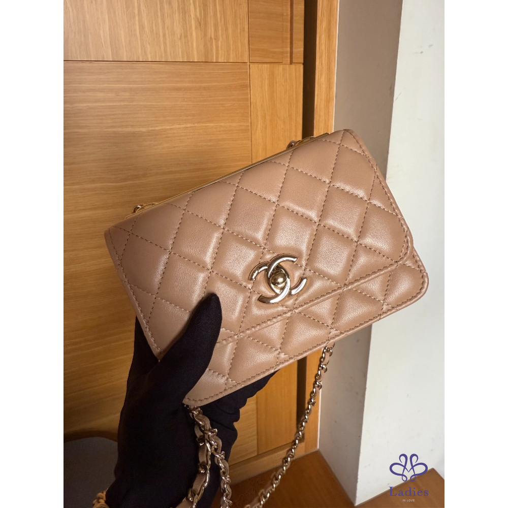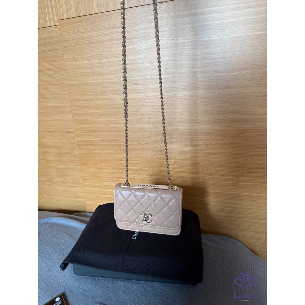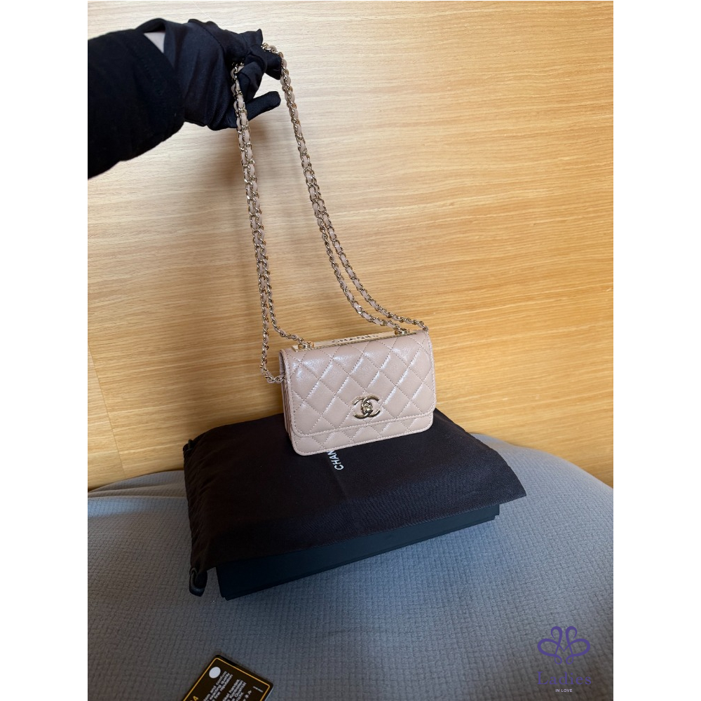 產品信息 全新 Chanel mini trendy cc WOC 米色 金釦 保卡款 全新閒置品 未使用 內建卡片、零錢層 不用另外帶錢包 中間有雙隔層 非常好裝 容量很好用 16 pro手機可放 尺寸約:11*11*6 cm 配件:紙盒、緞帶山茶花、保卡、購證去個資 交貨方式:雙北面交、郵寄、店到店、宅配、lalamove