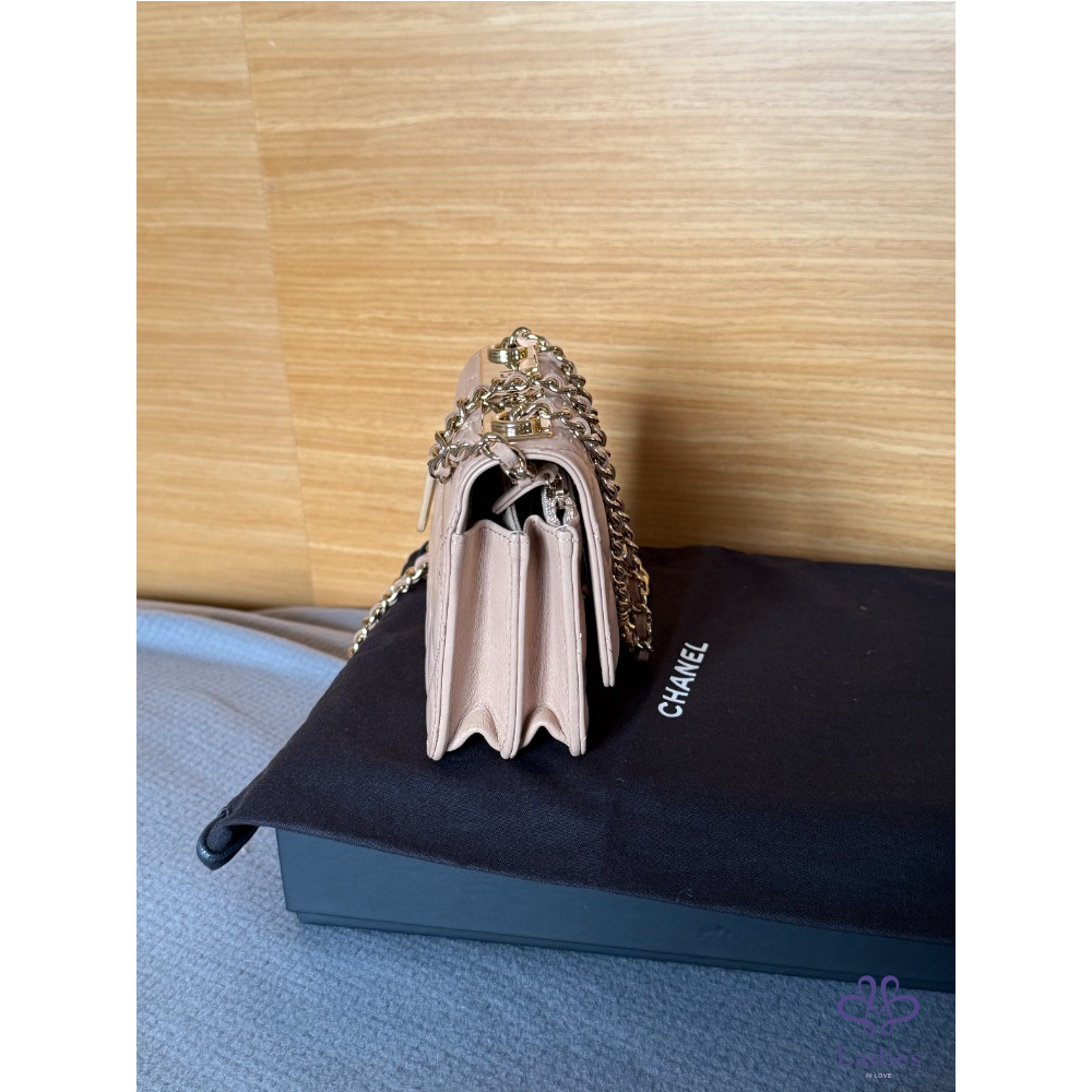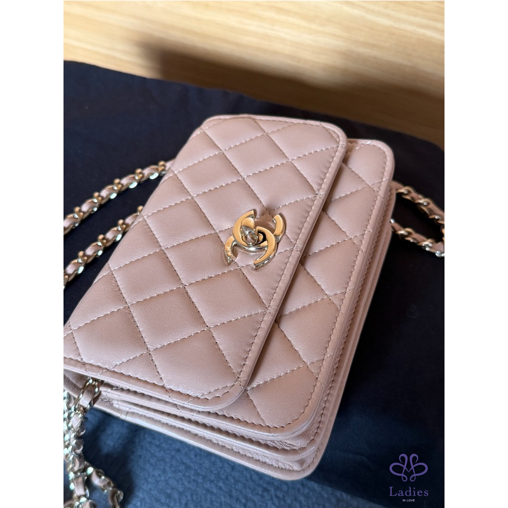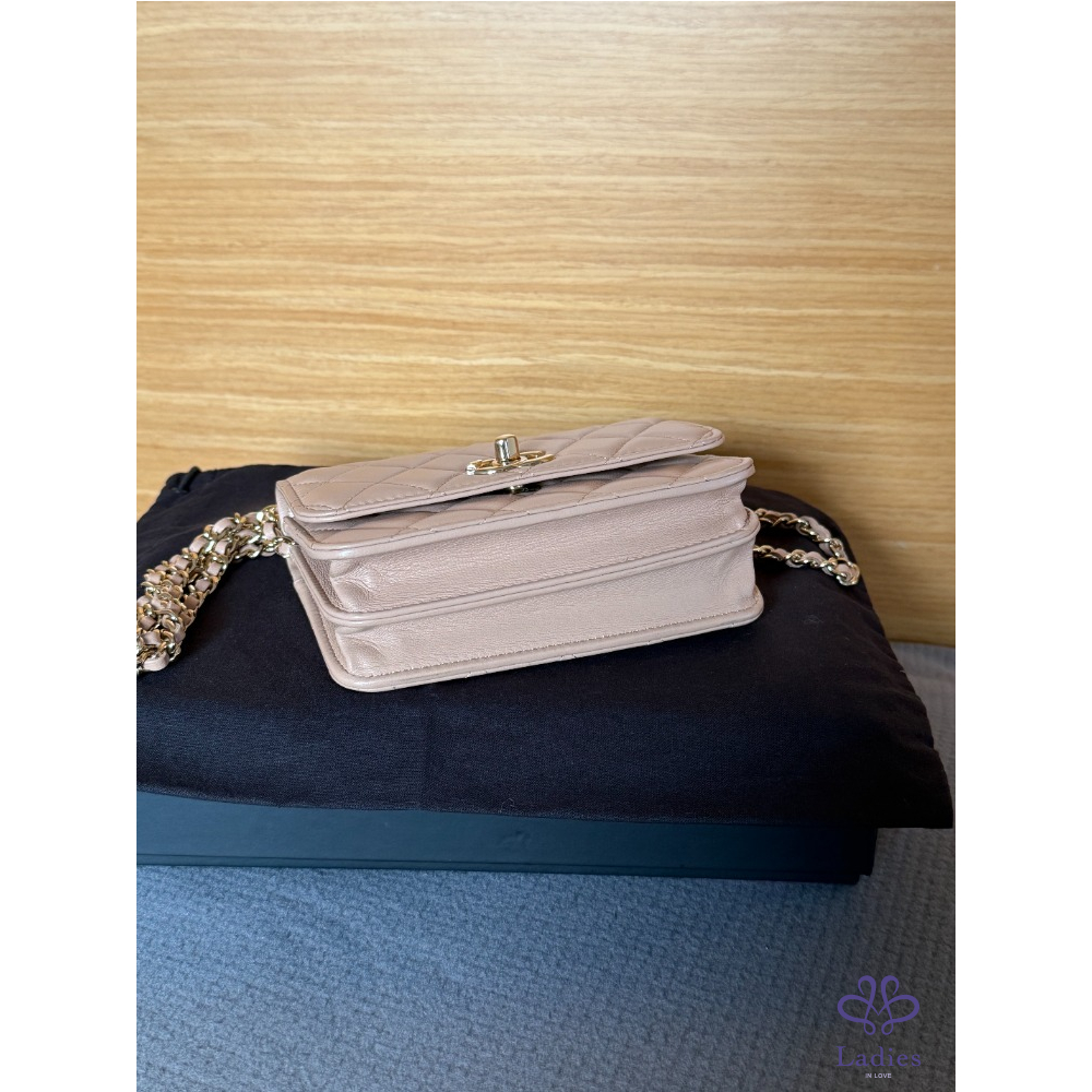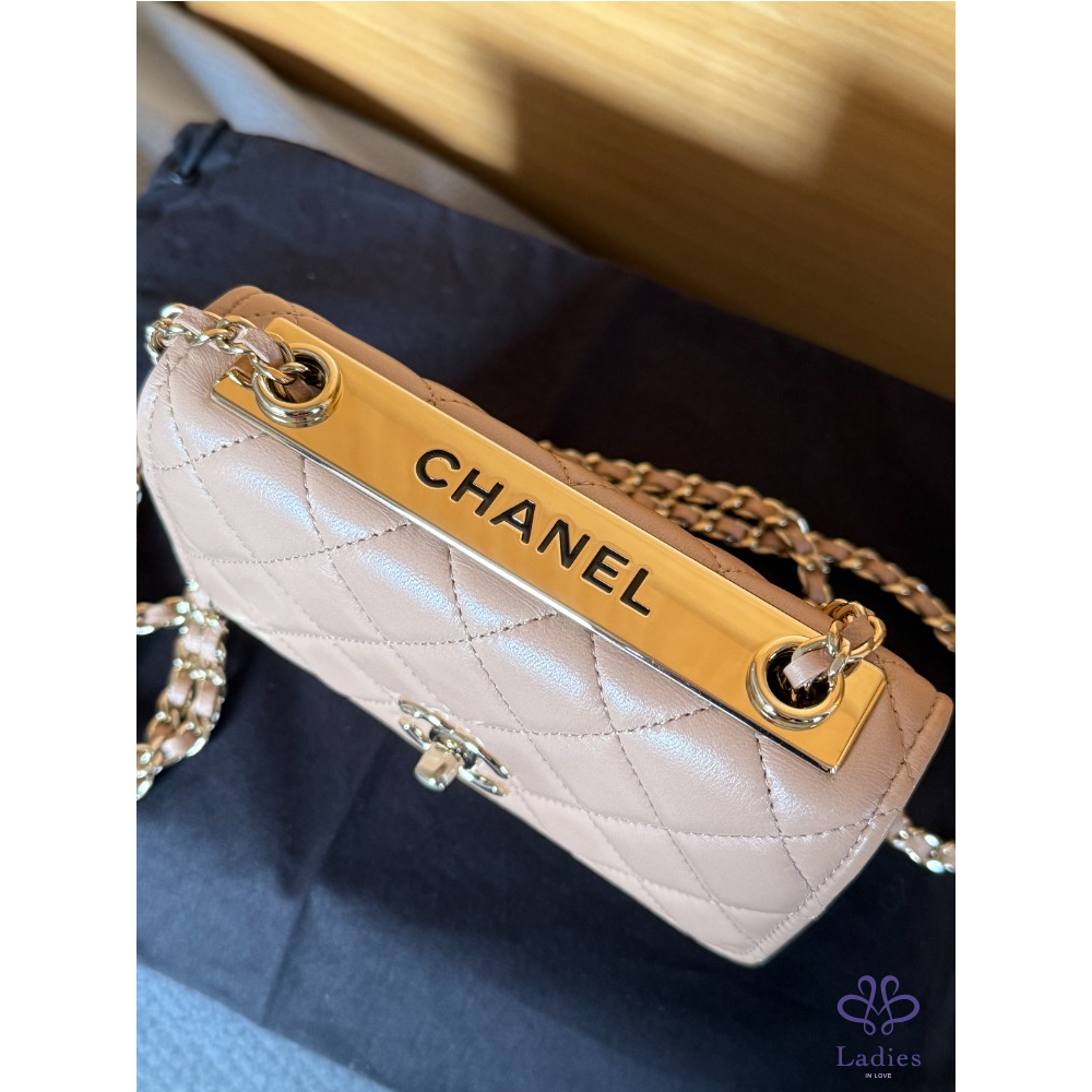 產品信息 全新 Chanel mini trendy cc WOC 米色 金釦 保卡款 全新閒置品 未使用 內建卡片、零錢層 不用另外帶錢包 中間有雙隔層 非常好裝 容量很好用 16 pro手機可放 尺寸約:11*11*6 cm 配件:紙盒、緞帶山茶花、保卡、購證去個資 交貨方式:雙北面交、郵寄、店到店、宅配、lalamove