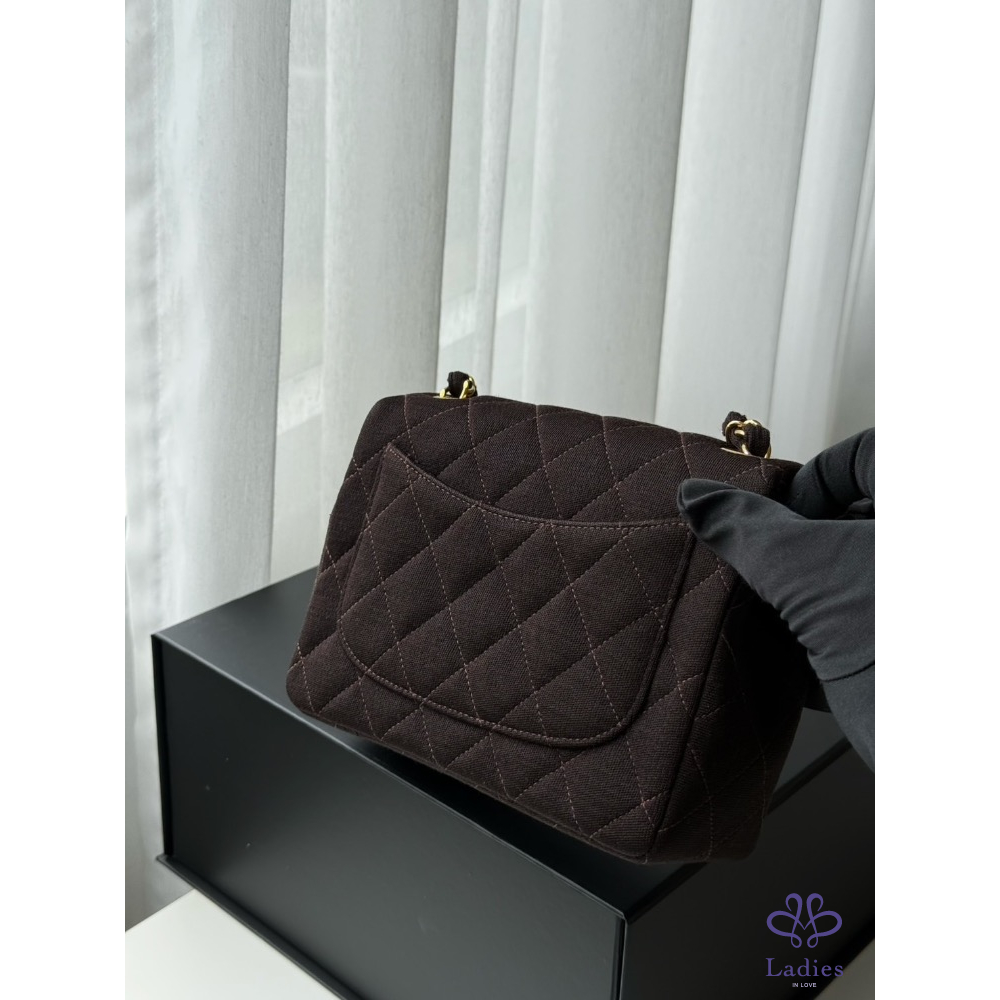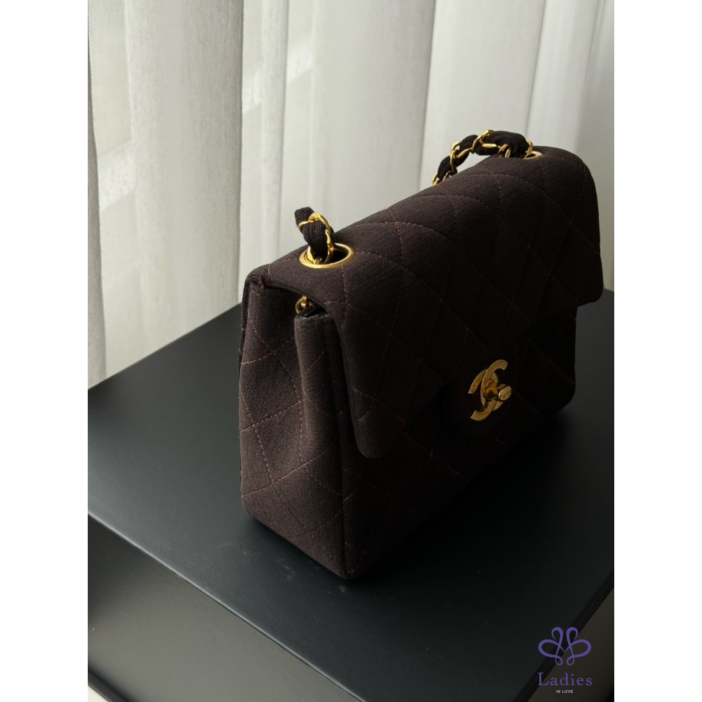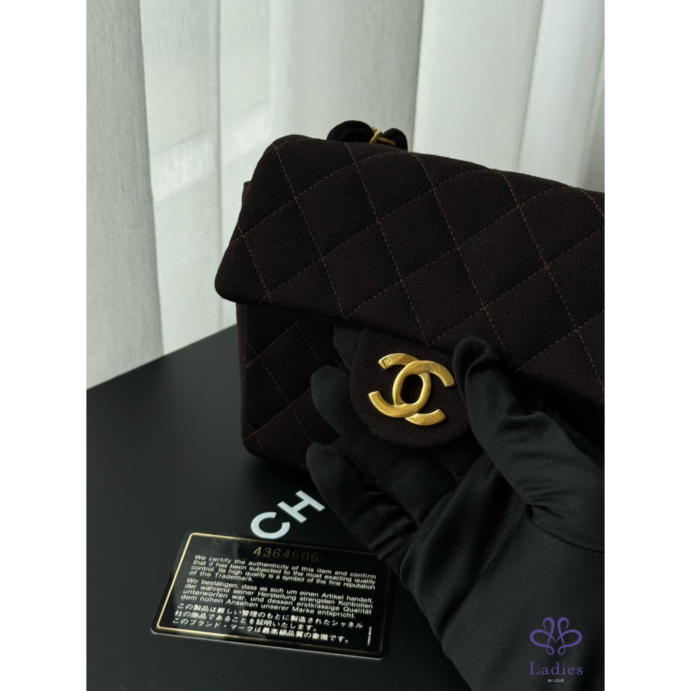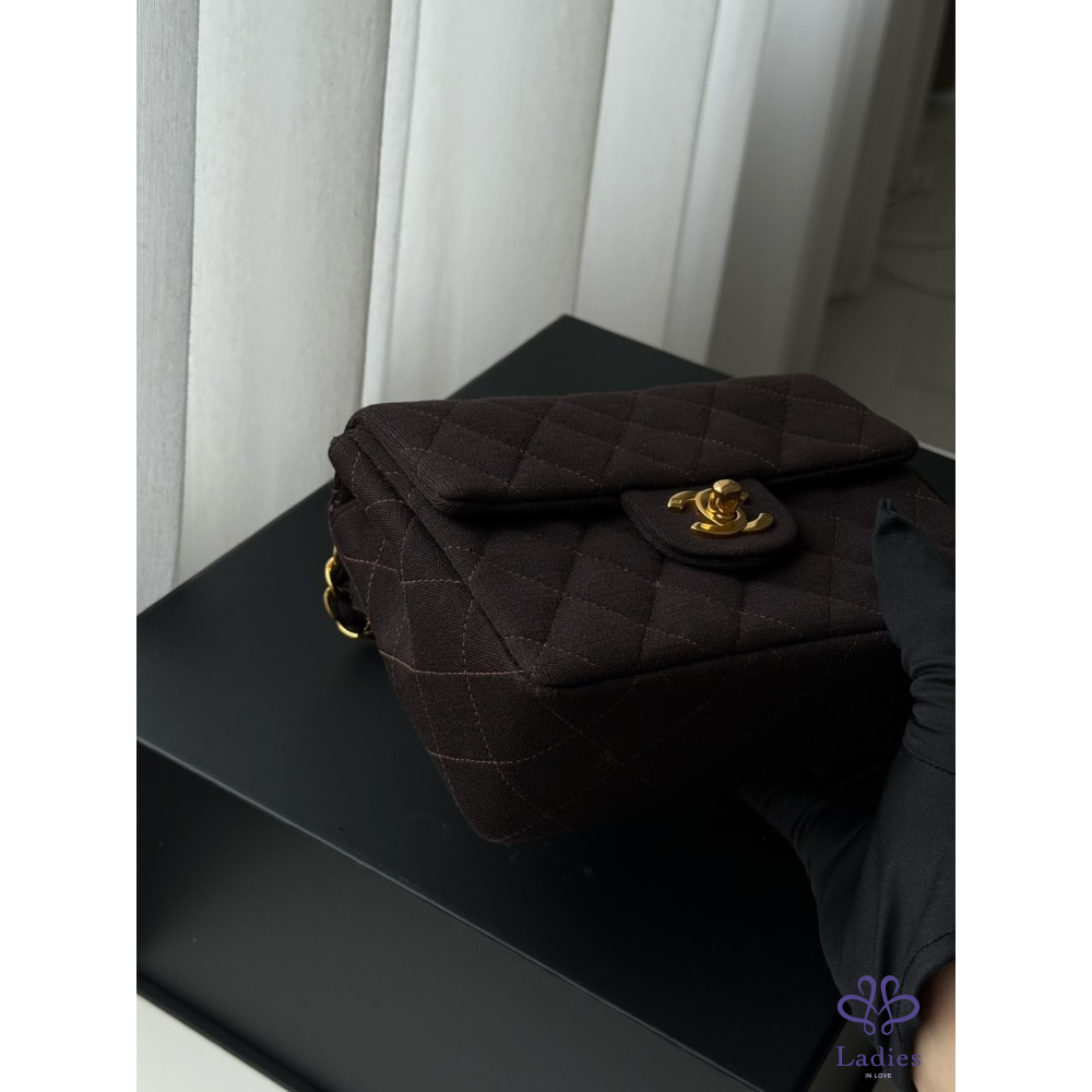 Chanel咖色金扣布面方胖