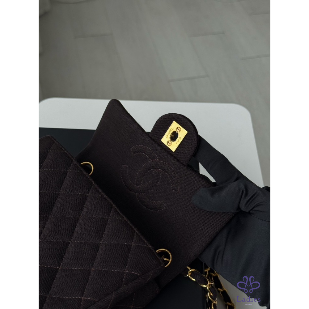 首頁 精品包包 Chanel咖色金扣布面方胖