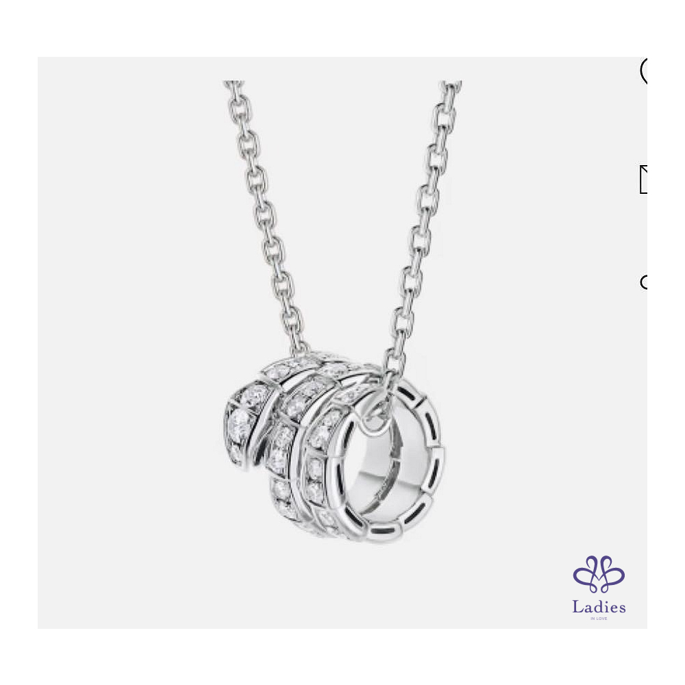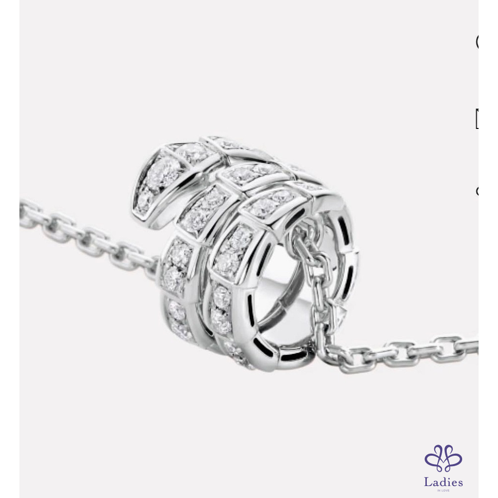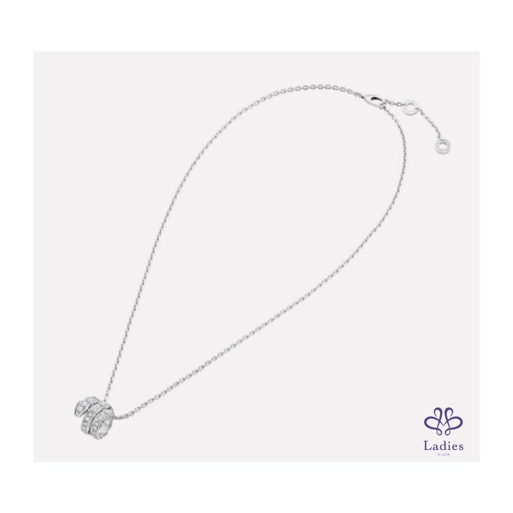Serpenti Viper靈蛇系列吊墜項鍊,18K 白金材質,飾以全密鑲鑽石,結合純粹美學、環狀造型和獨特魅力,巧妙詮釋變化無窮的寶格麗經典設計元素。這款迷人珠寶捕捉靈蛇不斷進化的強大本質,為配戴者帶來力量和自信,進而擁抱改變。易於混搭,提供無盡的風格選擇,體現此系列的百搭精神。