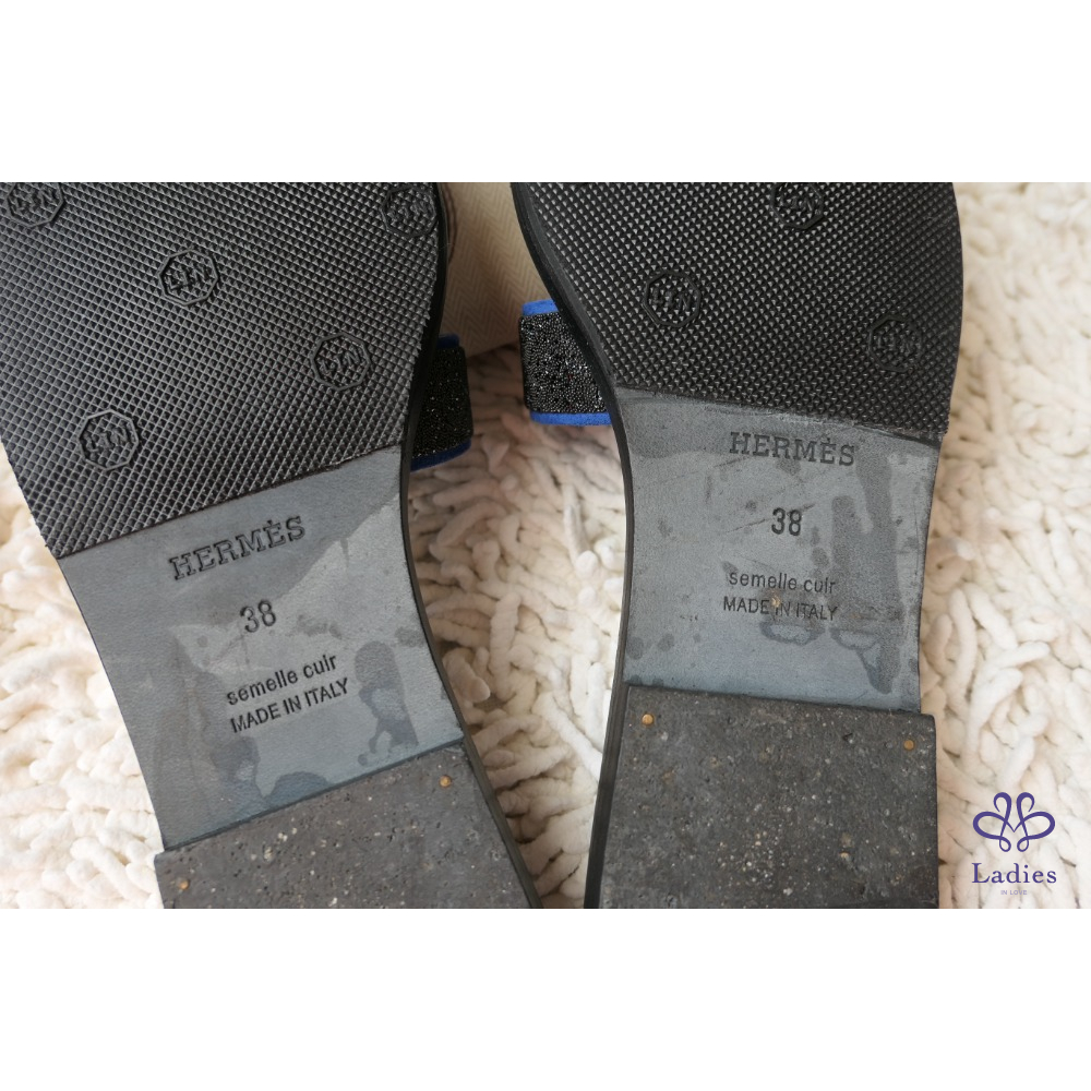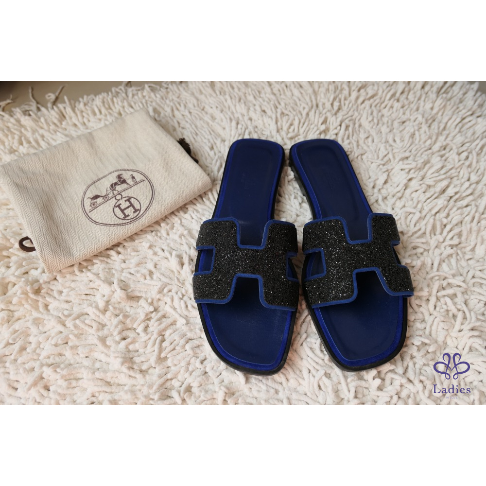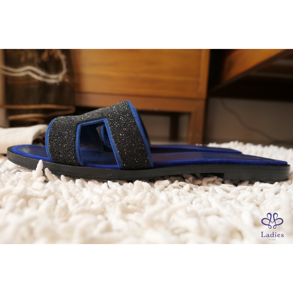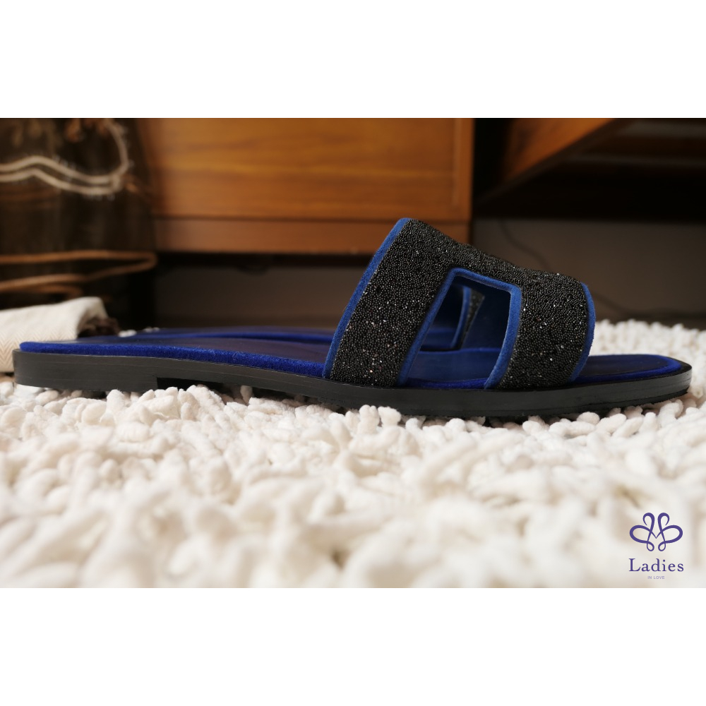 Hermes 愛馬仕 黑色水晶碎鑽X藍色皮革 Oran拖鞋 尺寸:38