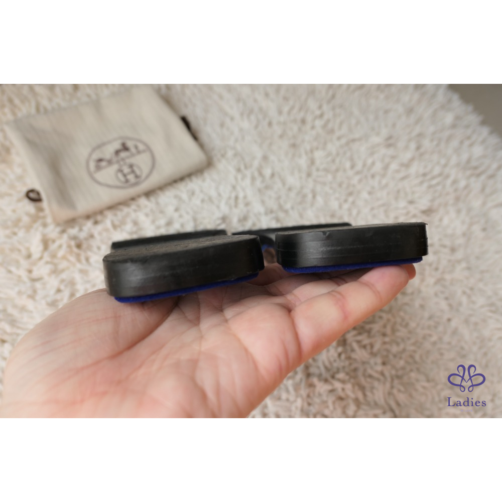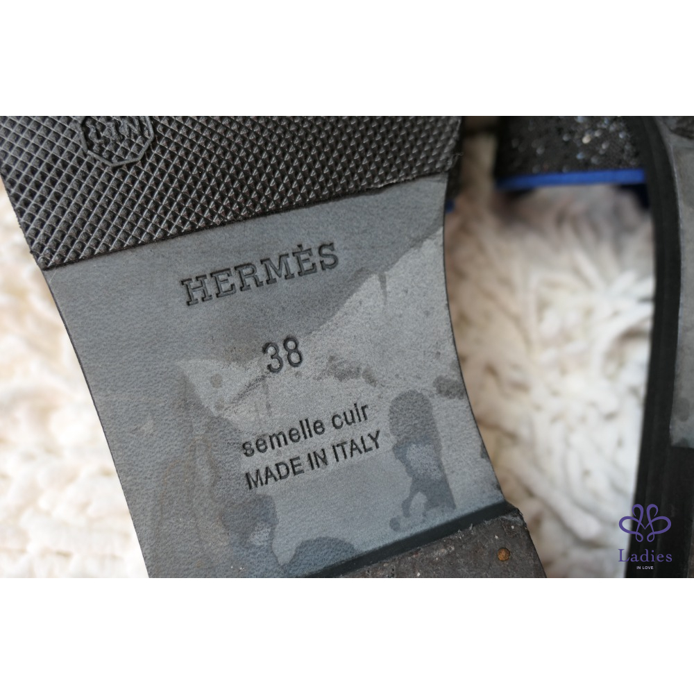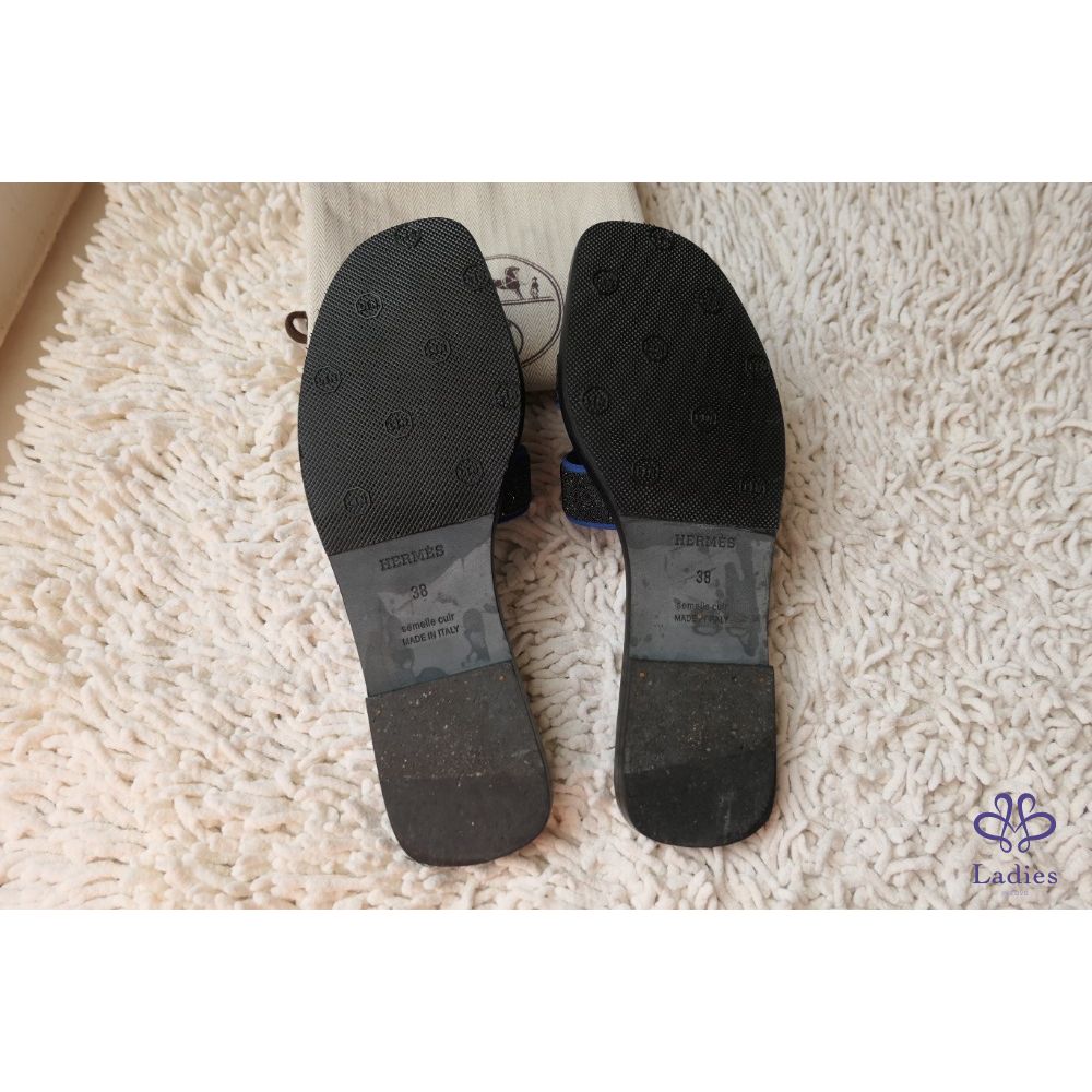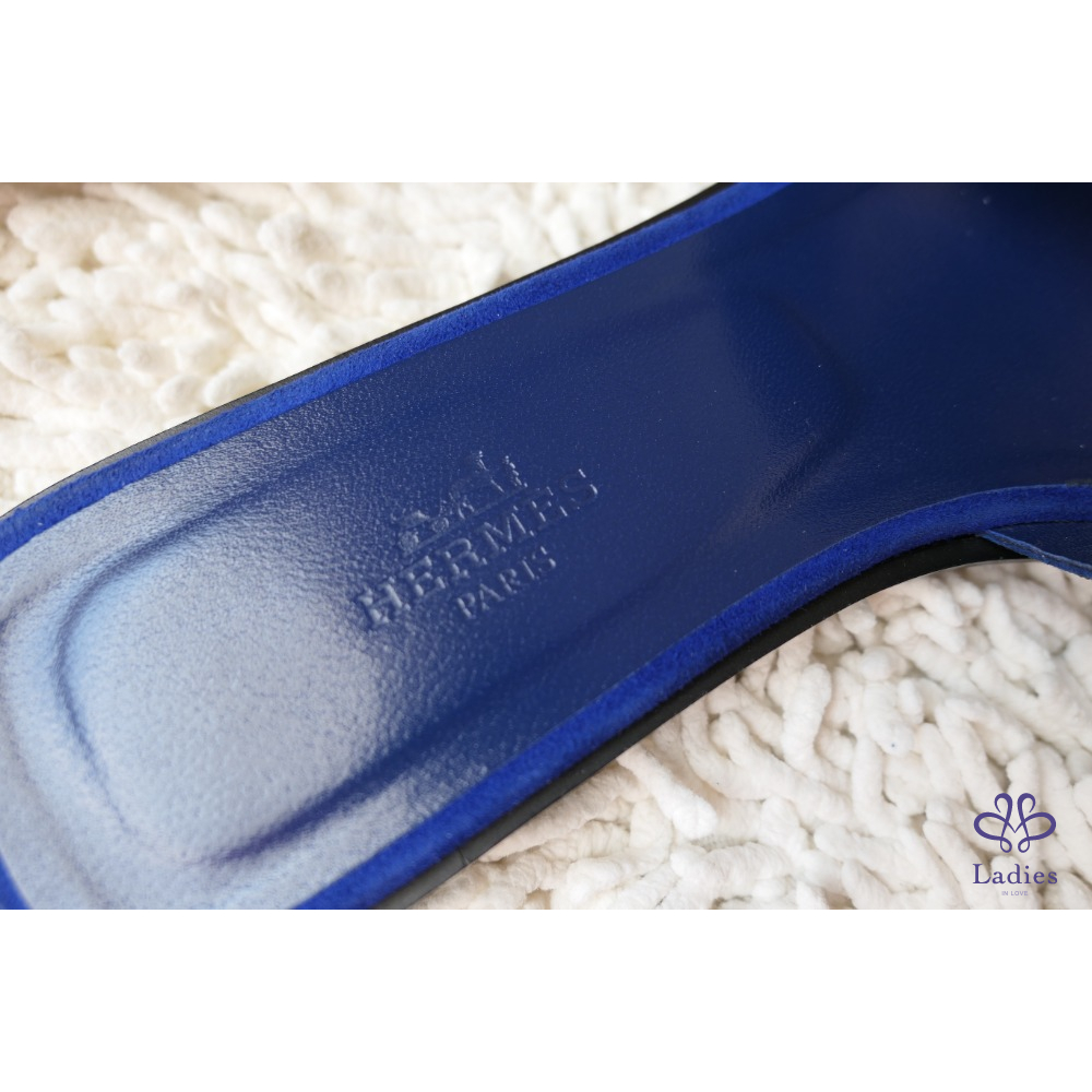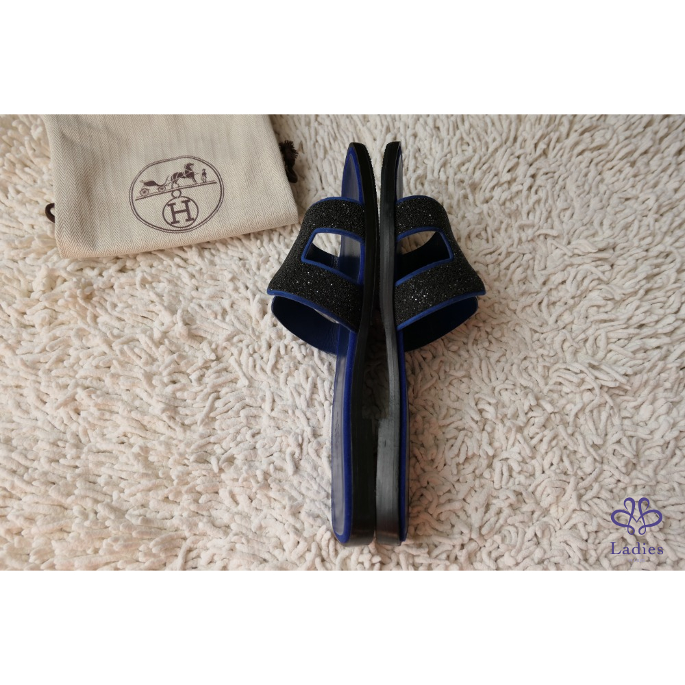Hermes 愛馬仕 黑色水晶碎鑽X藍色皮革 Oran拖鞋 尺寸:38