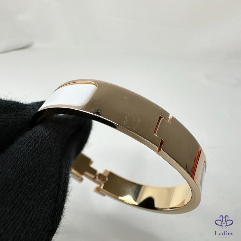 產品信息 【HERMES Clic H Logo琺瑯細版手環】 #愛馬仕白x金 經典火熱的Clic H系列,這款細版琺瑯手環,襯托纖細感 單帶就很好看,搭配手錶或是手鍊一起混搭 質感更升一級 整體品項約9成新,二手商品均有正常使用/存放痕跡 尺寸:PM,腕圍15cm | 寬度:12mm 附件:原廠盒、原廠紙袋、原廠防塵袋 #B113092704