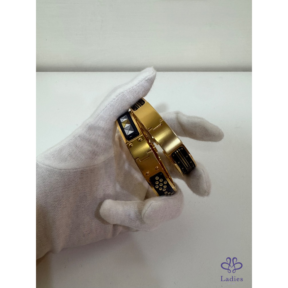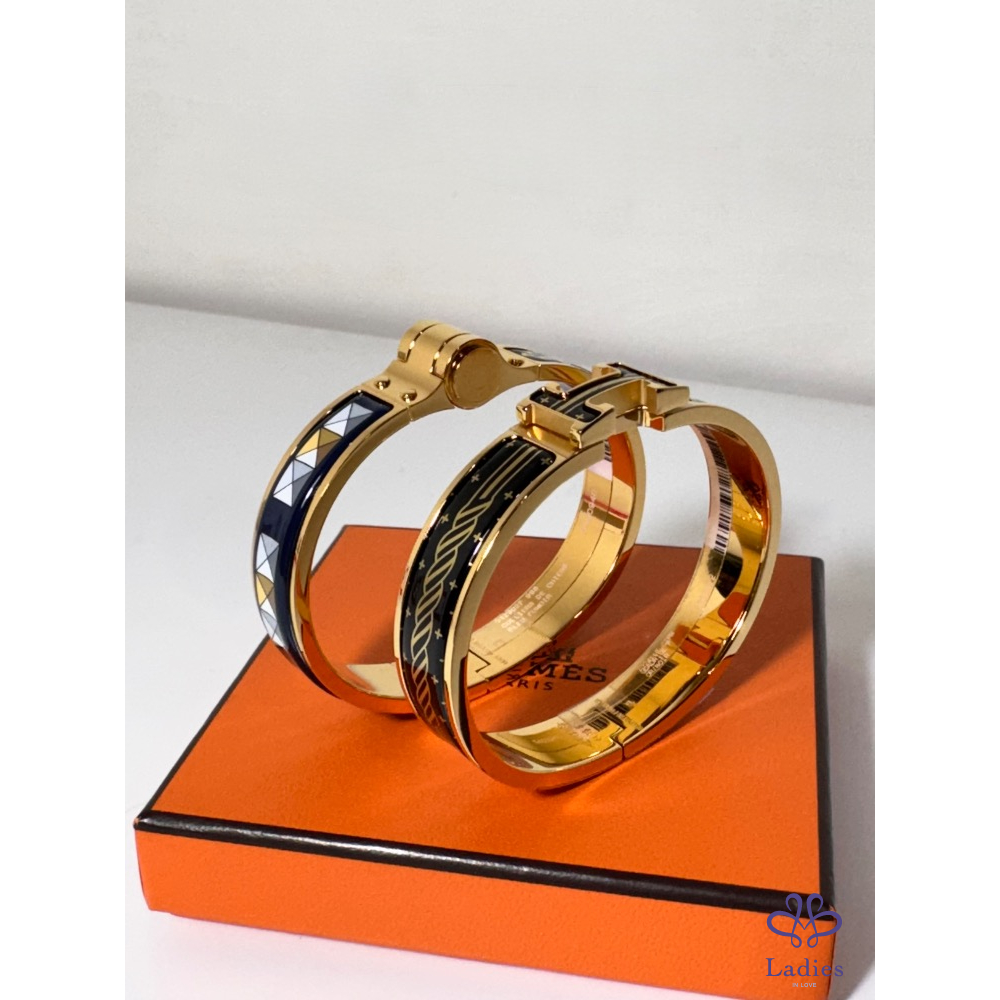 融合 Hermès 經典 Clic H 結構與絲巾圖騰 Quadrige Au Fil 印花,設計細膩有層次。亮面琺瑯與金屬飾邊完美融合,佩戴起來輕盈舒適,讓日常穿搭更添藝術氣息與法式格調。