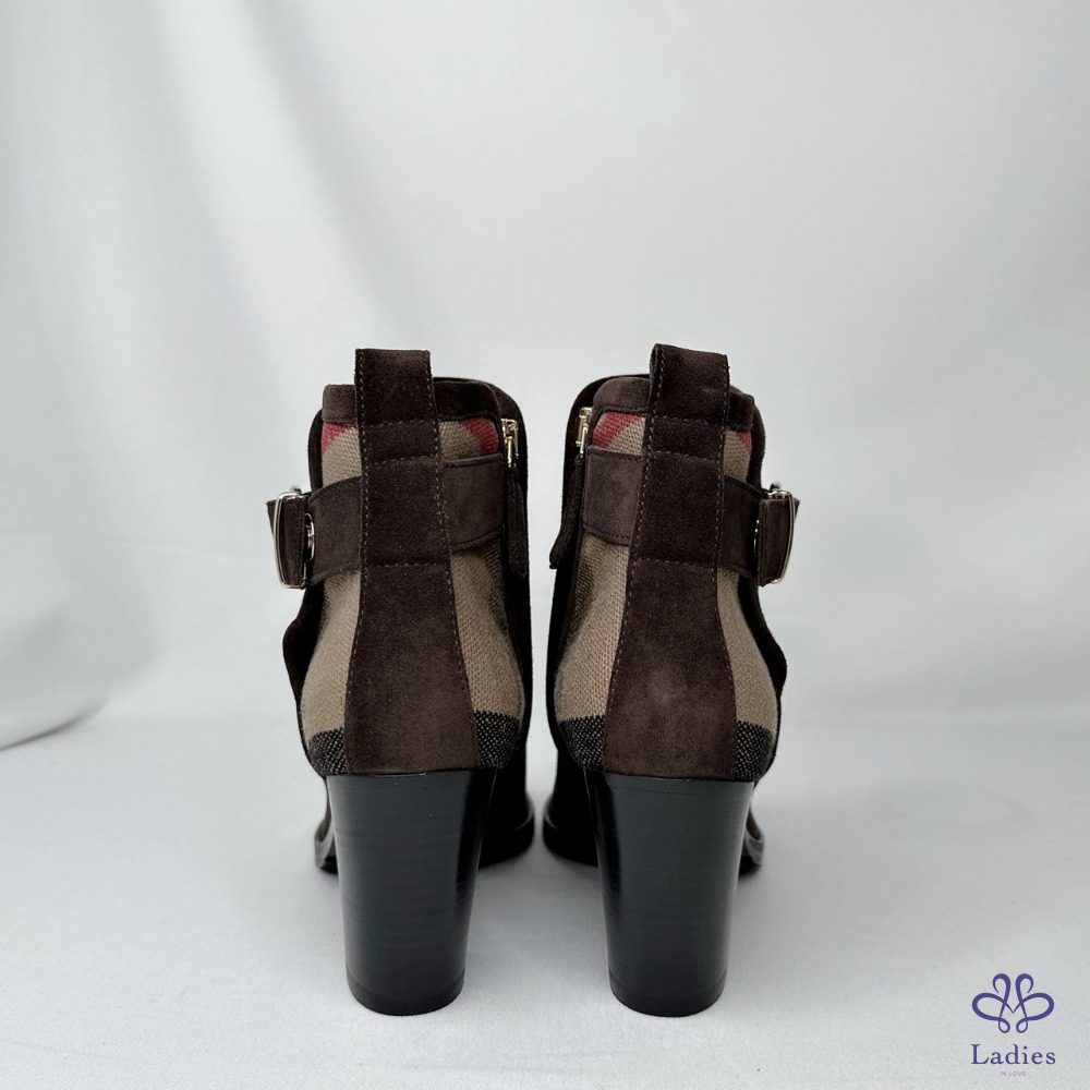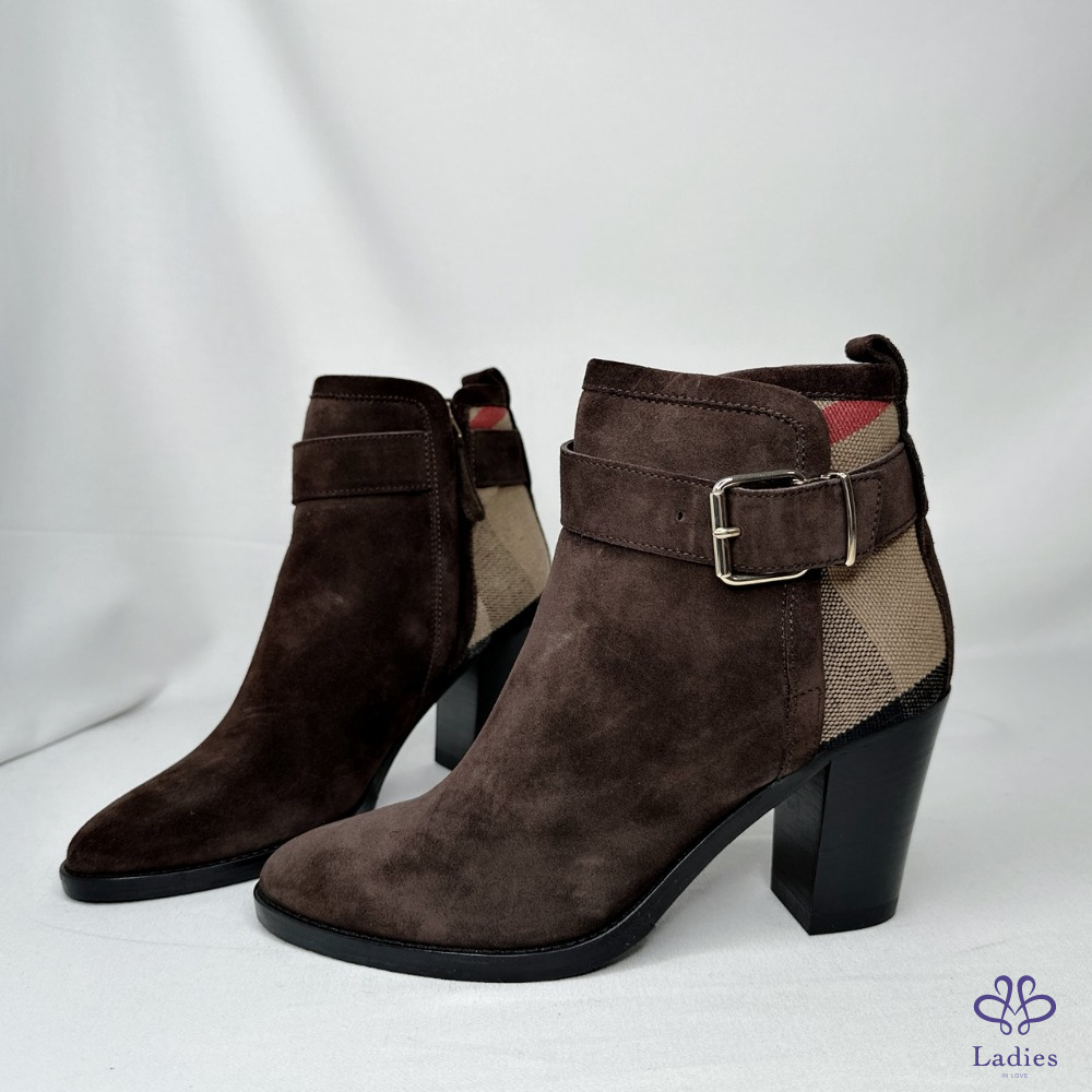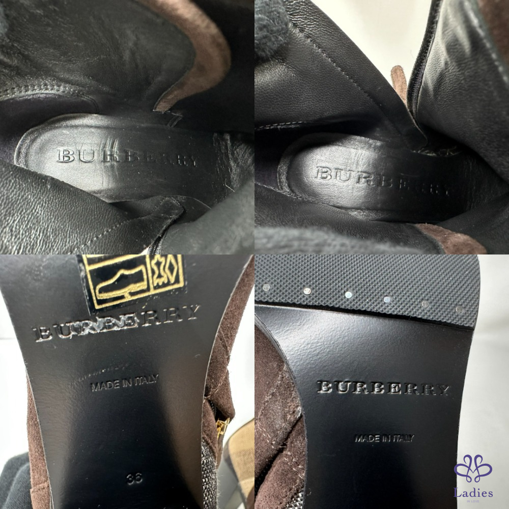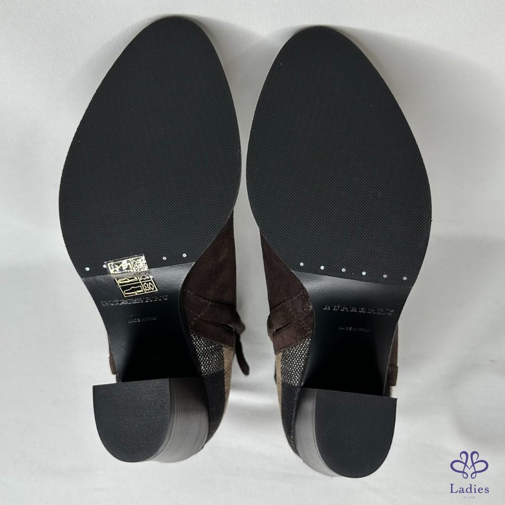 產品信息 【BURBERRY 帆布格紋拼絨面短靴】 #閒置未穿 及踝靴,選用柔軟反絨面革布料打造,拼接Burberry格紋裁片 採用粗高跟設計,融入馬術靈感扣環束帶 整體品項約9成7新,二手商品均有正常使用/存放痕跡 尺寸:36號,鞋跟高:7cm 筒高:11cm 附件:無 #B114052311