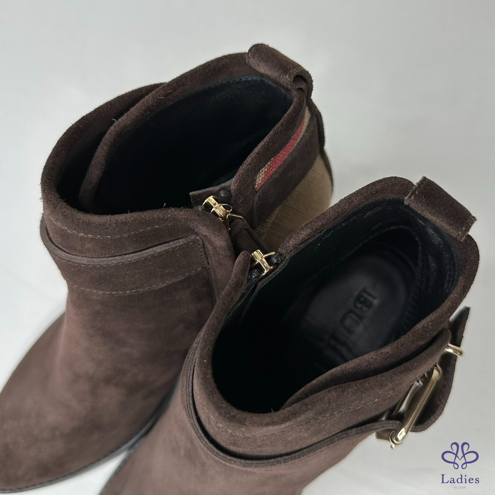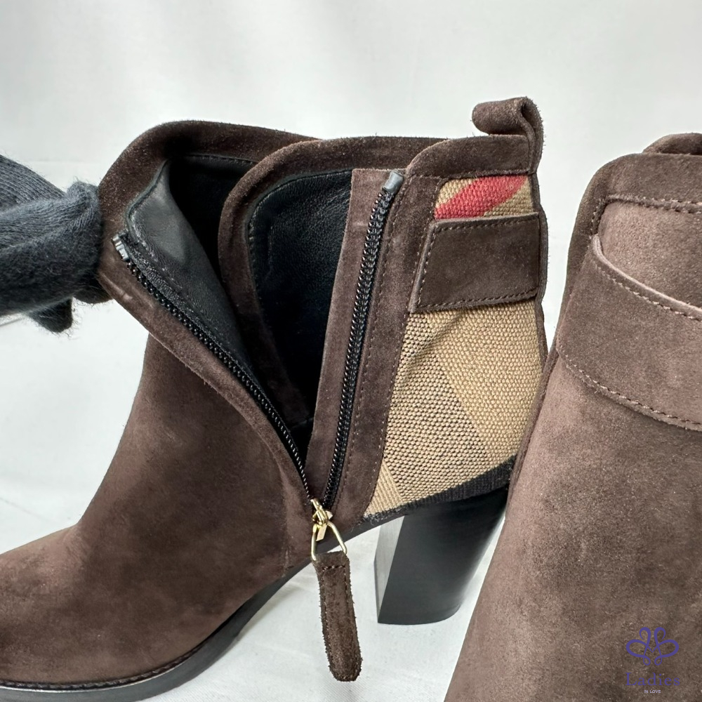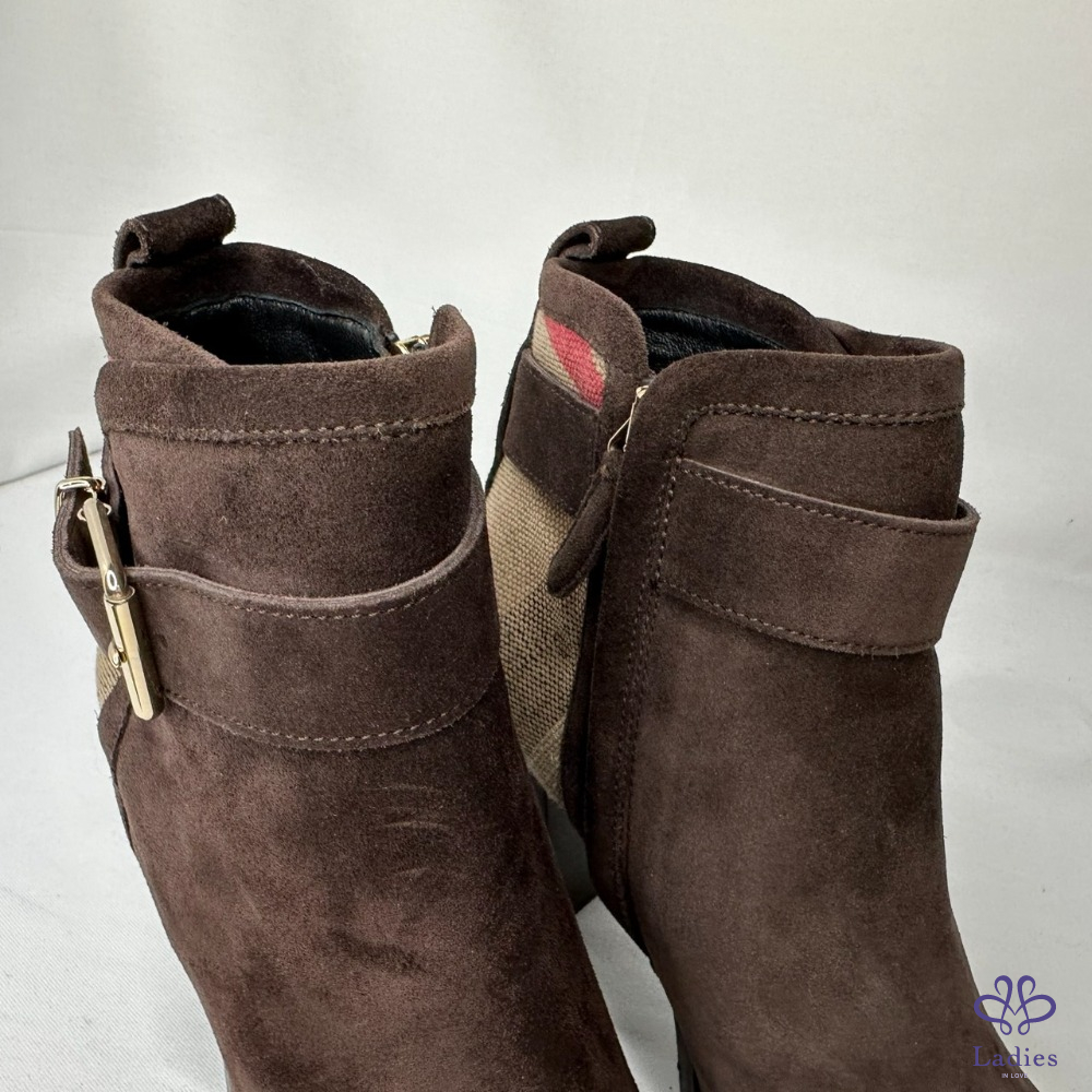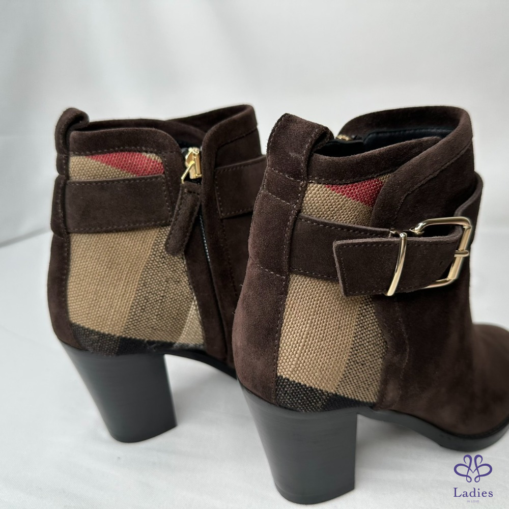 產品信息 【BURBERRY 帆布格紋拼絨面短靴】 #閒置未穿 及踝靴,選用柔軟反絨面革布料打造,拼接Burberry格紋裁片 採用粗高跟設計,融入馬術靈感扣環束帶 整體品項約9成7新,二手商品均有正常使用/存放痕跡 尺寸:36號,鞋跟高:7cm 筒高:11cm 附件:無 #B114052311
