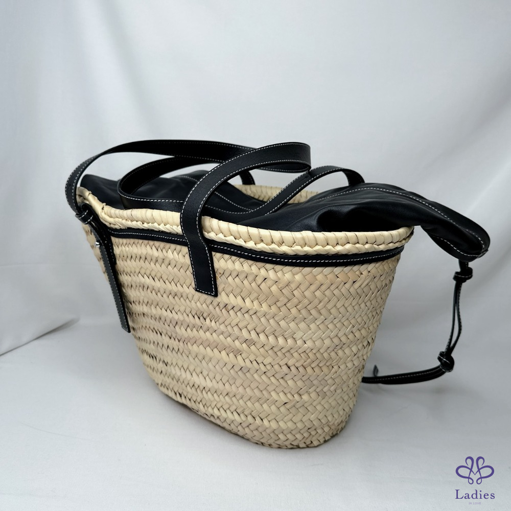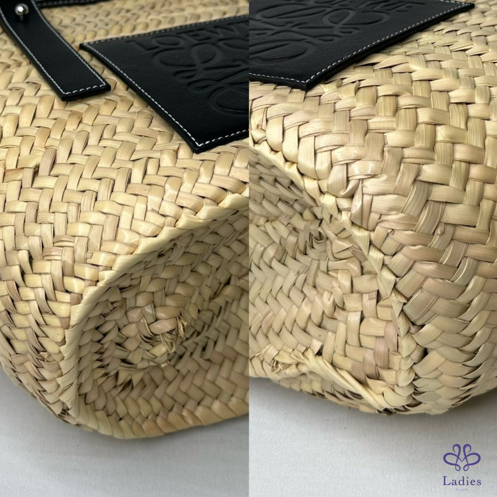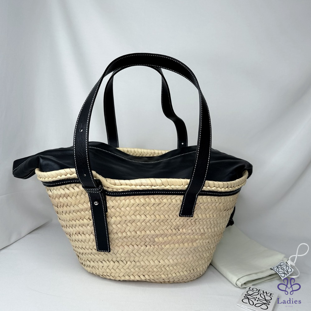 產品信息 【LOEWE 中號皮革草編籃子包】 #超人氣草編包閒置極新 #專櫃價近6萬重點這裡非常平價 手工編織棕櫚葉籃子配有帶拉鍊的黑色小牛皮內袋 網美照怎麼搭都好看 輕鬆渡假感 #有幾處原廠溢膠均不影響使用 整體包況約9成5新,二手商品均有正常使用/存放痕跡 尺寸:底26.5、上42x25x16cm 附件:原廠防塵袋、說明書 #B114050708
