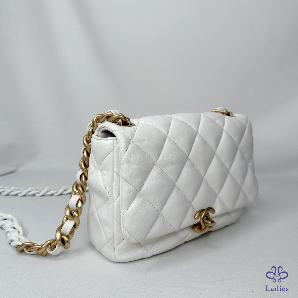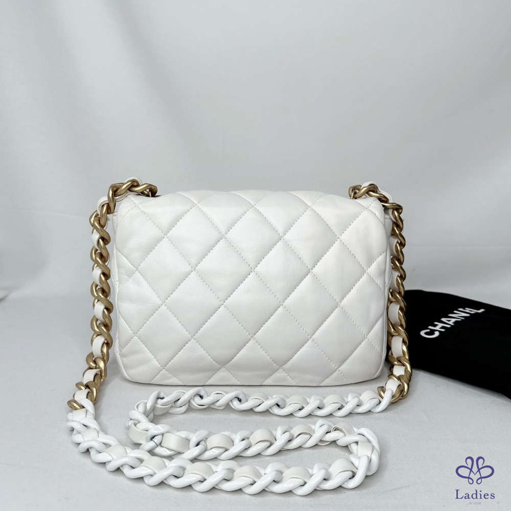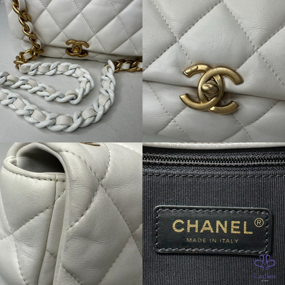 產品信息 【CHANEL 陶瓷拼金鏈小羊皮斜背包】 做舊復古金配上雪白小羊皮,白月光好百搭 包身澎軟,皮穿鏈銜接陶瓷粗鍊帶,清新時尚 整體包況約9成新,二手商品均有正常使用/存放痕跡 型號:AS3206 尺寸:22x15x6.5cm 附件:原廠防塵袋 #B114050201