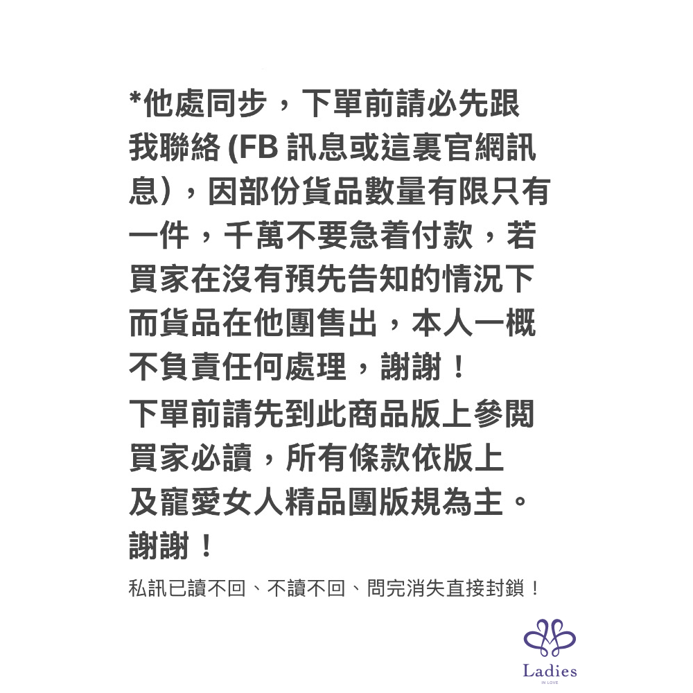 下單前請先到此商品版上參閲買家必讀,所有條款依版上及寵愛女人精品團版規為主。謝謝!