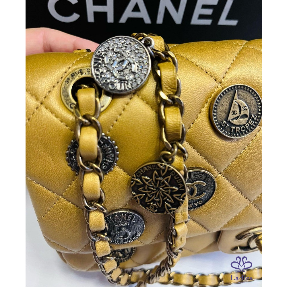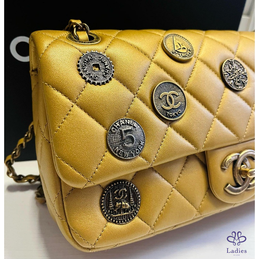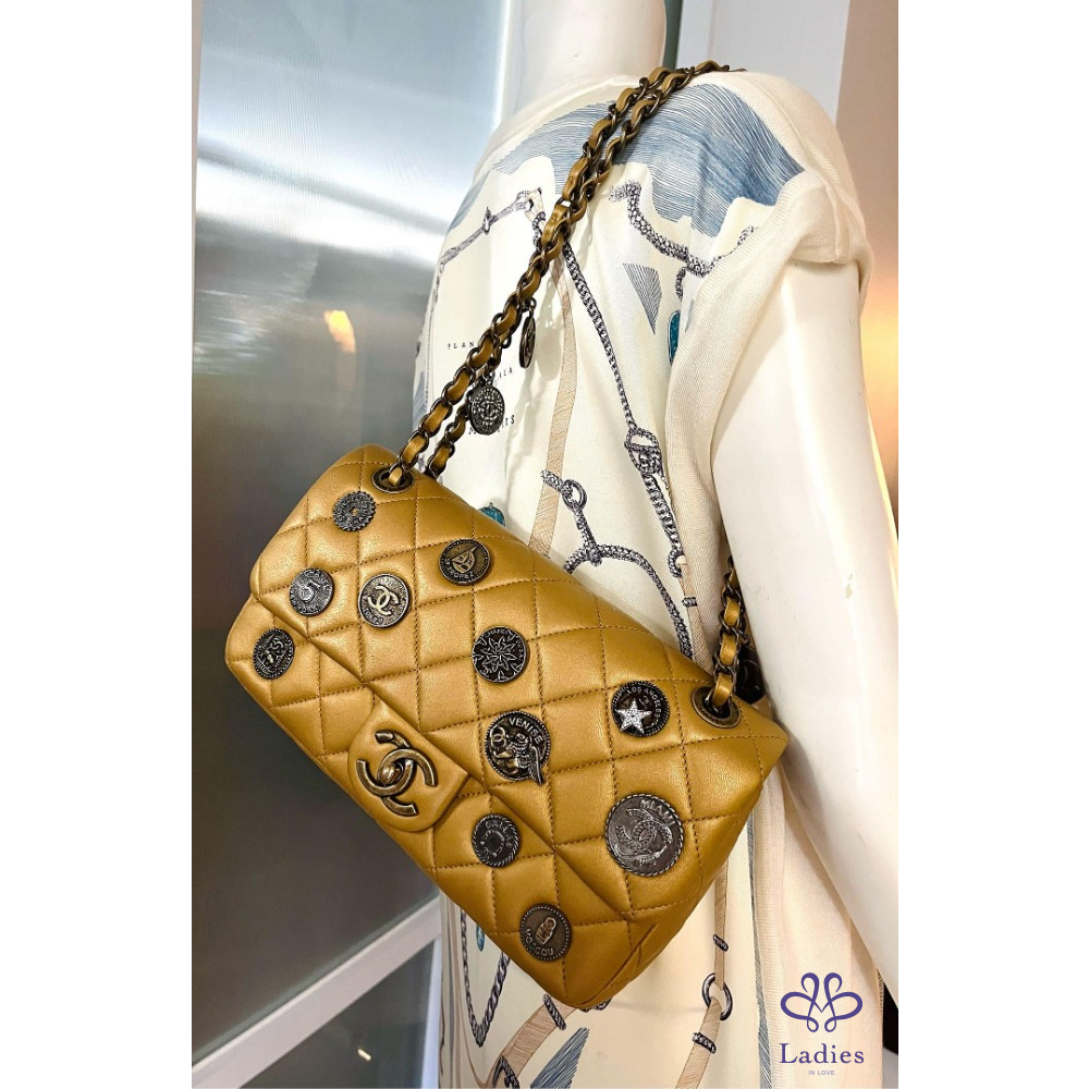 產品信息 全新商品,法國巴黎香奈兒專賣店購買,當時購買價退稅後約台幣$20萬元。徽章包是香奈兒的特殊產品,全部都是皮質手工縫製,而且每個徽章的樣子都不同,非常像背著一個特殊的古幣和擁有著香奈兒傳統著象徵。當時台灣的售價約是$28萬元。這個本來是我的收藏款,所以從未使用過,但是背面面有一點點的壓痕,如圖六所示,如果介意者,請勿購買。包包的尺寸為:6×15×25.5公分,附原廠盒子、保證卡、防塵袋。保證真品。