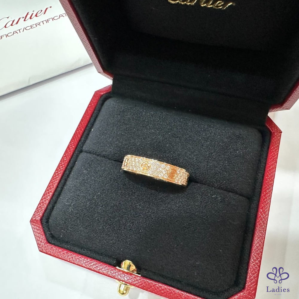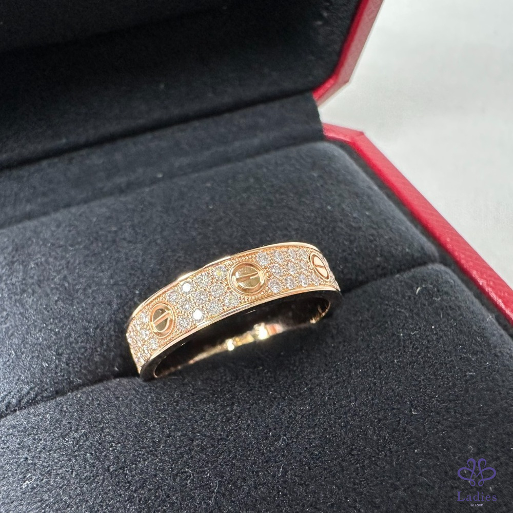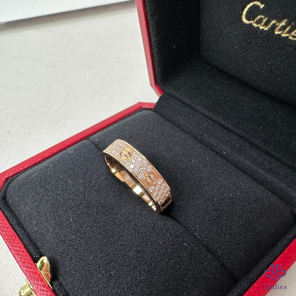 產品信息 【Cartier LOVE 18K滿天星玫瑰金男戒】 #專櫃價25萬 #4月離櫃實品美到炸裂 LOVE婚戒,小型款,750/1000玫瑰金 鑲嵌88顆共重0.31克拉的圓形明亮式切割鑽石 整體品項約9成8新,二手商品均有正常使用/存放痕跡 型號:B4085857 尺寸:卡地亞57號/國際圍14/內直徑1.8cm,寬度4到5mm 附件:原廠內外盒、原廠證書、加贈查碼圖 #B114052703