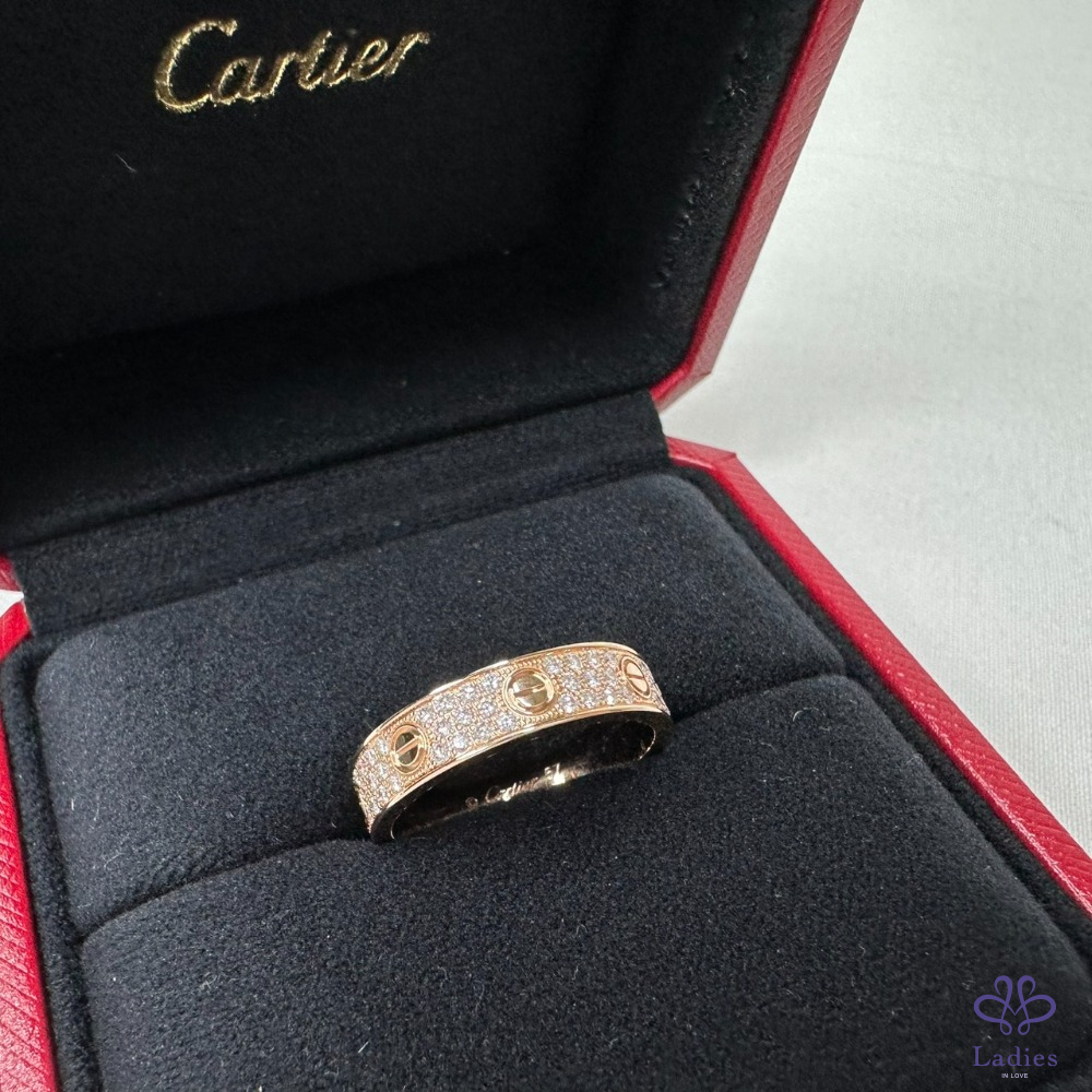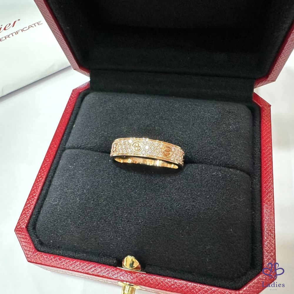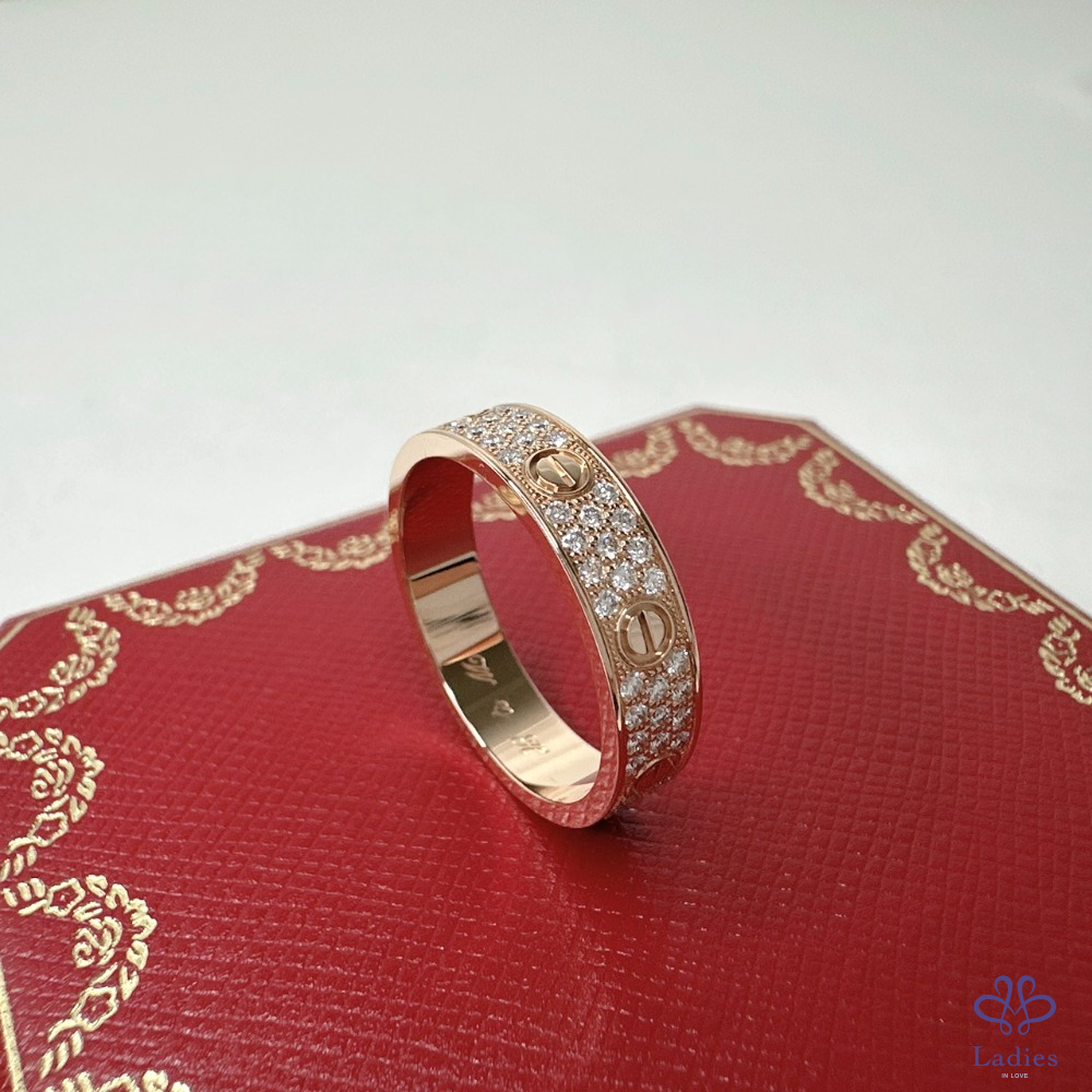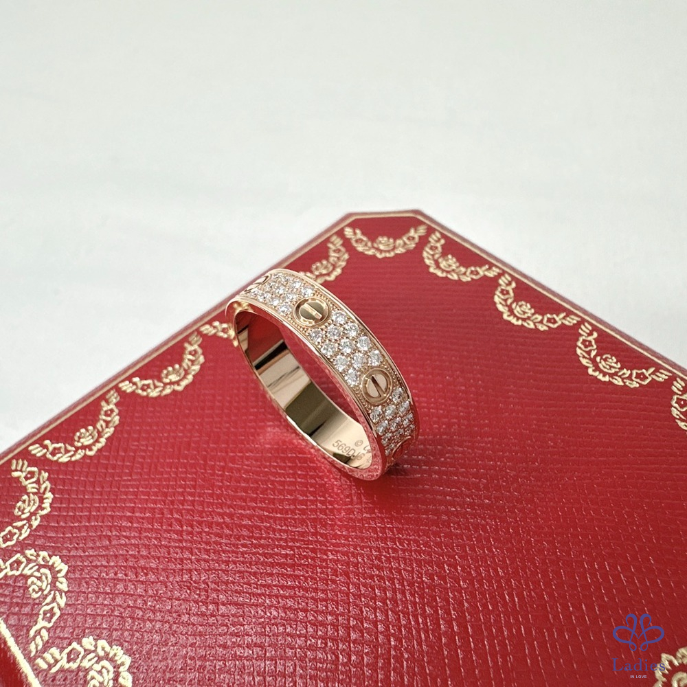 產品信息 【Cartier LOVE 18K滿天星玫瑰金男戒】 #專櫃價25萬 #4月離櫃實品美到炸裂 LOVE婚戒,小型款,750/1000玫瑰金 鑲嵌88顆共重0.31克拉的圓形明亮式切割鑽石 整體品項約9成8新,二手商品均有正常使用/存放痕跡 型號:B4085857 尺寸:卡地亞57號/國際圍14/內直徑1.8cm,寬度4到5mm 附件:原廠內外盒、原廠證書、加贈查碼圖 #B114052703