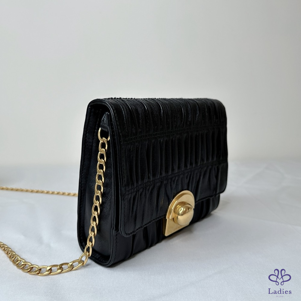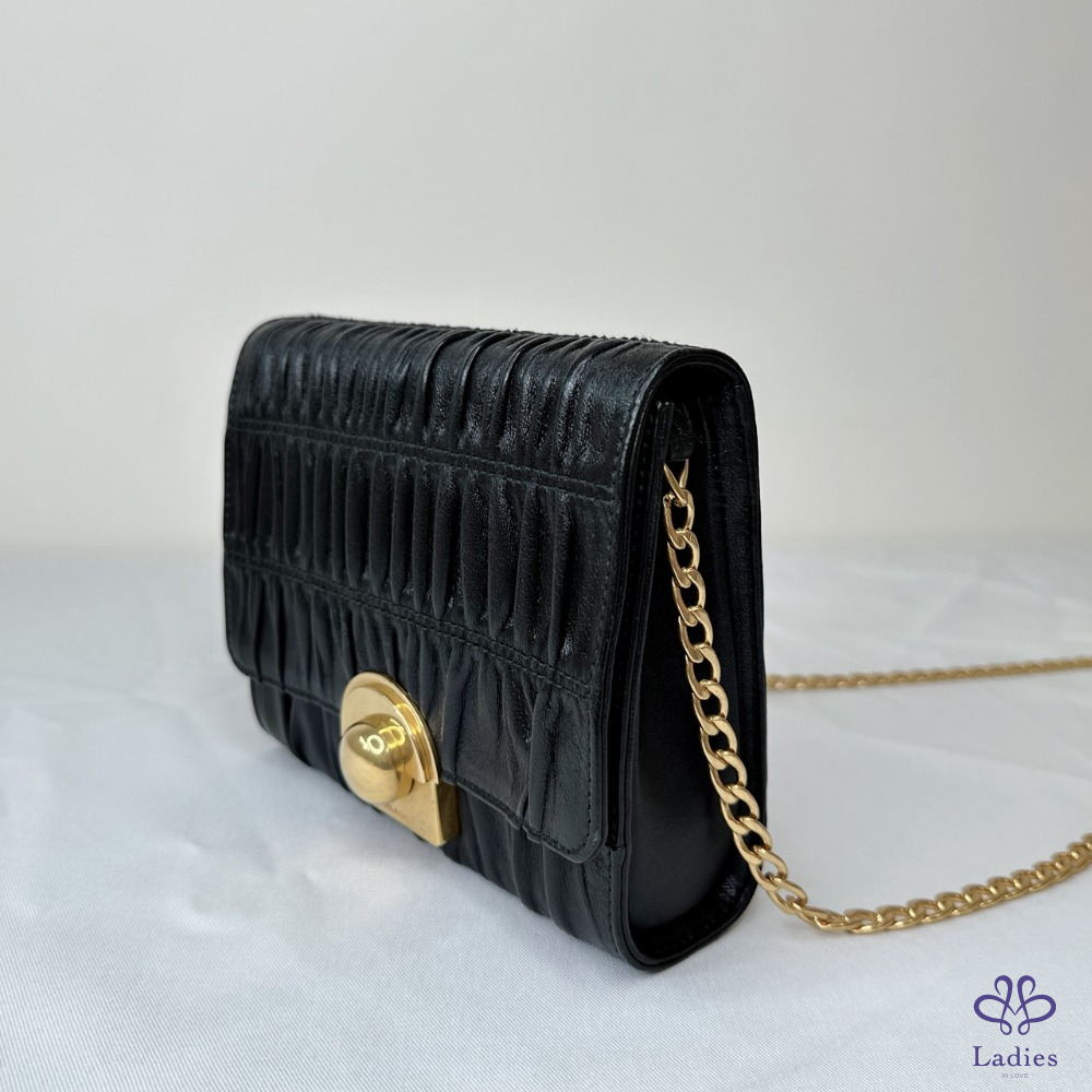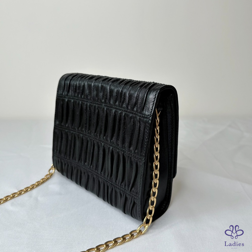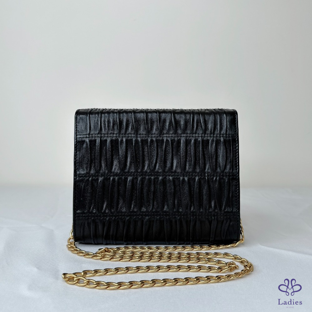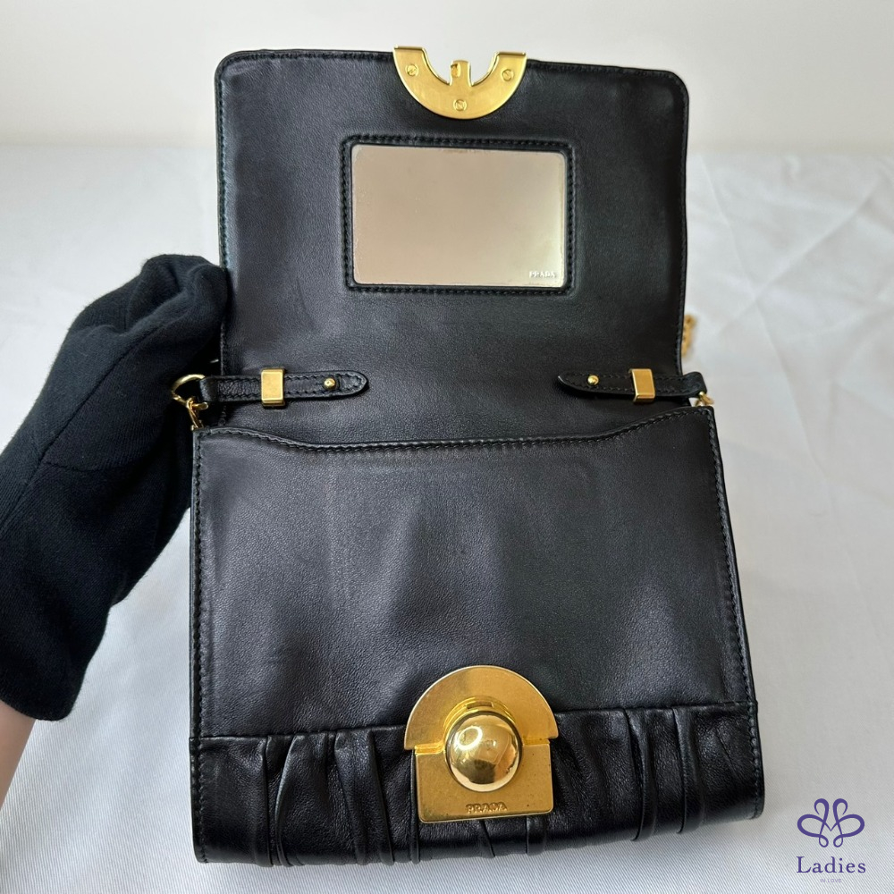 產品信息 【PRADA 抓皺NAPPA皮鏈條包】 經典的Prada百褶設計,配上高貴的做舊金屬撘扣 內有小鏡子 散發精緻女孩感 整體包況約9成新,二手商品均有正常使用/存放痕跡 型號:1BH007 尺寸:18x15x4cm 附件:無 #B114052304