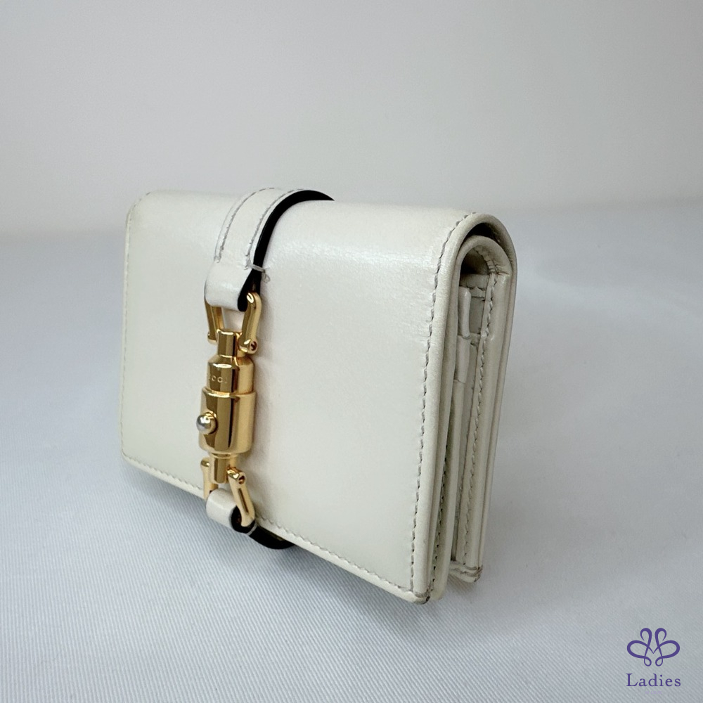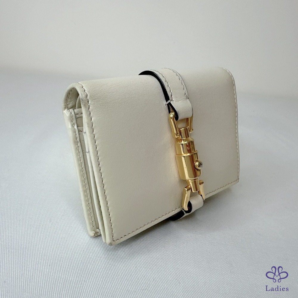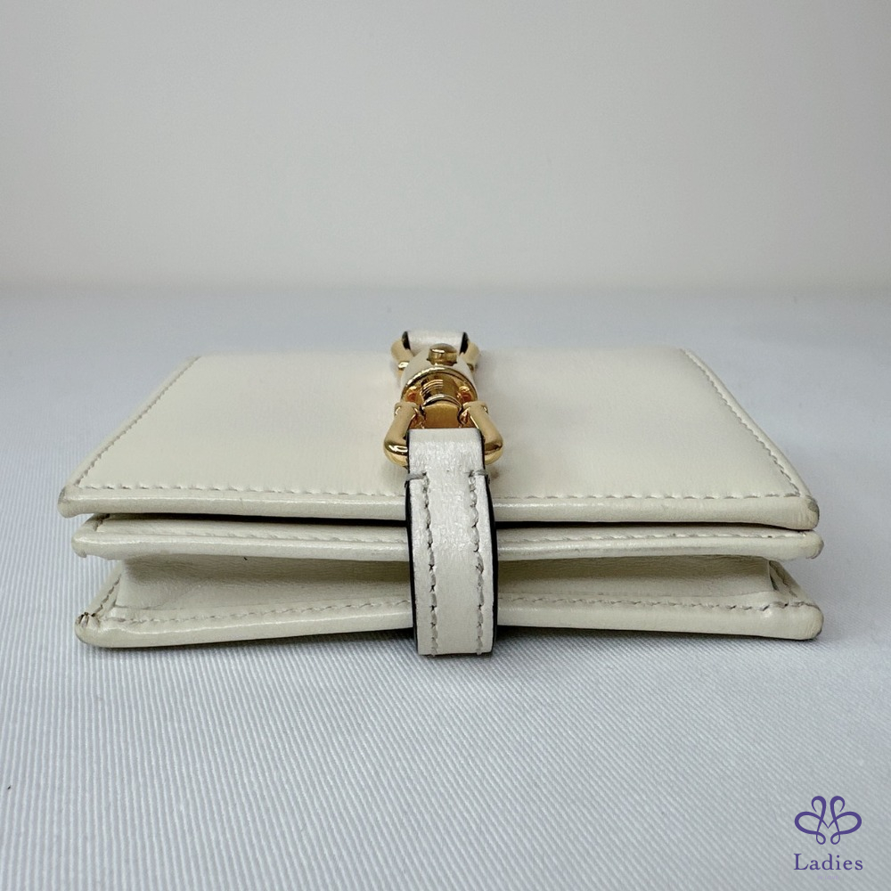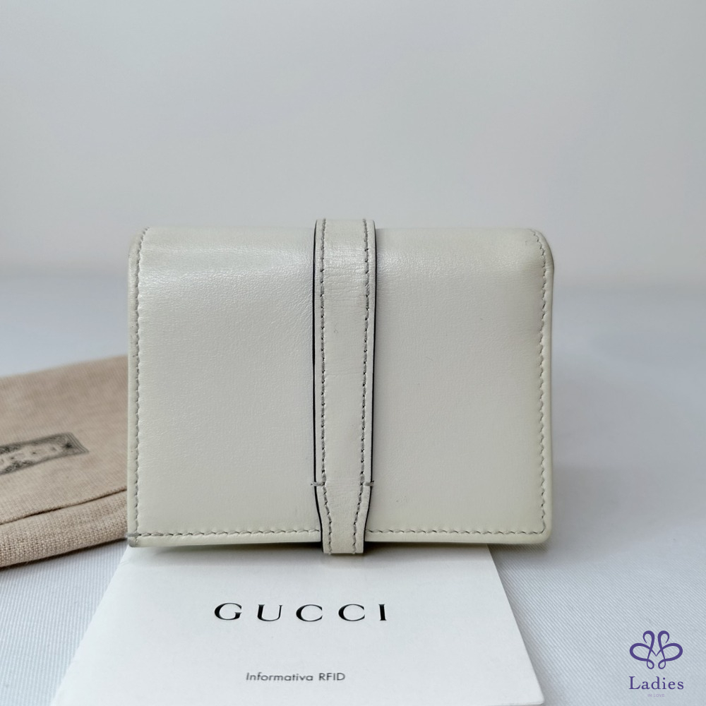 產品信息 【GUCCI Jackie 1961象牙白短夾】 以精緻的象牙白皮革打造,正面飾有金色活塞鎖扣設計 5個卡夾層/1個鈔票層/1個拉鍊袋/1個開放式口袋 整體包況新舊如圖,二手商品均有正常使用/存放痕跡 型號:645536 尺寸:11x8.5x3cm 附件:原廠防塵袋、說明書 #B114050208