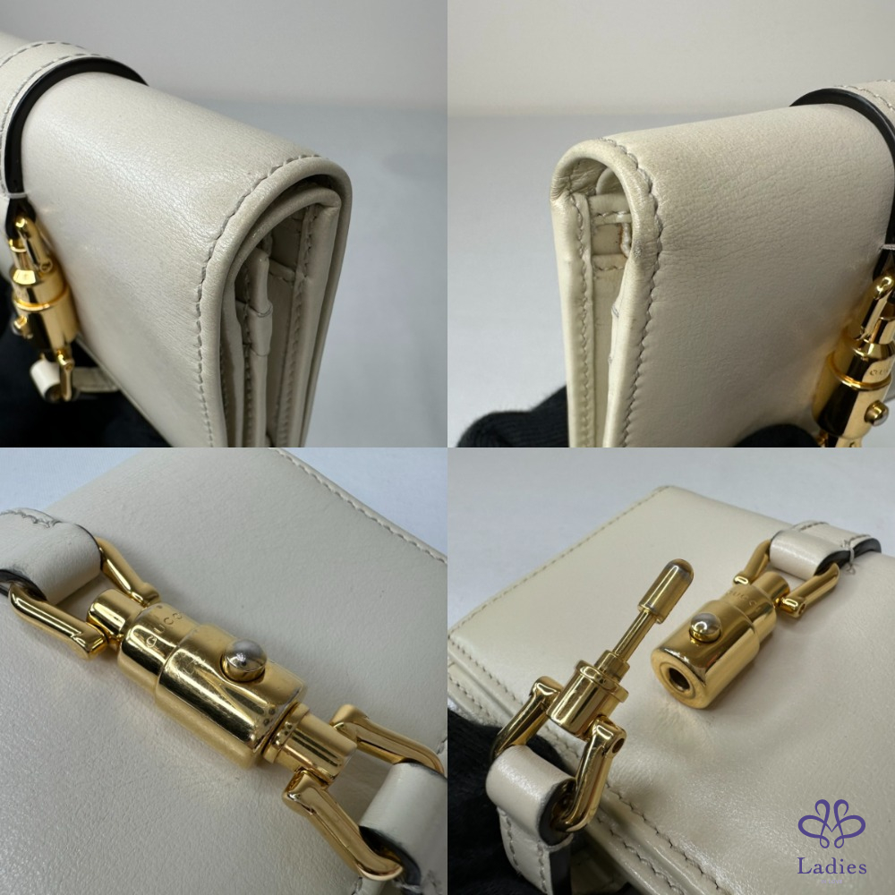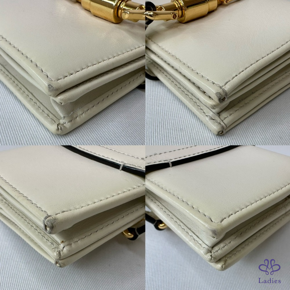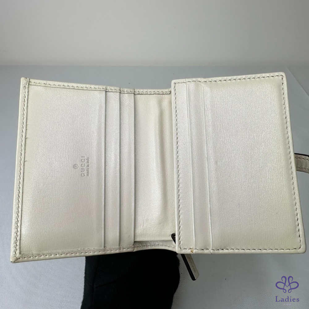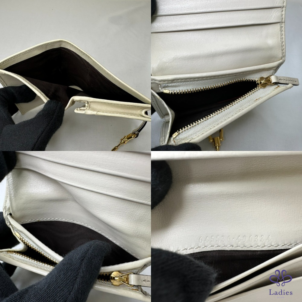 產品信息 【GUCCI Jackie 1961象牙白短夾】 以精緻的象牙白皮革打造,正面飾有金色活塞鎖扣設計 5個卡夾層/1個鈔票層/1個拉鍊袋/1個開放式口袋 整體包況新舊如圖,二手商品均有正常使用/存放痕跡 型號:645536 尺寸:11x8.5x3cm 附件:原廠防塵袋、說明書 #B114050208
