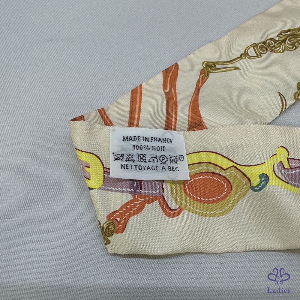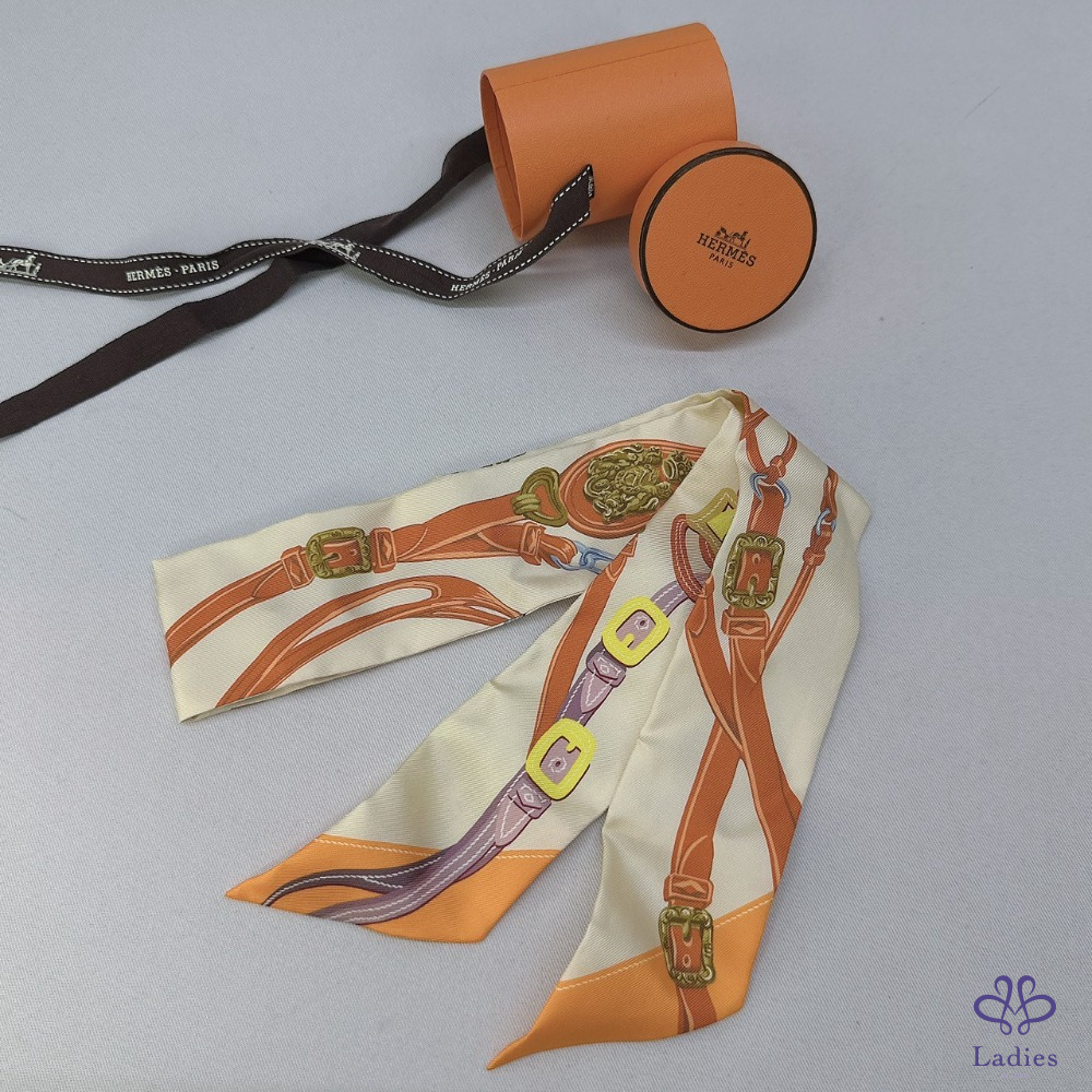 產品信息 【HERMES 全新Twilly馬術意象絲巾】 #離櫃全新無使用僅拍照 以馬具圖騰為主題 搭配溫潤米色與橘色系🧡 展現品牌中的經典馬術精神🐎 ⚜️整體品項9成9新,二手商品均有正常使用/存放痕跡 ⚜️尺寸:856cm ⚜️附件:盒子、緞帶 #A114051211