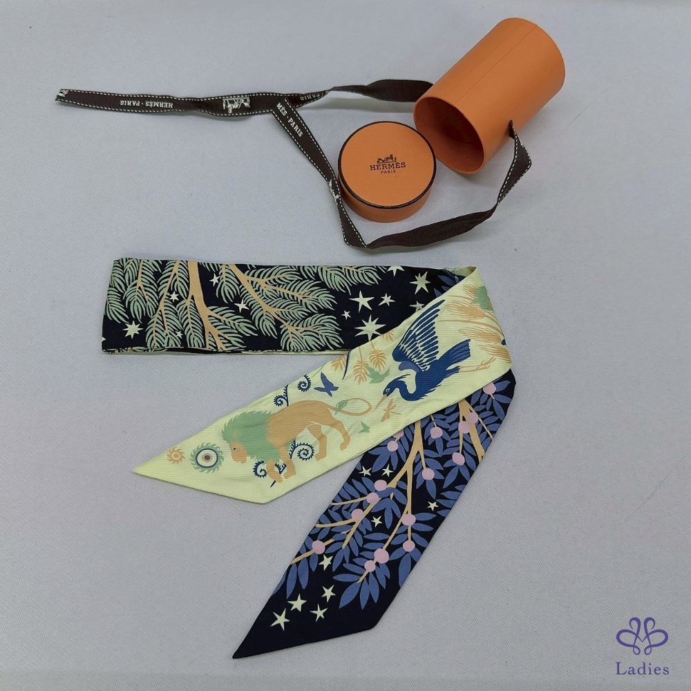 產品信息 【HERMES 全新Twilly瑪雅叢林絲巾】 #離櫃全新無使用僅拍照 雙面圖案設計,結合星空、樹林與野生動物元素 可作髮飾、腕繩或包包配件 適合多種搭配方式 ⚜️整體品項9成9新,二手商品均有正常使用/存放痕跡 ⚜️尺寸:856cm ⚜️附件:緞帶、盒子 #A114051210