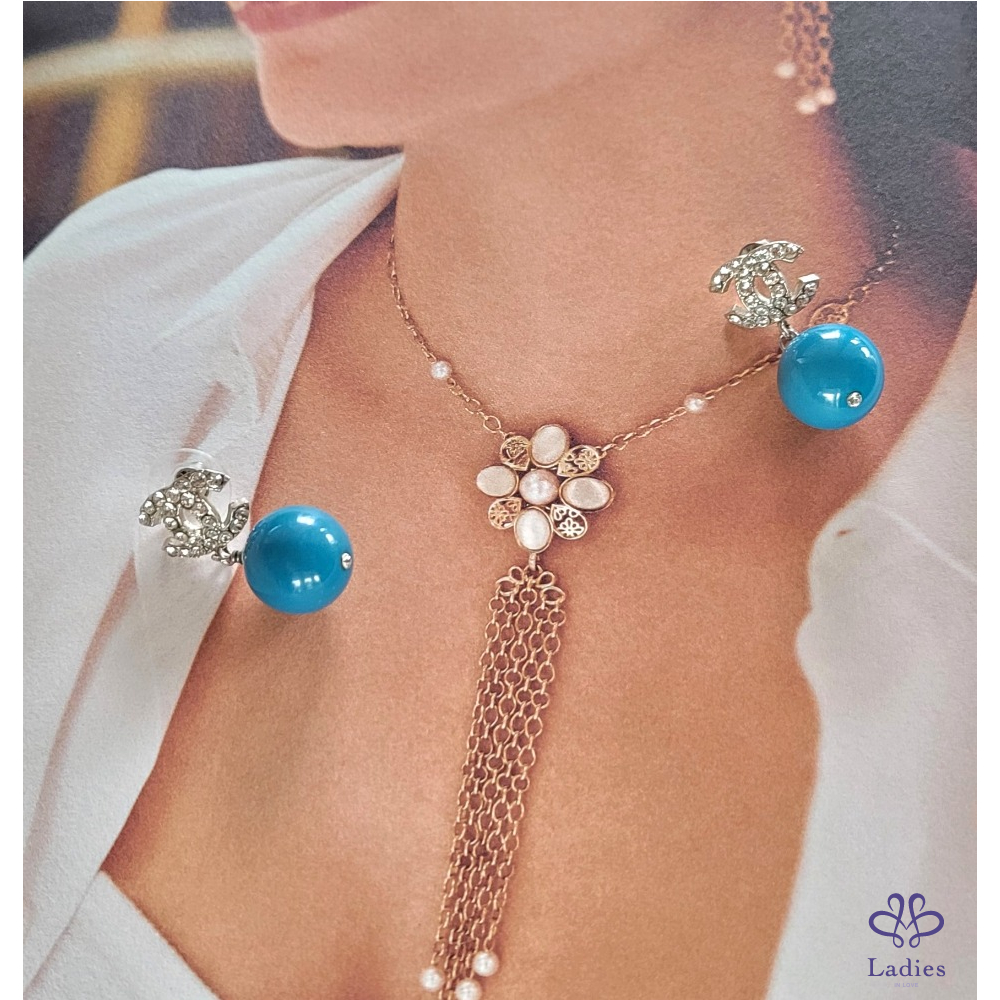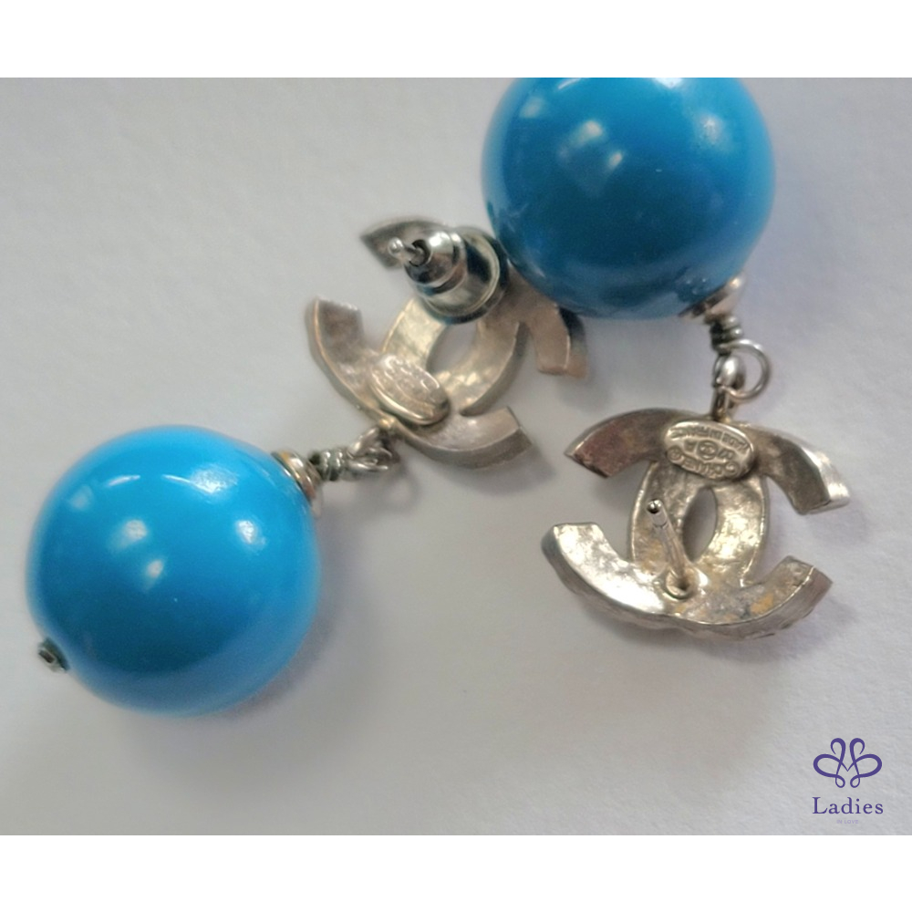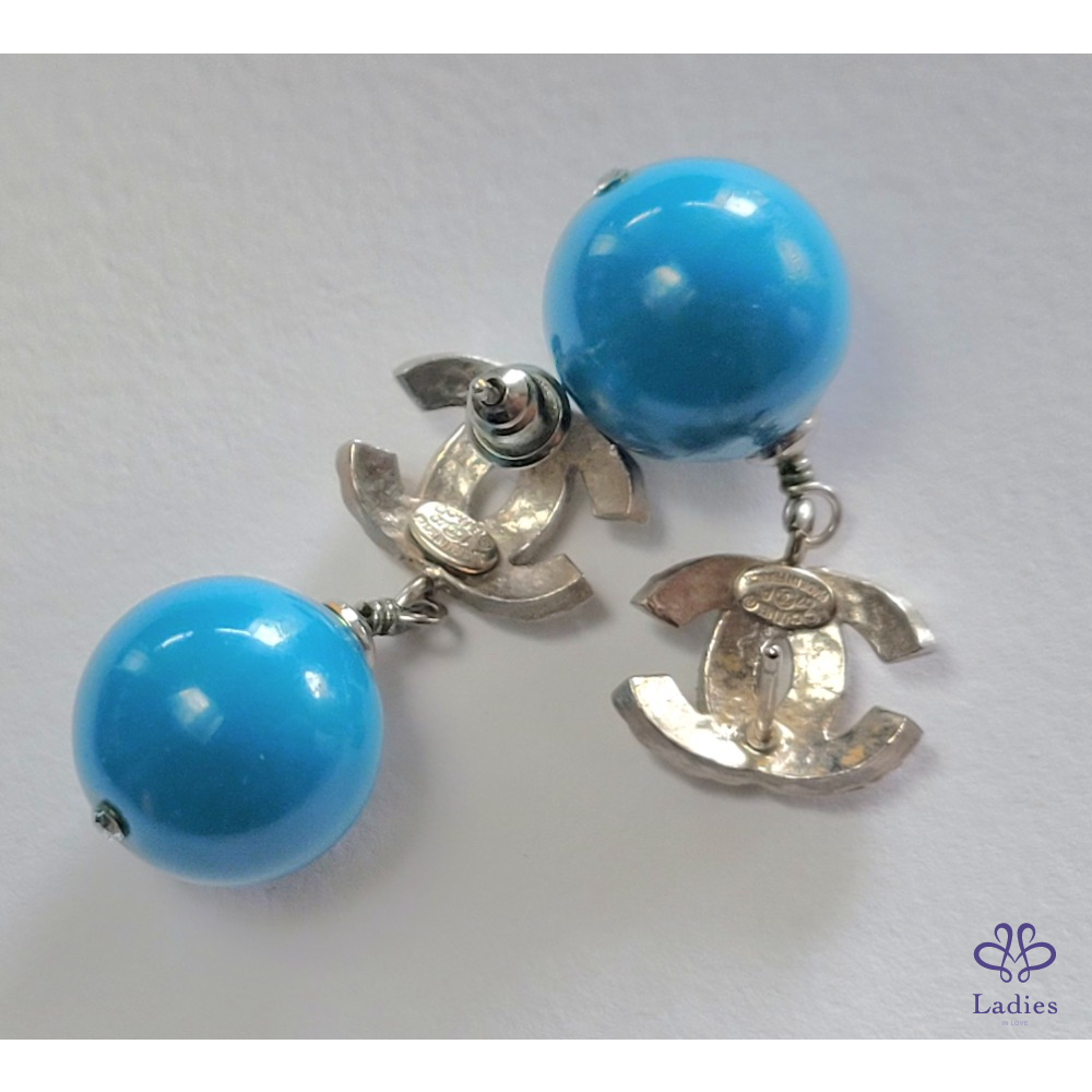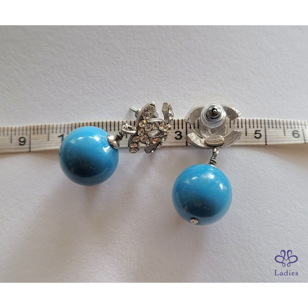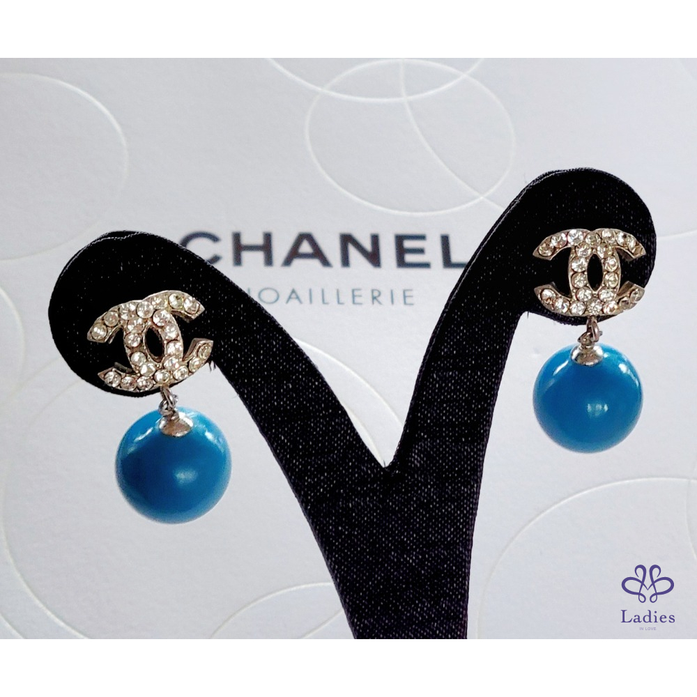 ~CHANEL Vintage 老香 雙C水鑽+藍圓珠耳針式2007年 耳針式 耳環