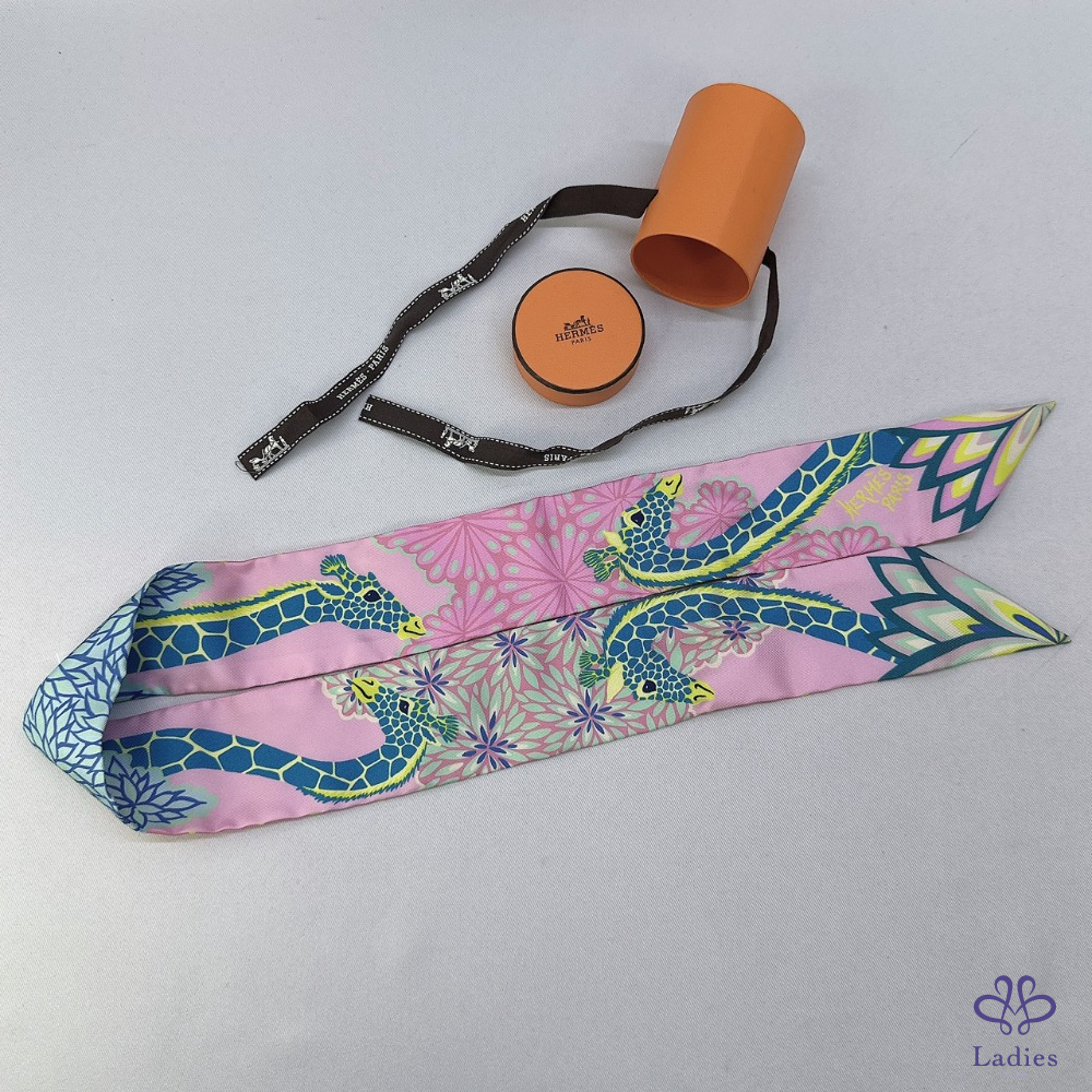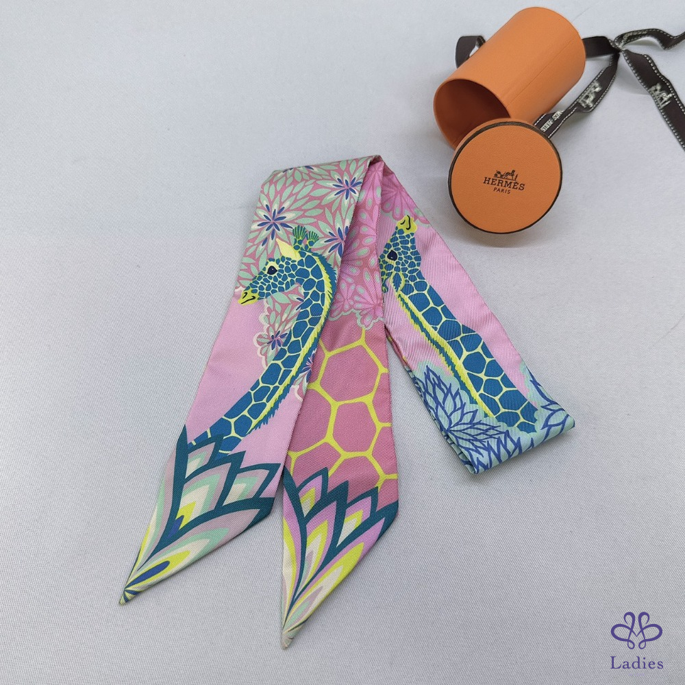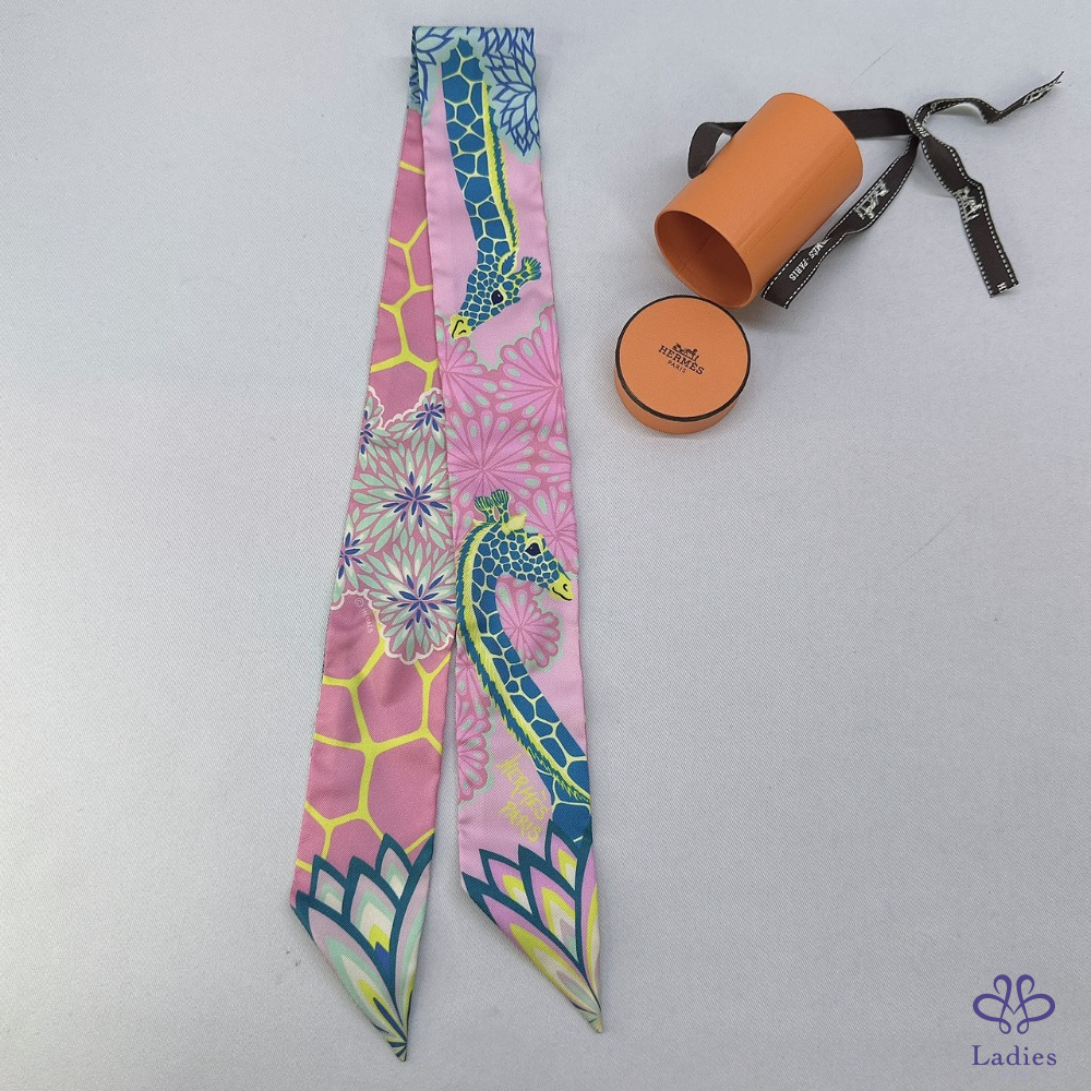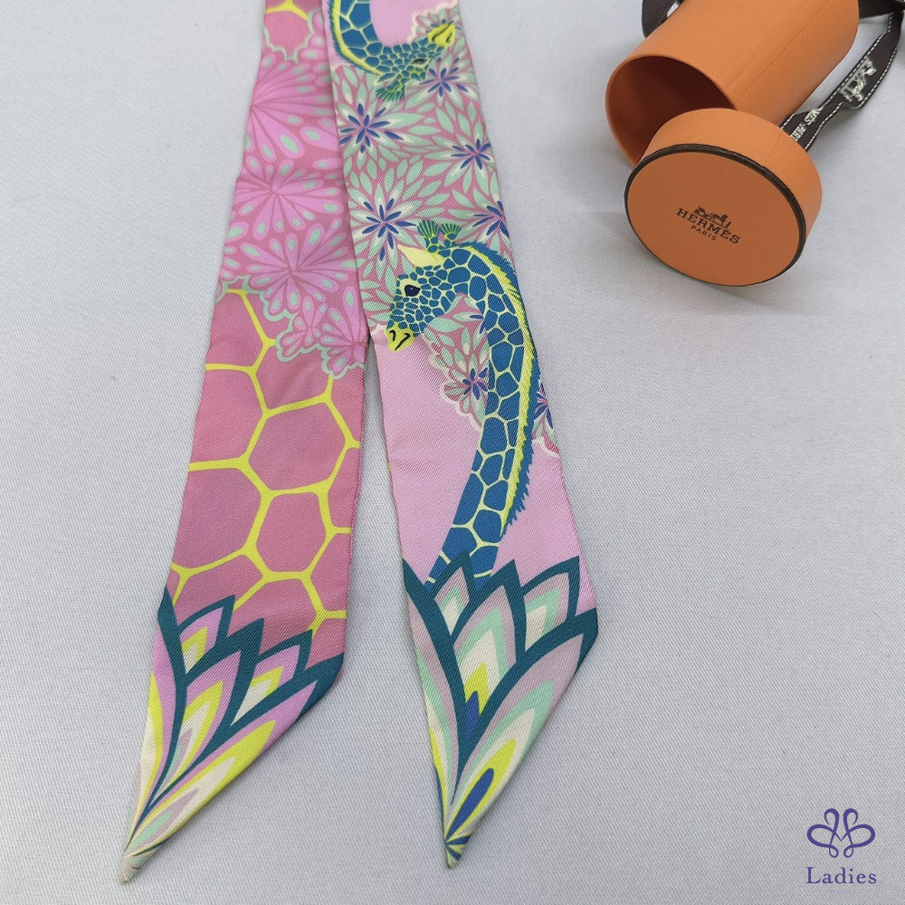 產品信息 【HERMES 全新Twilly長頸鹿絲巾】 #離櫃全新無使用僅拍照 亮眼粉色為底🩷 搭配長頸鹿與花卉圖案🦒 色彩繽紛活潑,增添俏皮與藝術氣息🥰 ⚜️整體品項9成9新,二手商品均有正常使用/存放痕跡 ⚜️尺寸:86cm ⚜️附件:盒子、緞帶 #A114051214