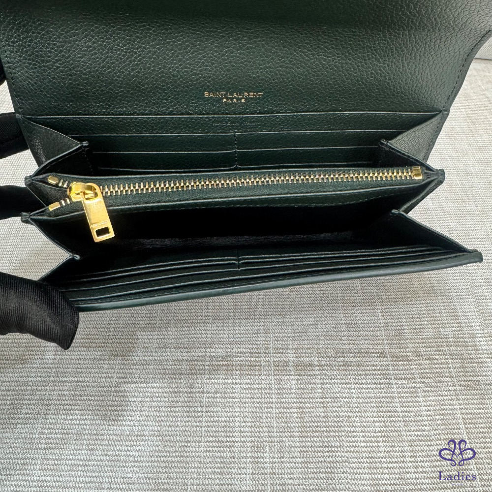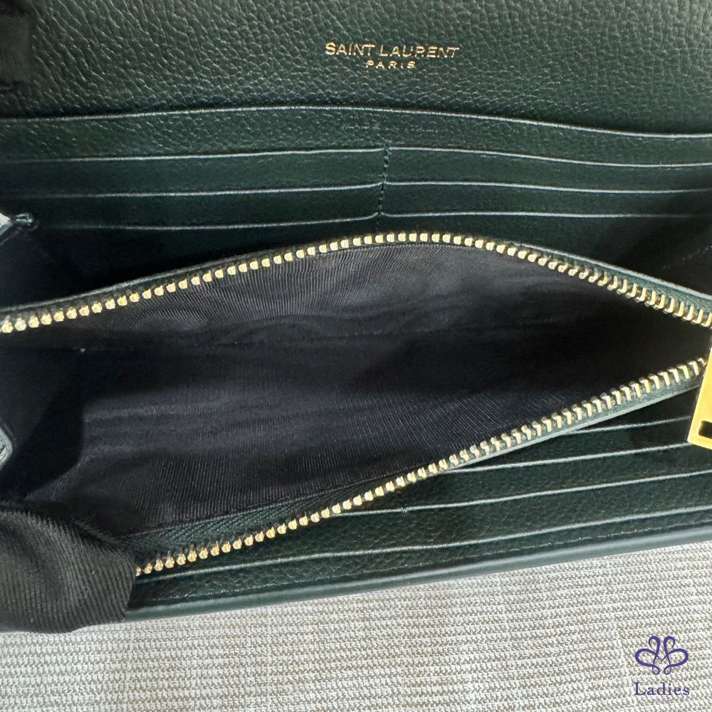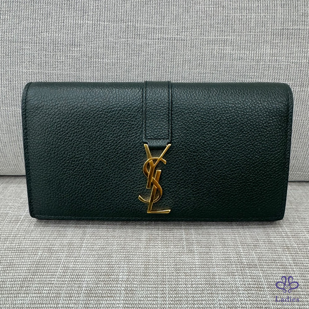 💖💖 YSL 聖羅蘭 經典LOGO荔枝紋牛皮釦式長夾 金釦深綠