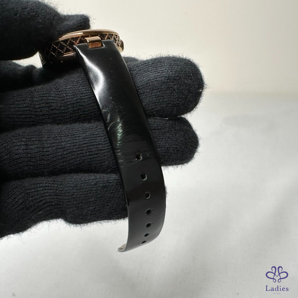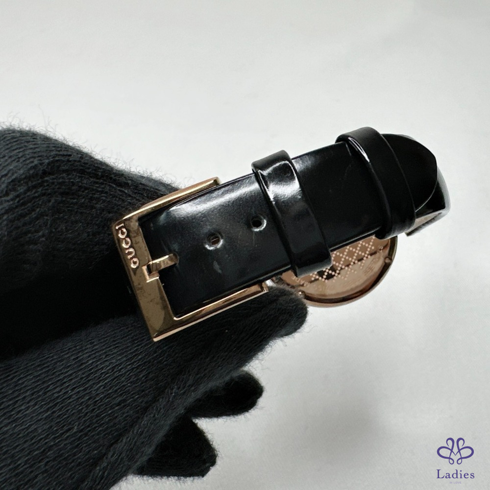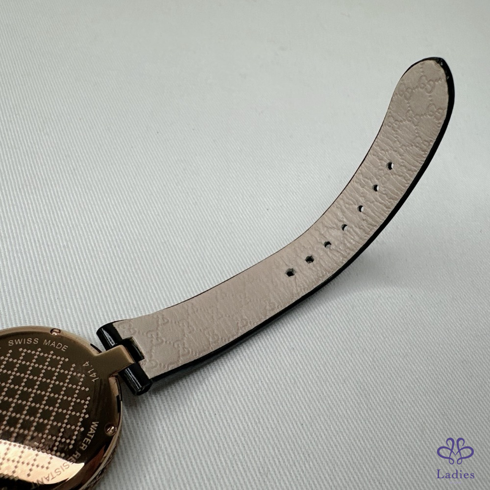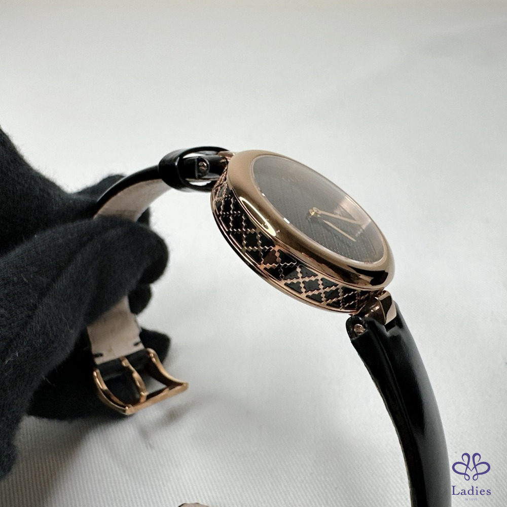 產品信息 【GUCCI Diamantissima石英腕錶】 專櫃價約5萬 玫瑰金色和黑色PVD鍍層錶殼,黑色漆面鑽石紋圖案 黑色漆面錶盤也以相同的色調演繹印花織物的效果 整體品項約9成新,二手商品均有正常使用/存放痕跡 型號:YA141401 尺寸:錶徑32mm 附件:精美錶盒 #B114062508