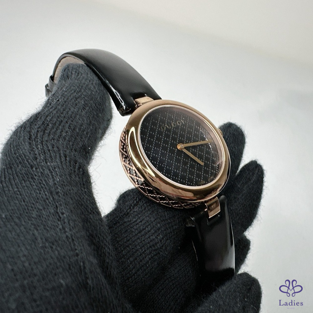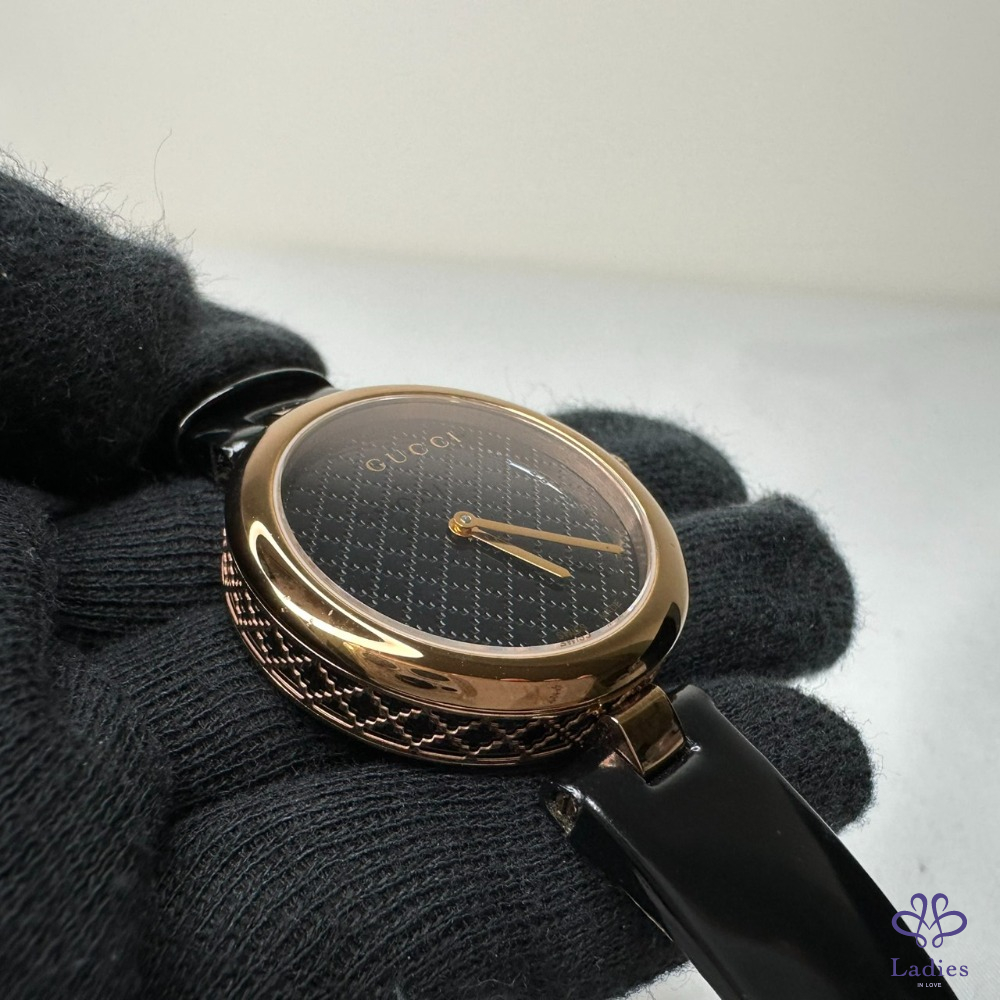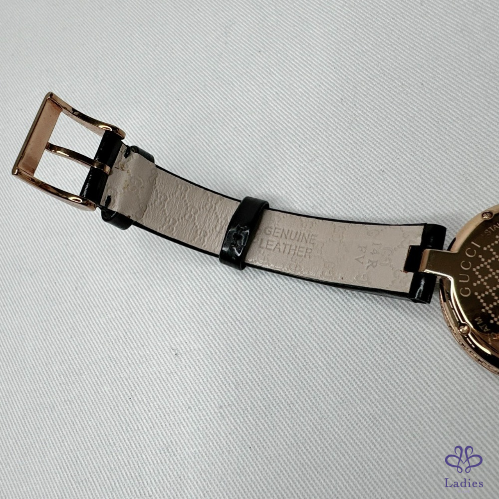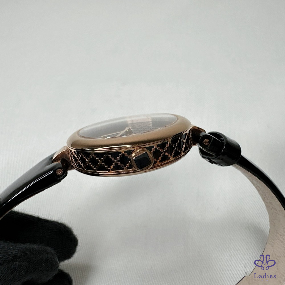 產品信息 【GUCCI Diamantissima石英腕錶】 專櫃價約5萬 玫瑰金色和黑色PVD鍍層錶殼,黑色漆面鑽石紋圖案 黑色漆面錶盤也以相同的色調演繹印花織物的效果 整體品項約9成新,二手商品均有正常使用/存放痕跡 型號:YA141401 尺寸:錶徑32mm 附件:精美錶盒 #B114062508