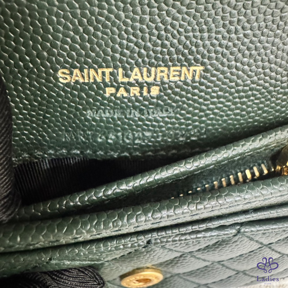 💖💖YSL 聖羅蘭 經典LOGO粒紋牛皮扣式卡片零錢包 深綠色金釦