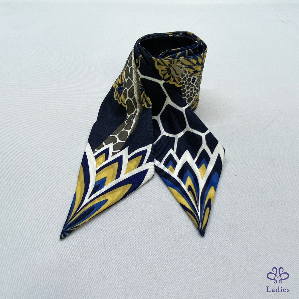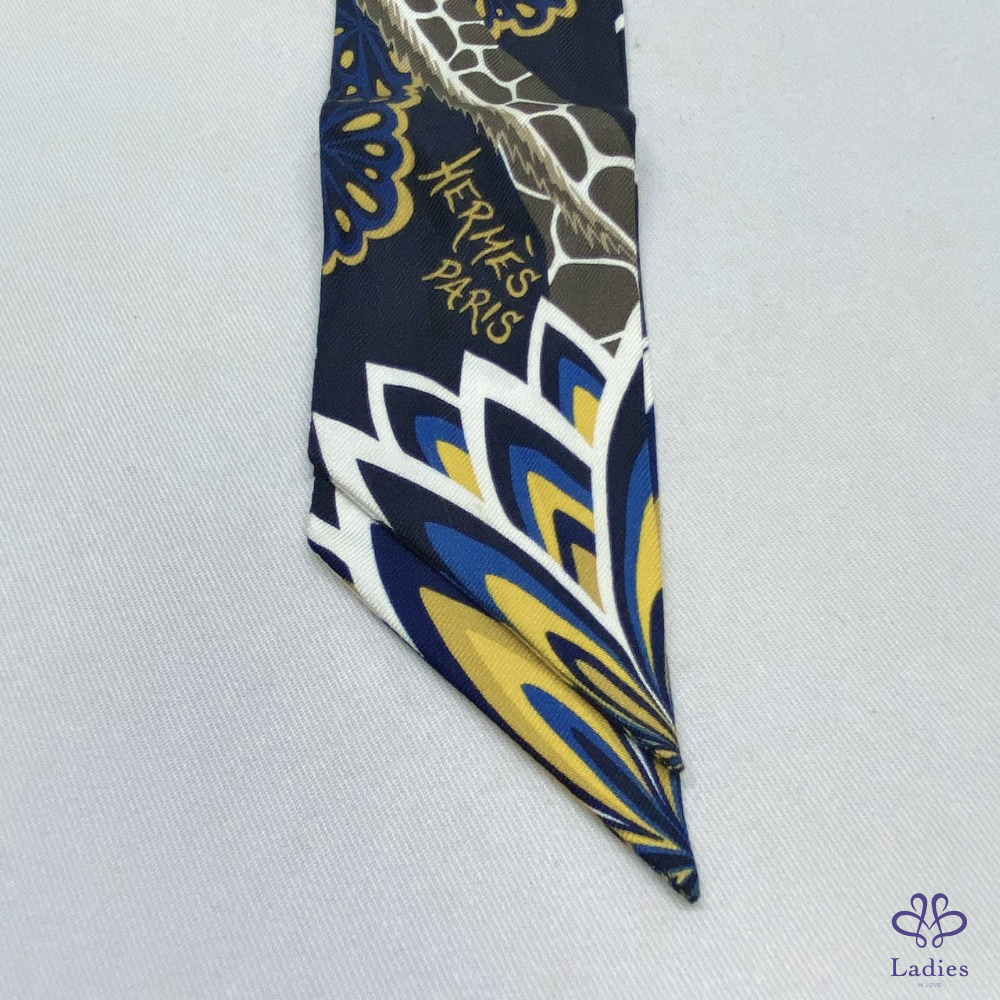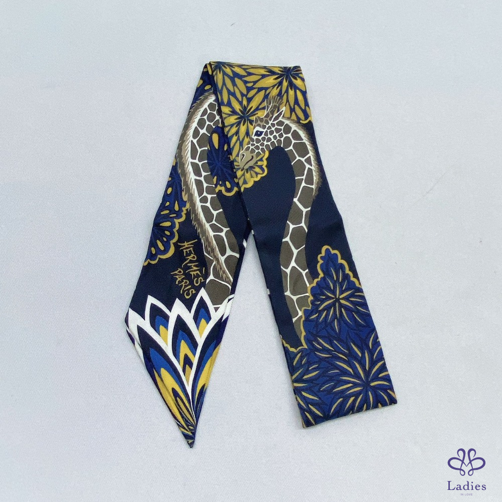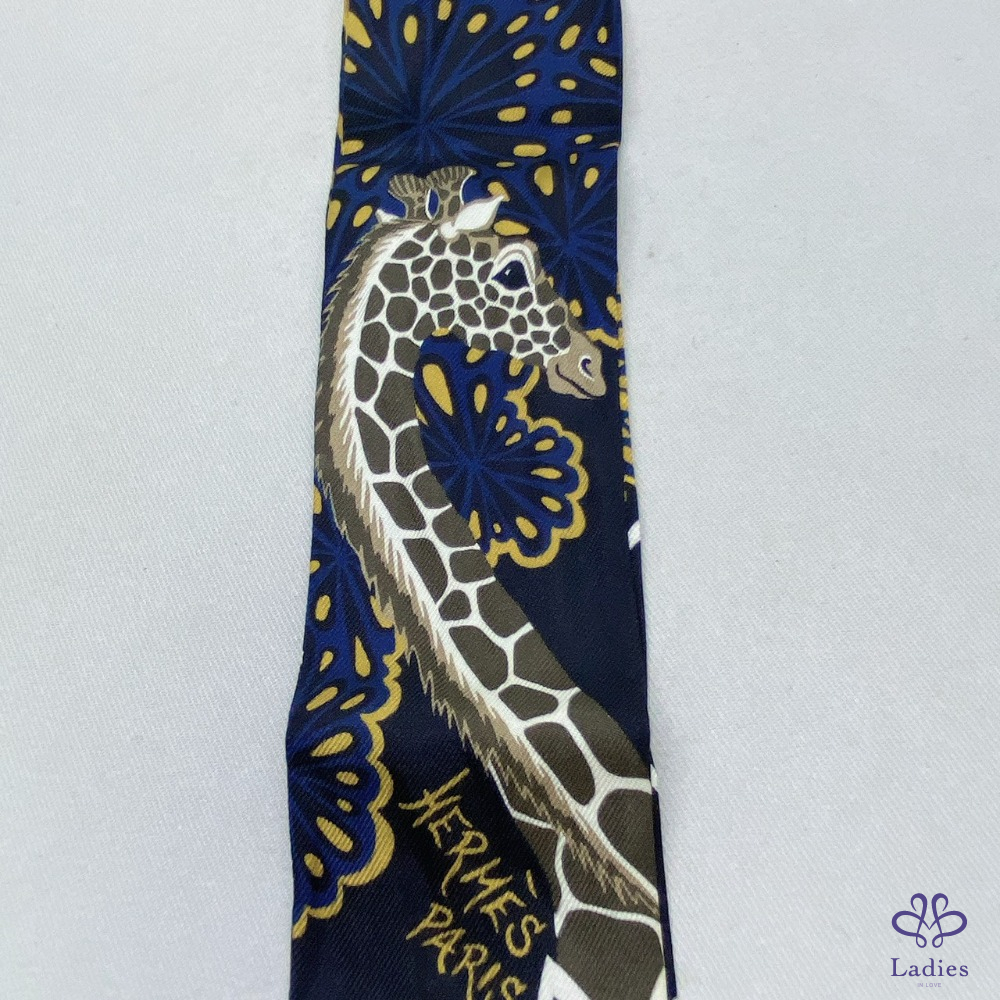 產品信息 【HERMES 全新Twilly美惠三女神絲巾】 這款絲巾以深藍為基調,並使用少許黃色點綴💙💛 搭配長頸鹿🦒與花卉圖騰🏵️ 展現優雅野性之美 ⚜️整體品項全新,二手商品均有正常使用/存放痕跡 ⚜️尺寸:總長86cm ⚜️附件:無 #A114052801