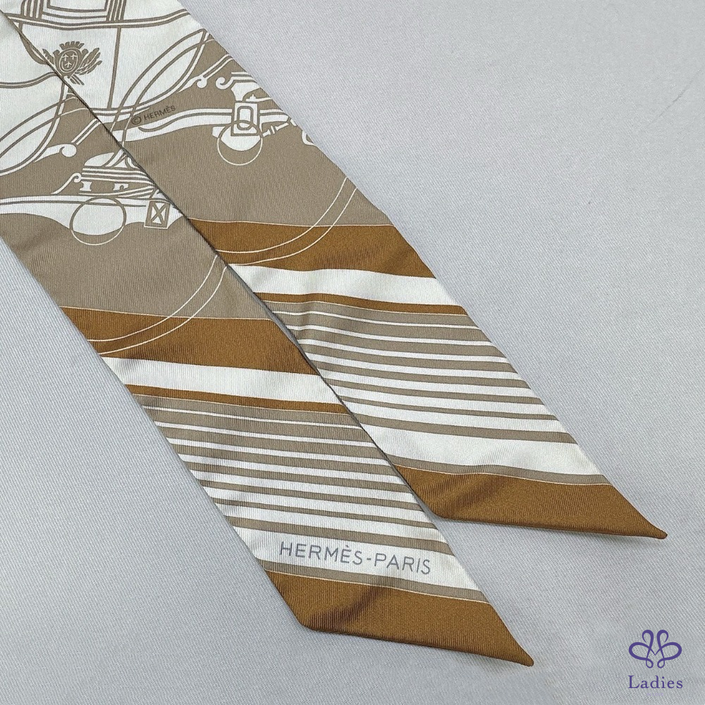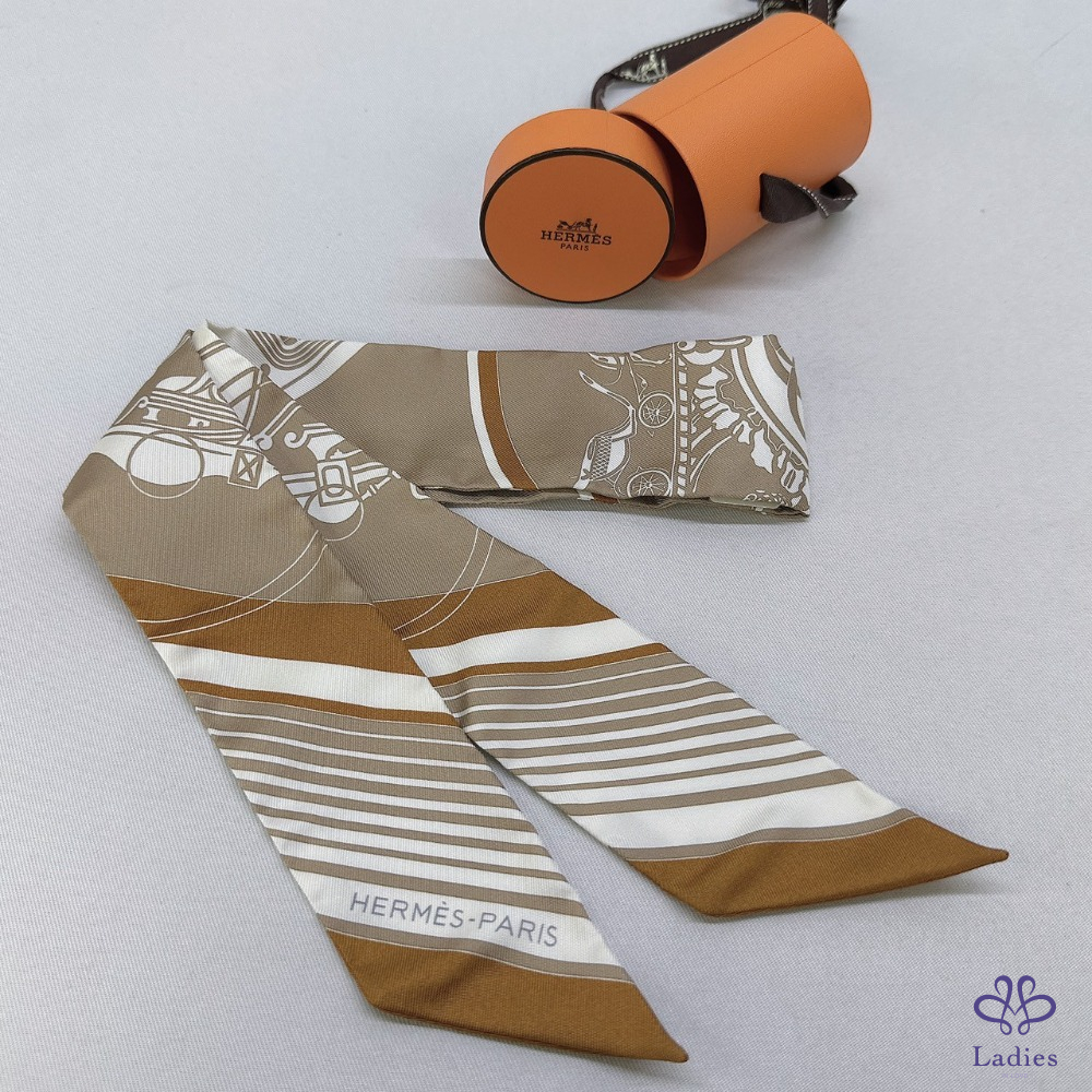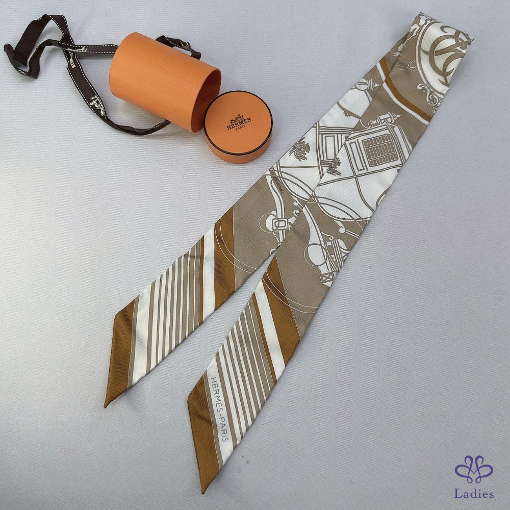 產品信息 【HERMES 全新Twilly棕色馬車絲巾】 #離櫃全新無使用僅拍照 採用優雅米白與焦糖色調🤎🤍 搭配馬車圖騰與條紋設計 展現經典與現代風格的完美融合✨ ⚜️整體品項9成9新,二手商品均有正常使用/存放痕跡 ⚜️尺寸:86cm ⚜️附件:盒子、緞帶 #A114051216