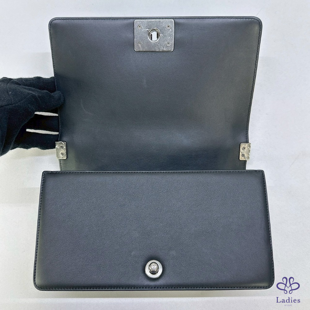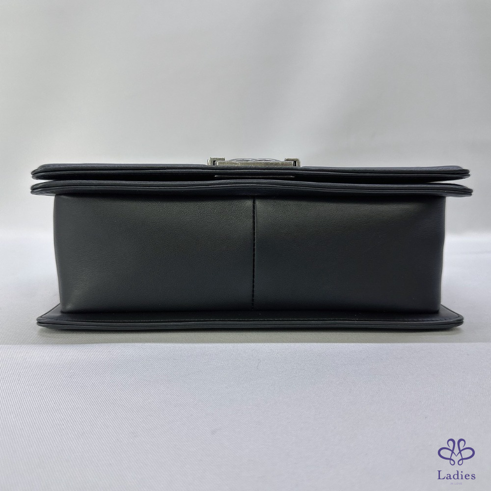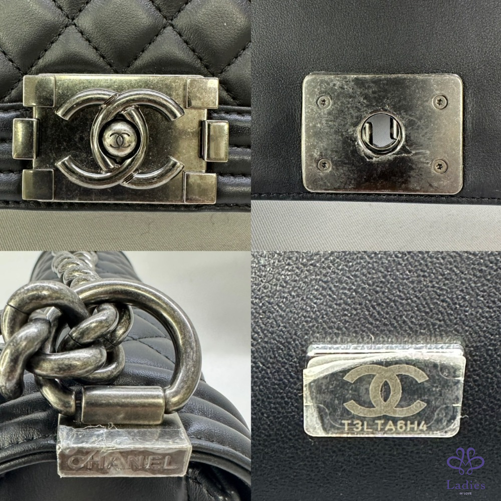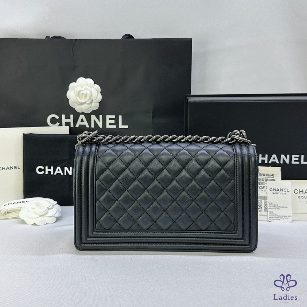 產品信息 【CHANEL 黑銀小羊皮BOY 25】 #晶片版大全配 低調奢華黑色小羊皮結合香奈兒經典菱格紋 粗獷鏈條及雙C鎖扣設計,可肩背、斜背,自由變換風格 ⚜️整體包況約9成7新,二手商品均有正常使用/存放痕跡 ⚜️型號:A67086 ⚜️尺寸:14x25x8cm ⚜️附件:盒子、紙袋、防塵袋、2024購證、發票、冊本、緞帶、山茶花 #A114071101