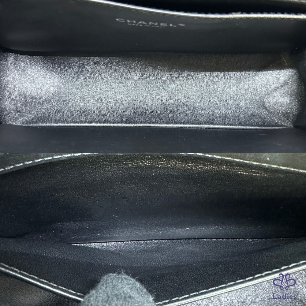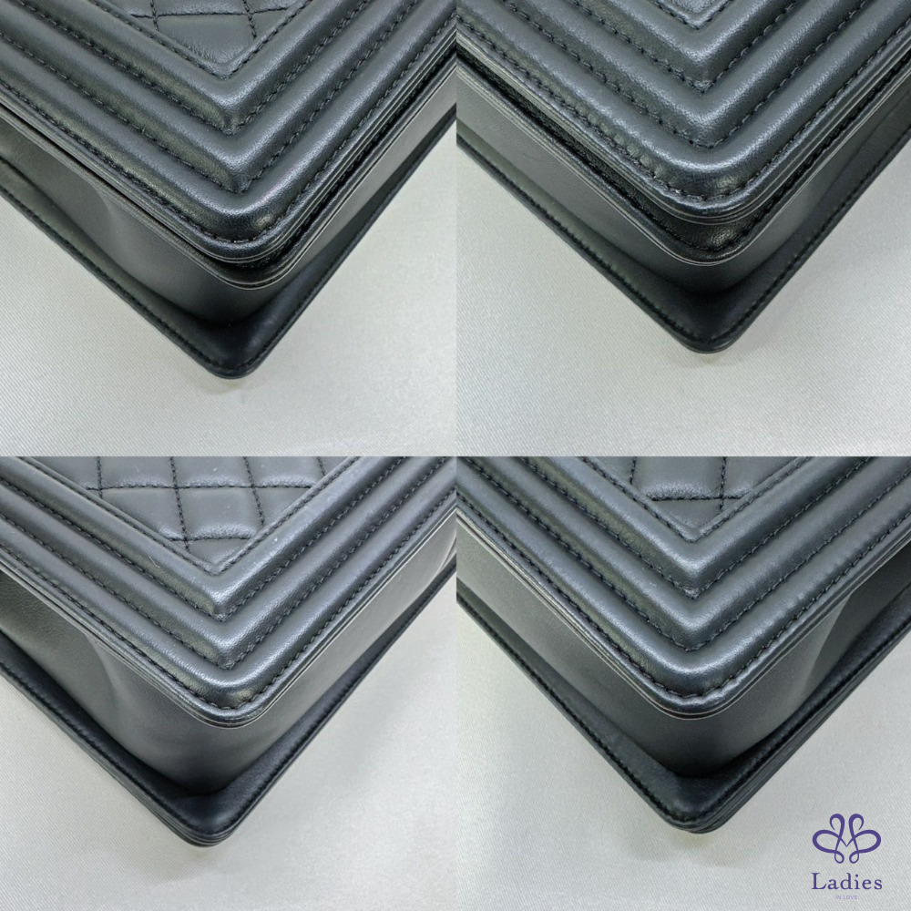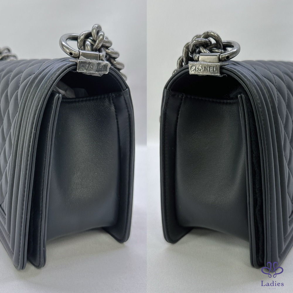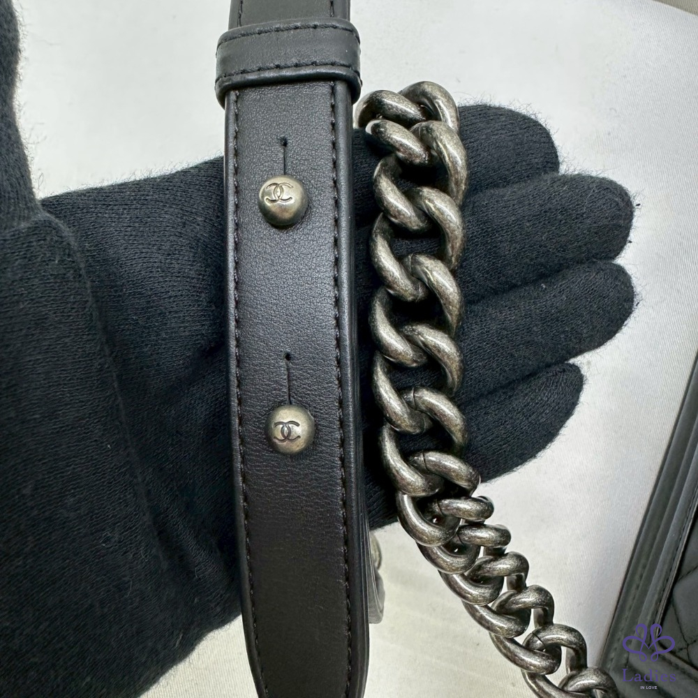 產品信息 【CHANEL 黑銀小羊皮BOY 25】 #晶片版大全配 低調奢華黑色小羊皮結合香奈兒經典菱格紋 粗獷鏈條及雙C鎖扣設計,可肩背、斜背,自由變換風格 ⚜️整體包況約9成7新,二手商品均有正常使用/存放痕跡 ⚜️型號:A67086 ⚜️尺寸:14x25x8cm ⚜️附件:盒子、紙袋、防塵袋、2024購證、發票、冊本、緞帶、山茶花 #A114071101