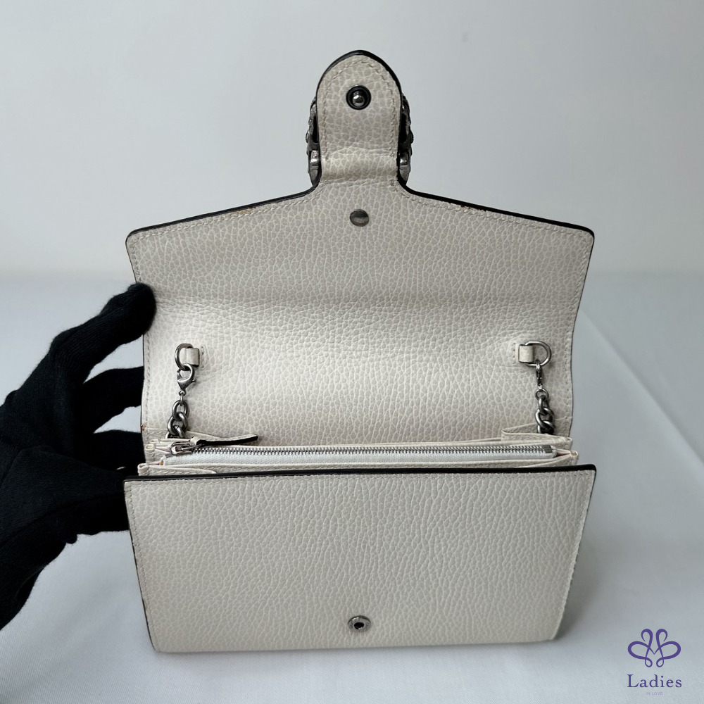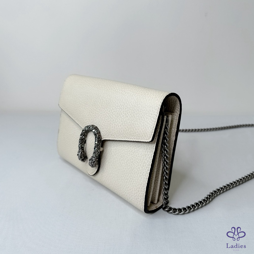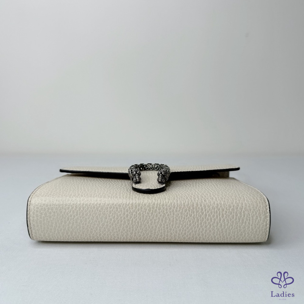 產品信息 【GUCCI Dionysus WOC酒神包】 #櫃上價已破6萬 獨特古銀色虎頭扣飾開合 虎頭扣上飾有Swarovski水晶石 16個卡片夾層 / 2個鈔票隔層 3個獨立的內部隔層 / 1個拉鏈零錢格 #幾處原廠溢膠不影響使用 整體包況約9成5新,二手商品均有正常使用/存放痕跡 型號:401231 尺寸:20x13x6cm 附件:原廠紙袋 #B114062507