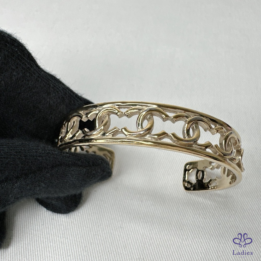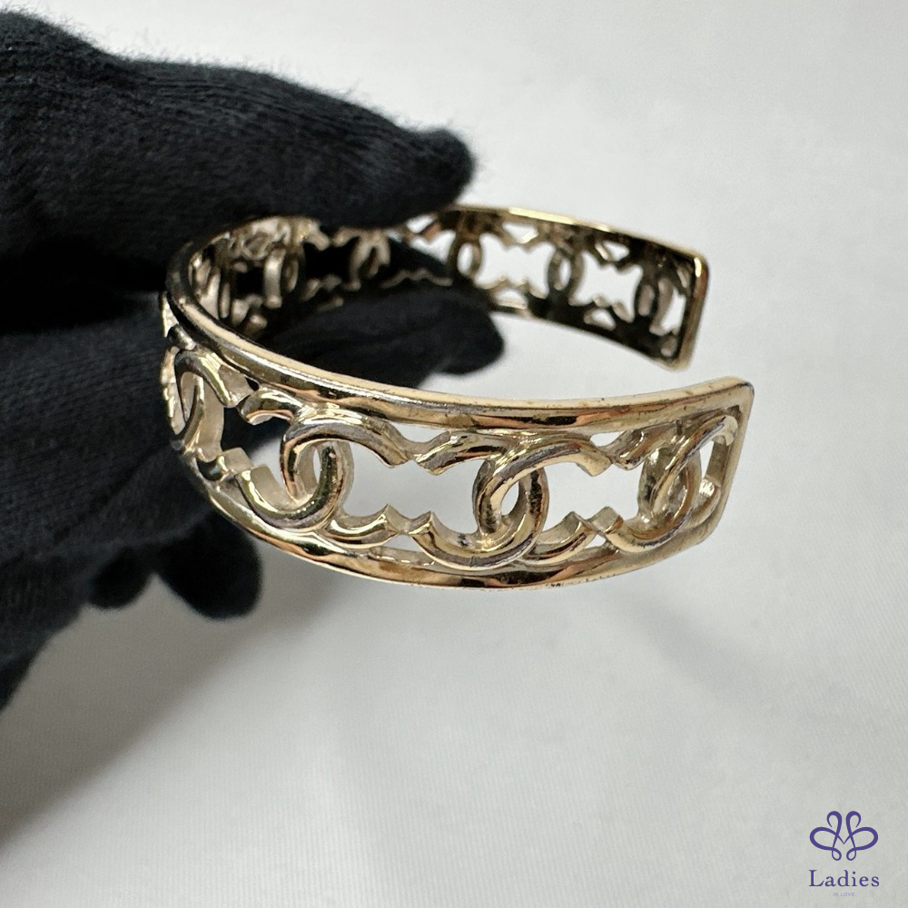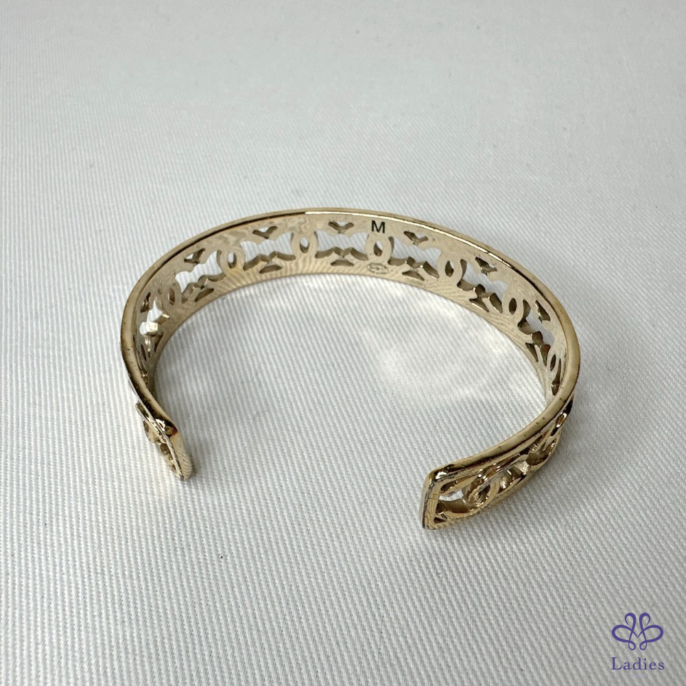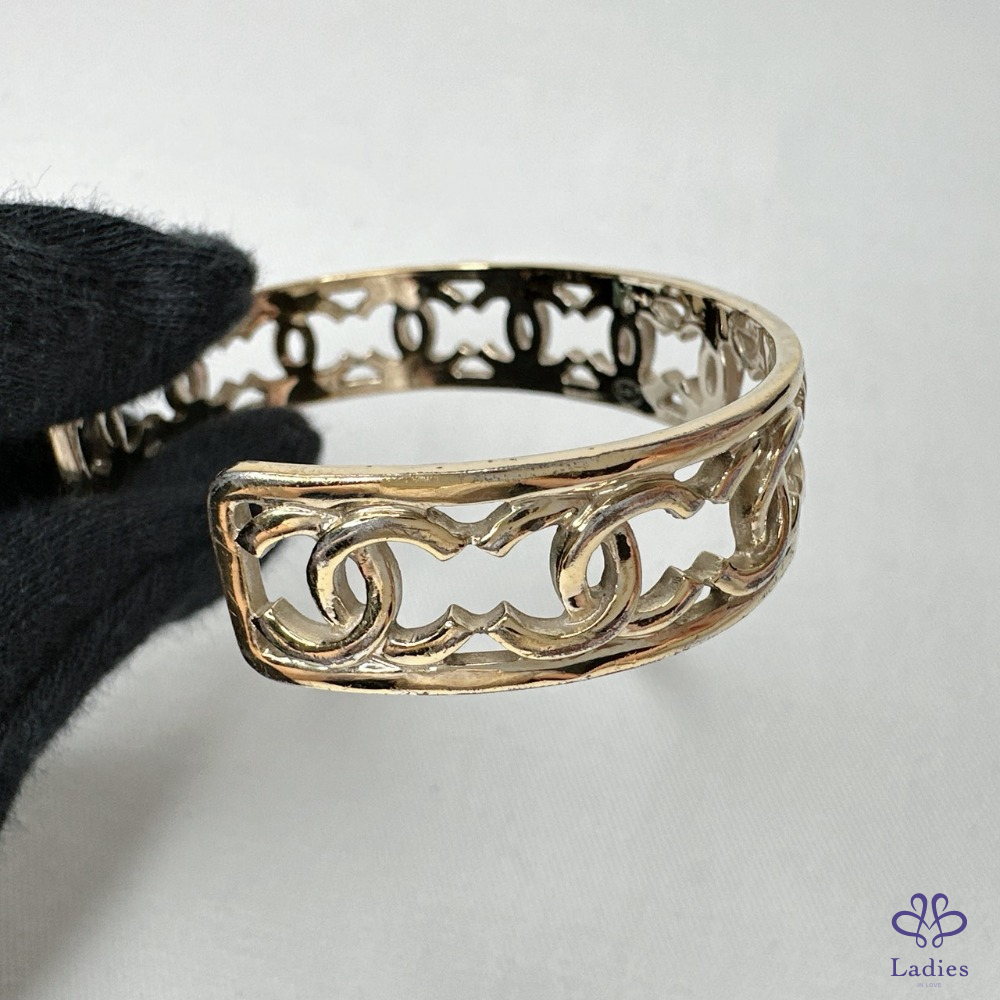 產品信息 【CHANEL 雙C淡金鏤空手鐲】 滿版鏤空CC 淡金色很有氣質 可單戴也可疊戴,都很好搭配 整體品項新舊如圖,二手商品均有正常使用/存放痕跡 型號:AB7920 尺寸:腕圍約16cm/寬1.2cm 附件:原廠盒、原廠防塵袋 #B114071502