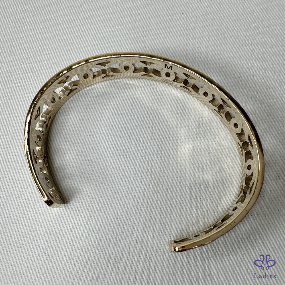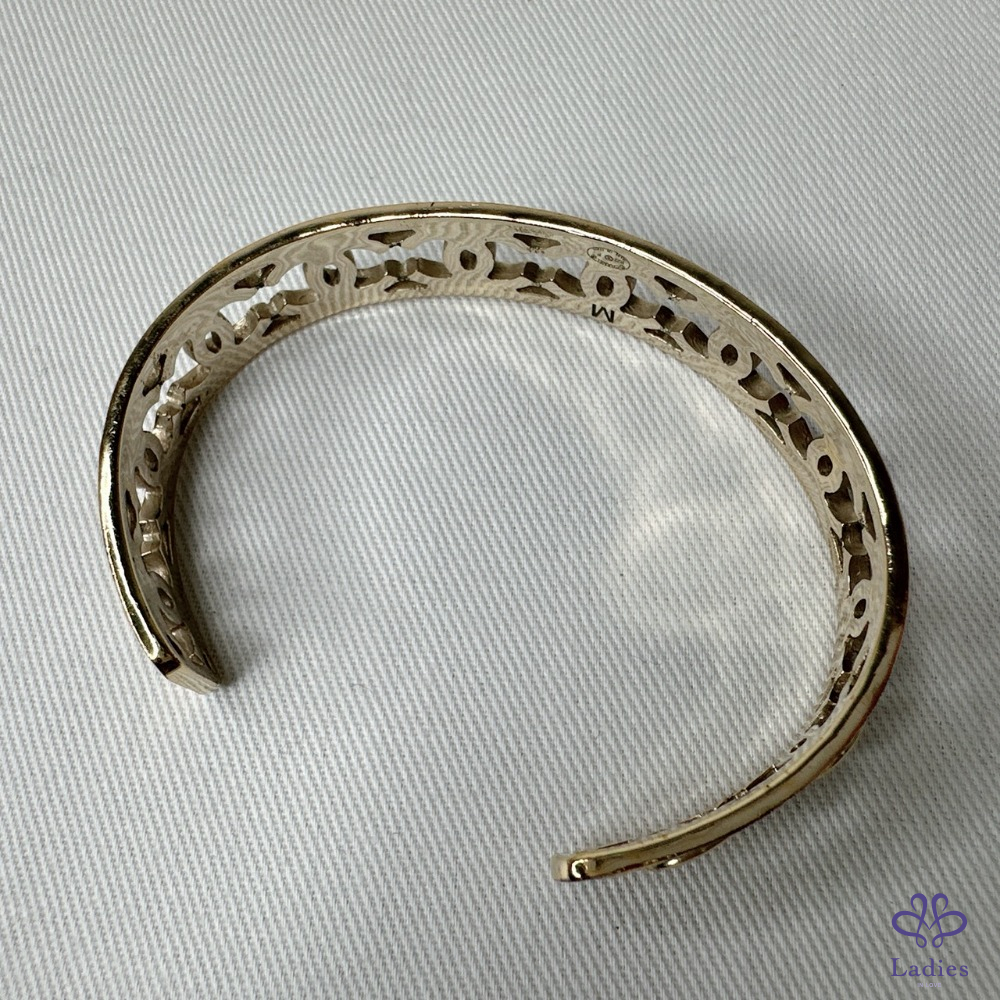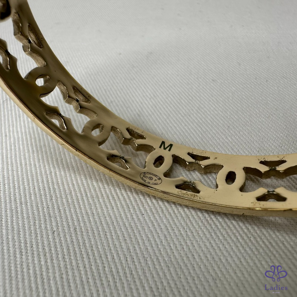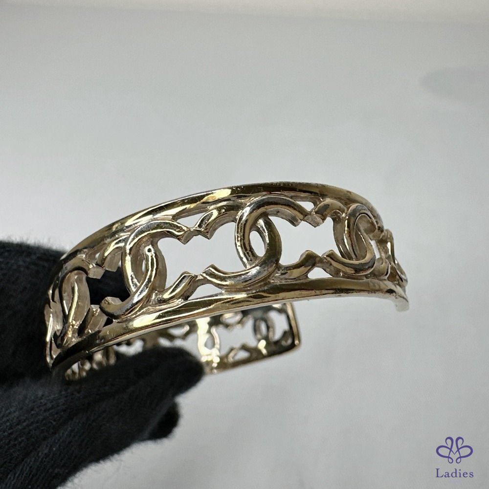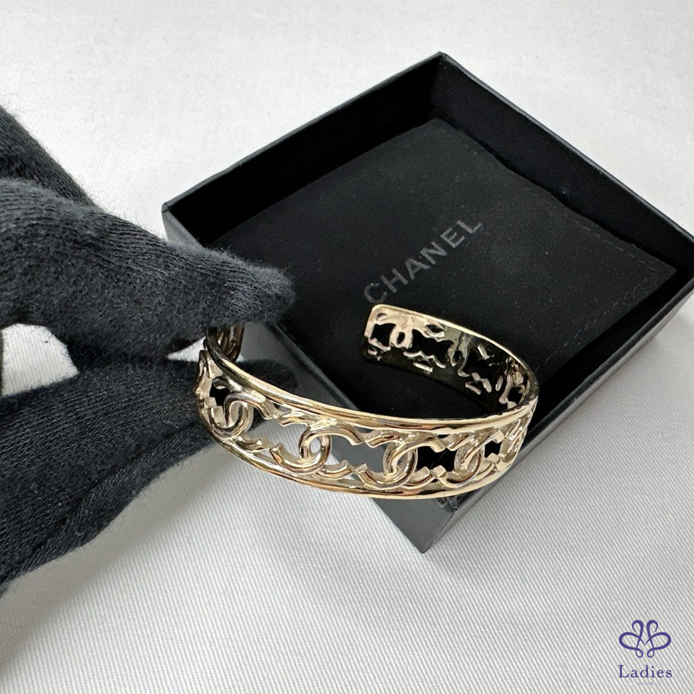 產品信息 【CHANEL 雙C淡金鏤空手鐲】 滿版鏤空CC 淡金色很有氣質 可單戴也可疊戴,都很好搭配 整體品項新舊如圖,二手商品均有正常使用/存放痕跡 型號:AB7920 尺寸:腕圍約16cm/寬1.2cm 附件:原廠盒、原廠防塵袋 #B114071502