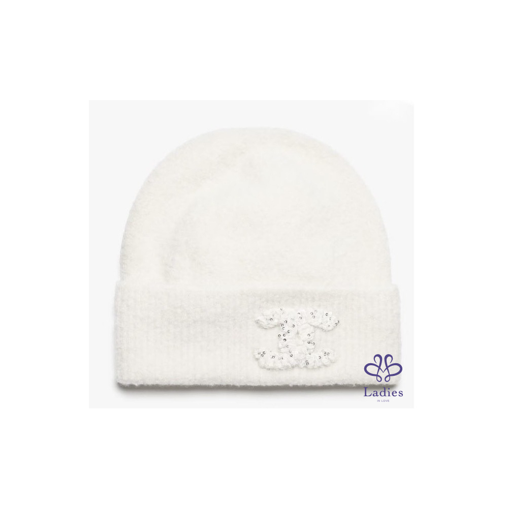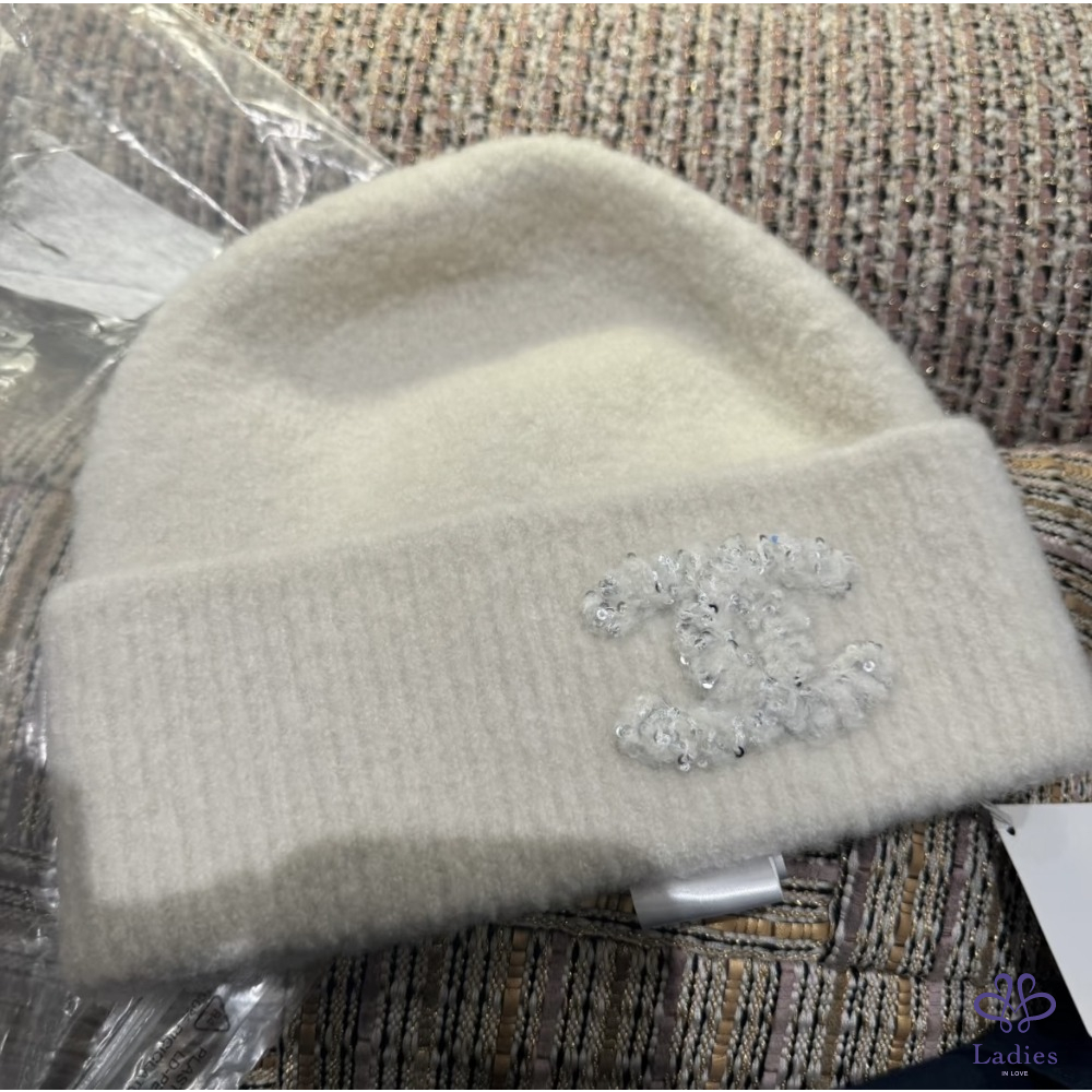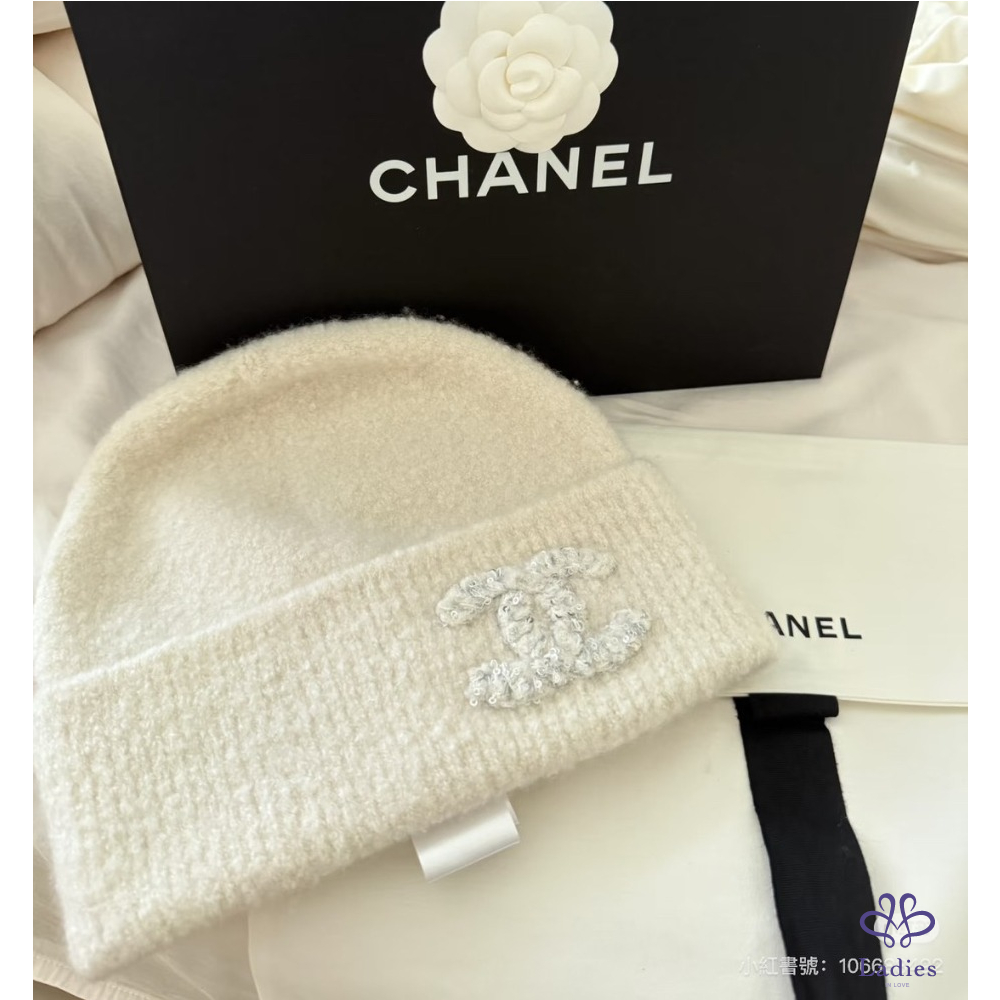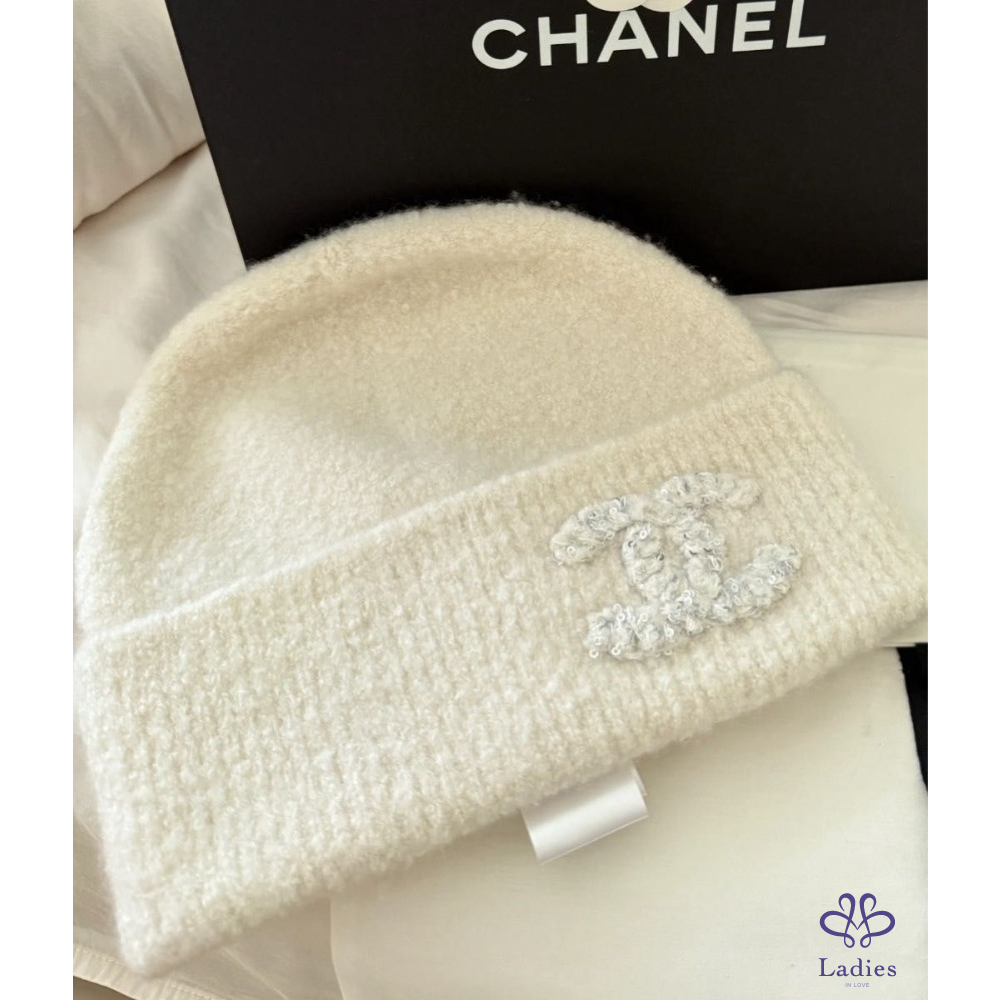 首頁 精品配件 全新 Chanel 25A 外雙C logo 喀什米爾混真絲毛帽 奶白色
