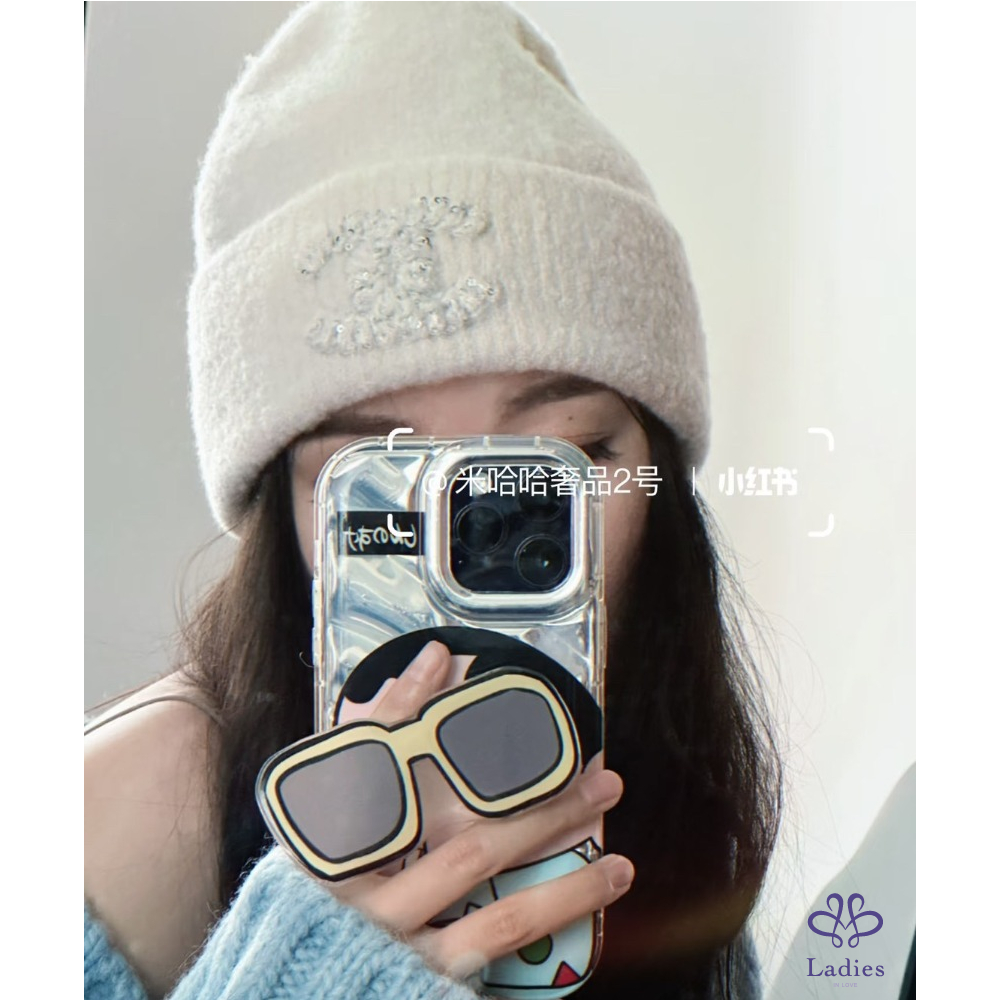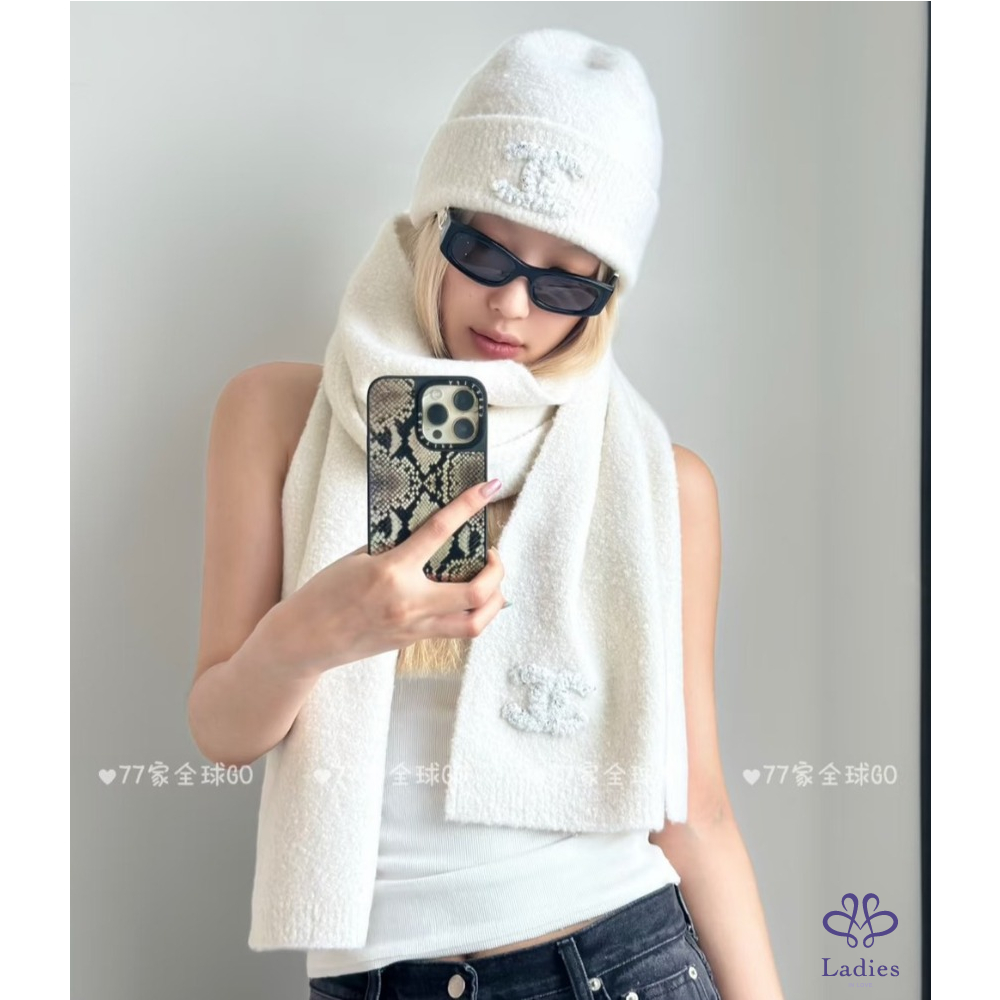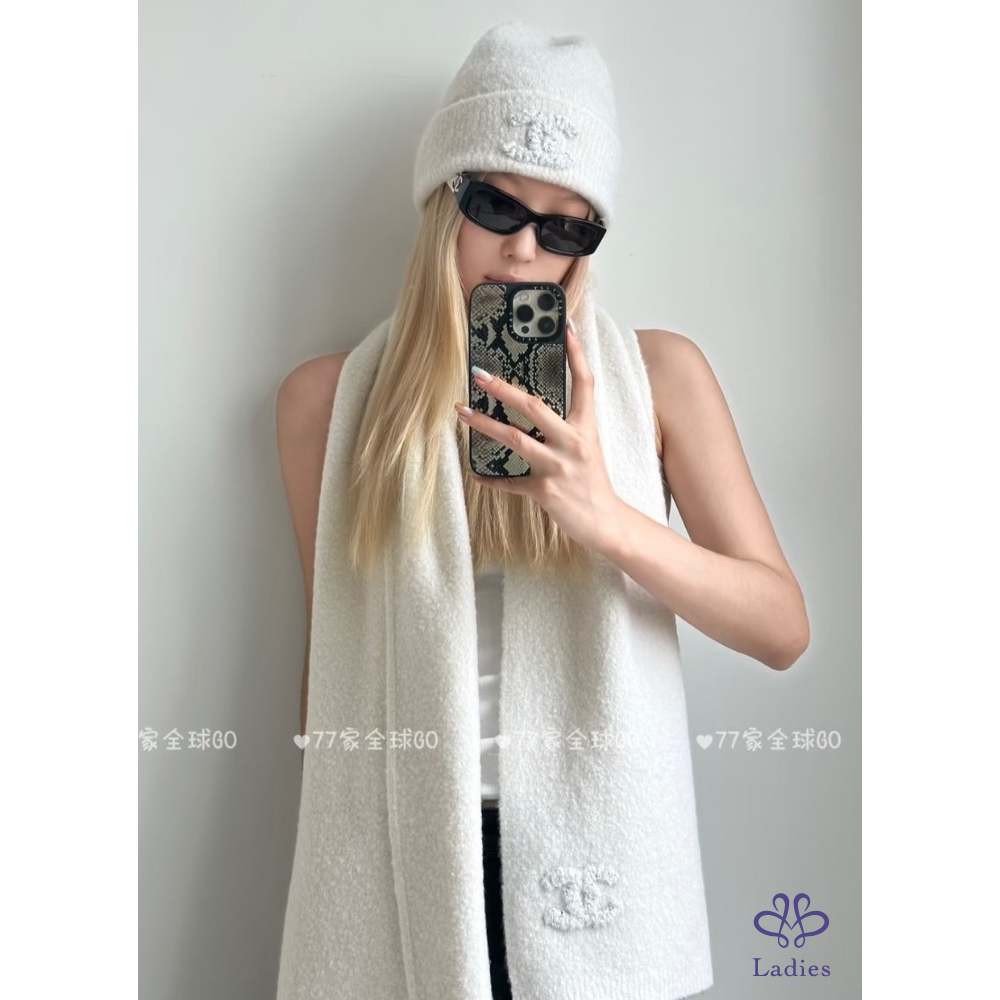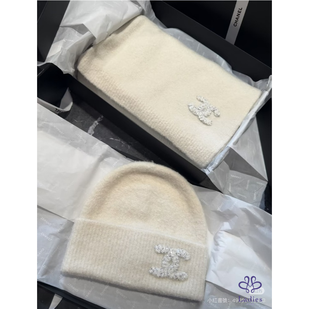 首頁 精品配件 全新 Chanel 25A 外雙C logo 喀什米爾混真絲毛帽 奶白色