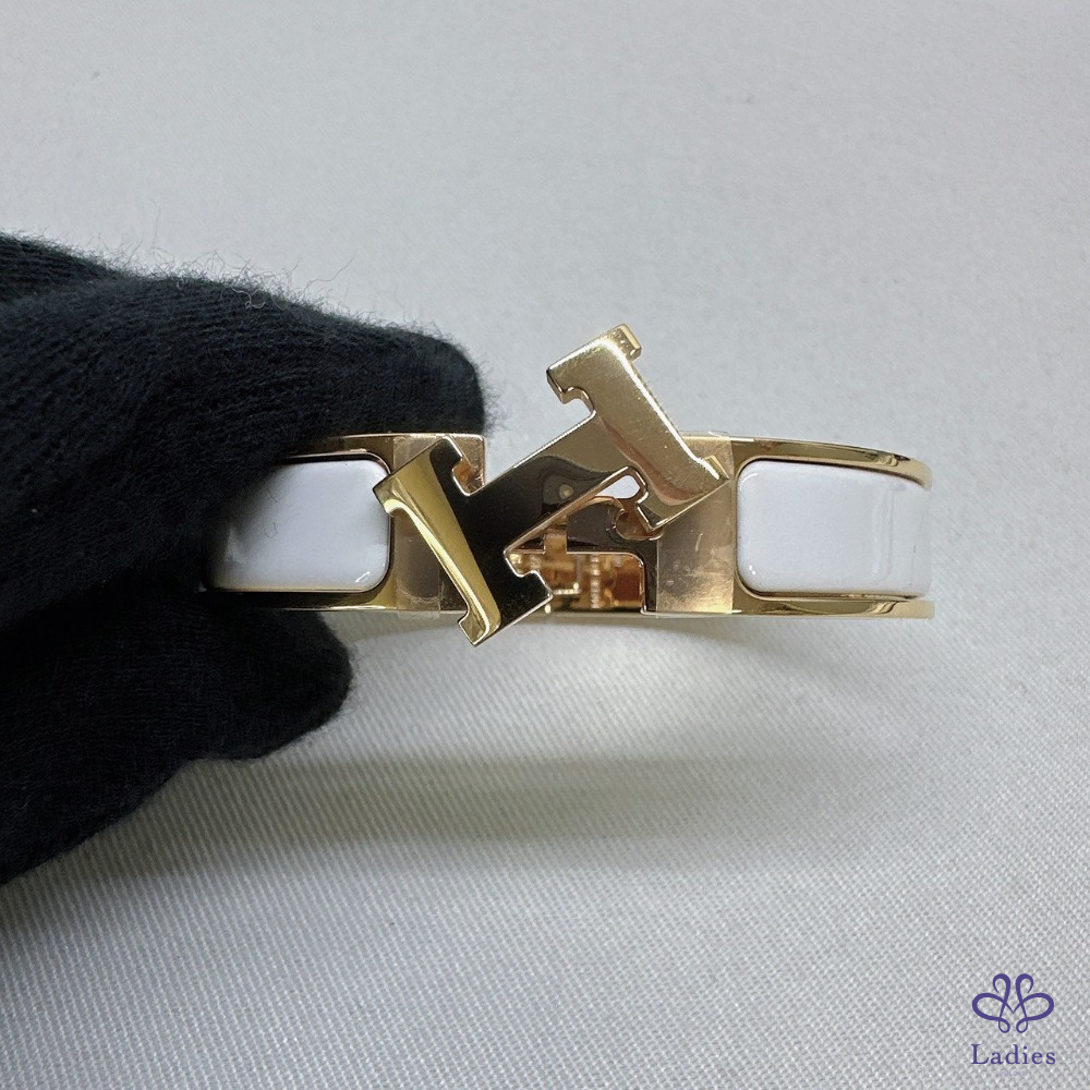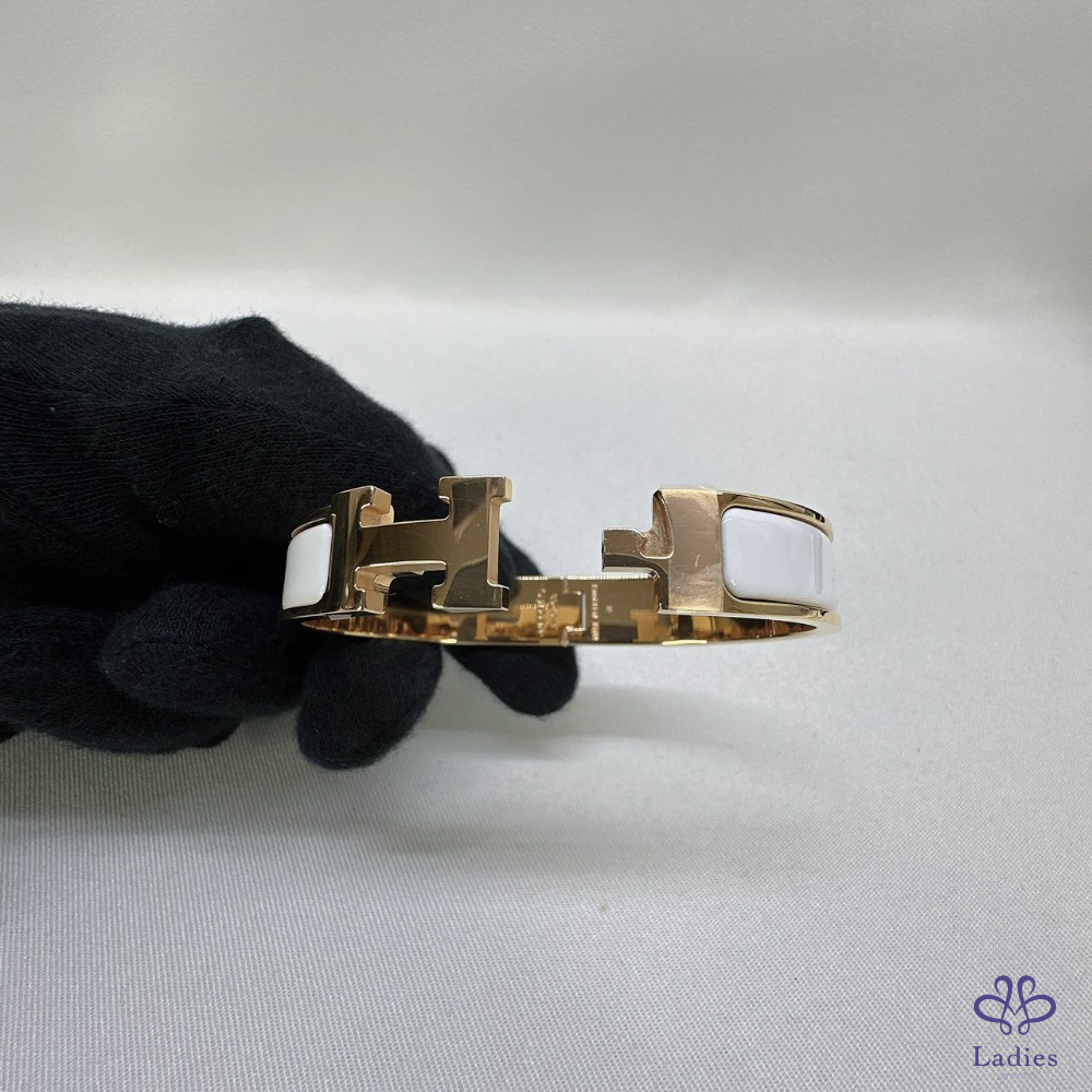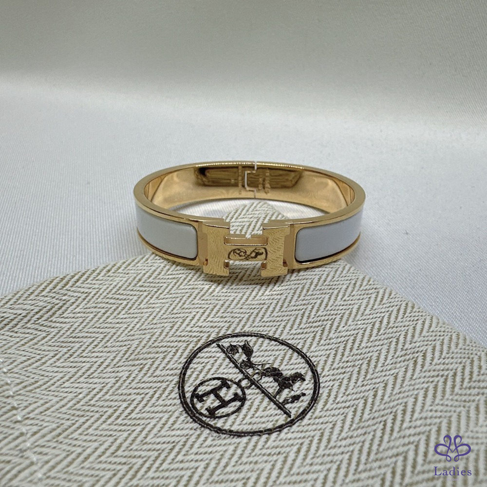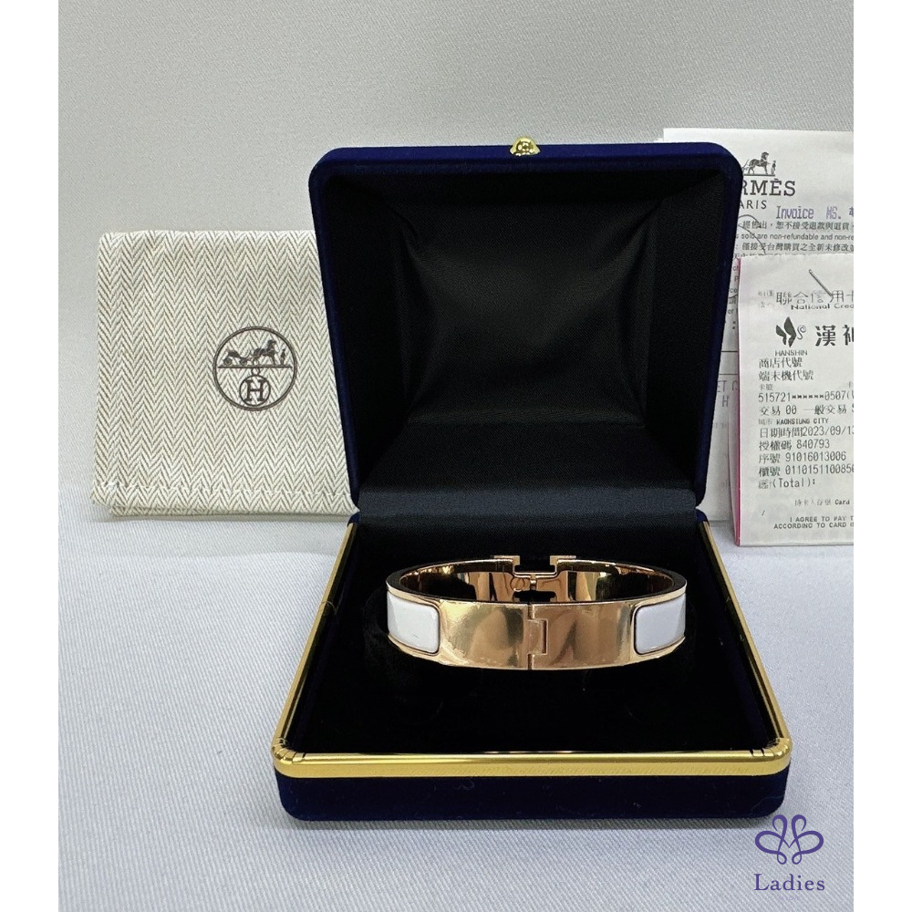 產品信息 【HERMES Clic H白金細版琺瑯手環】 以品牌經典「H」字金屬扣環為中心設計,結合優雅白色琺瑯與亮面金色金屬 無論是單戴或疊搭,都能輕鬆展現低調高貴的品味 ⚜️閒置近新品 ⚜️附件:防塵袋、購證、發票、精美盒子 #A114080905