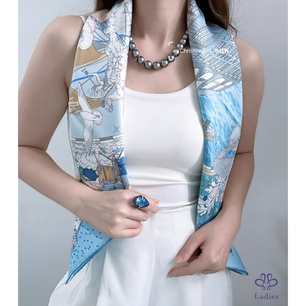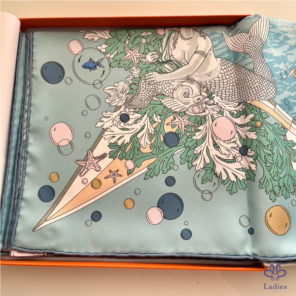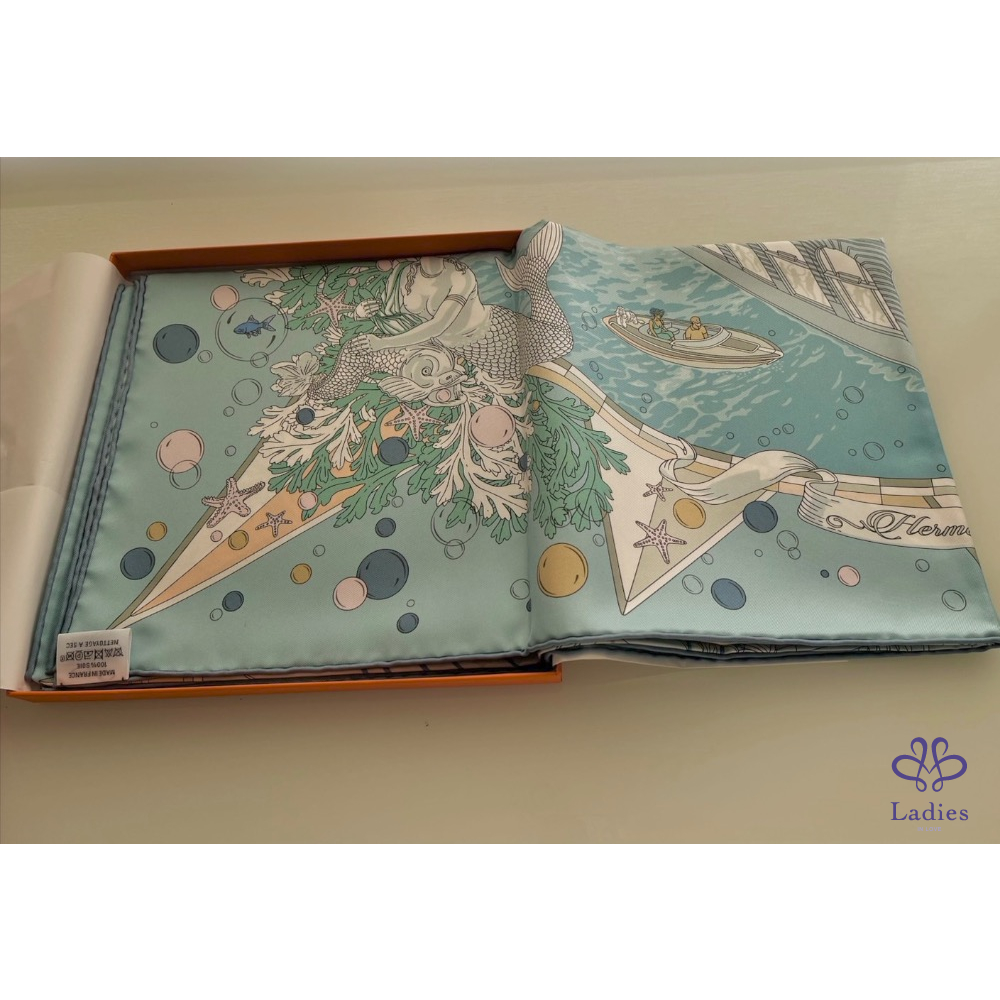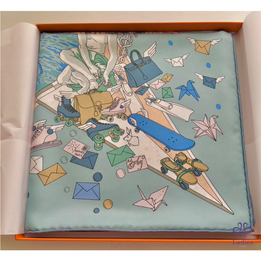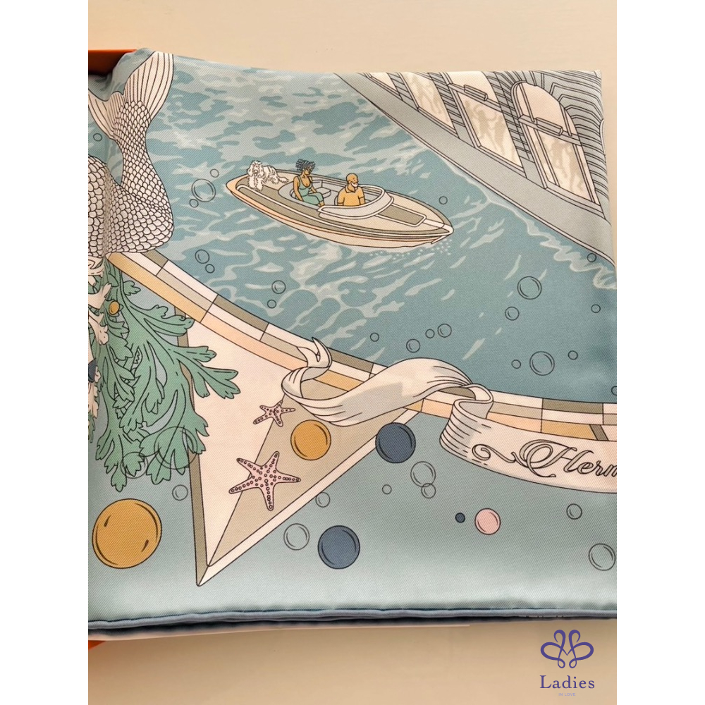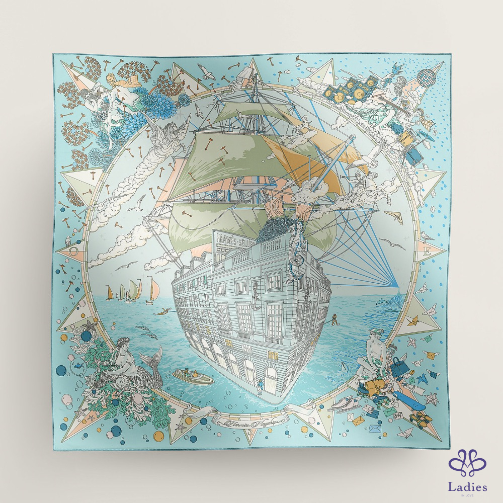 (汛專屬版)Hermes Flagship scarf 90 福寶郵輪水藍色 全新全配 購證影本去個資