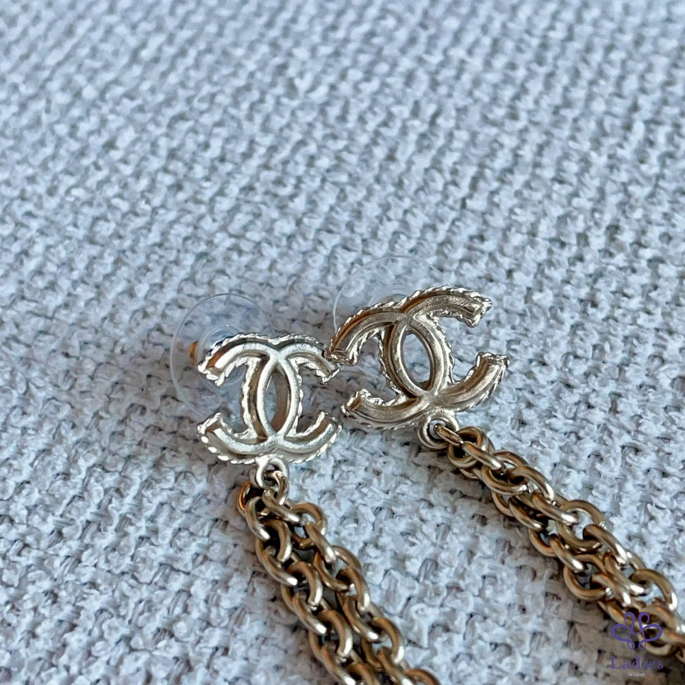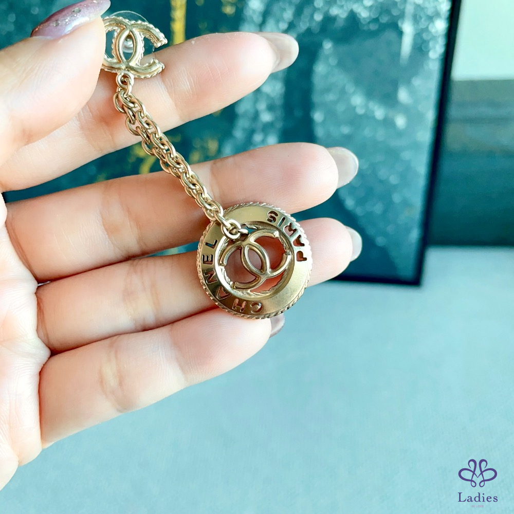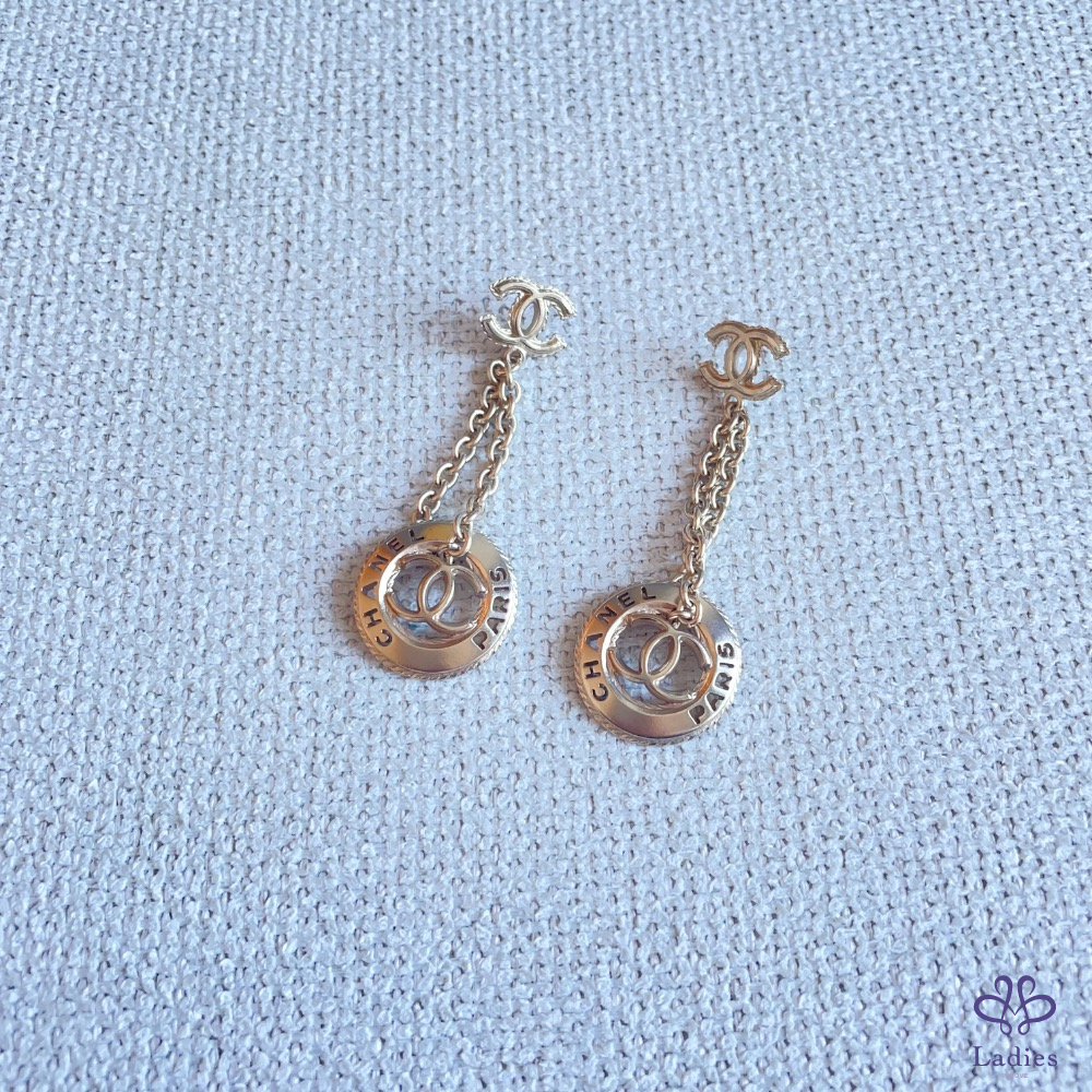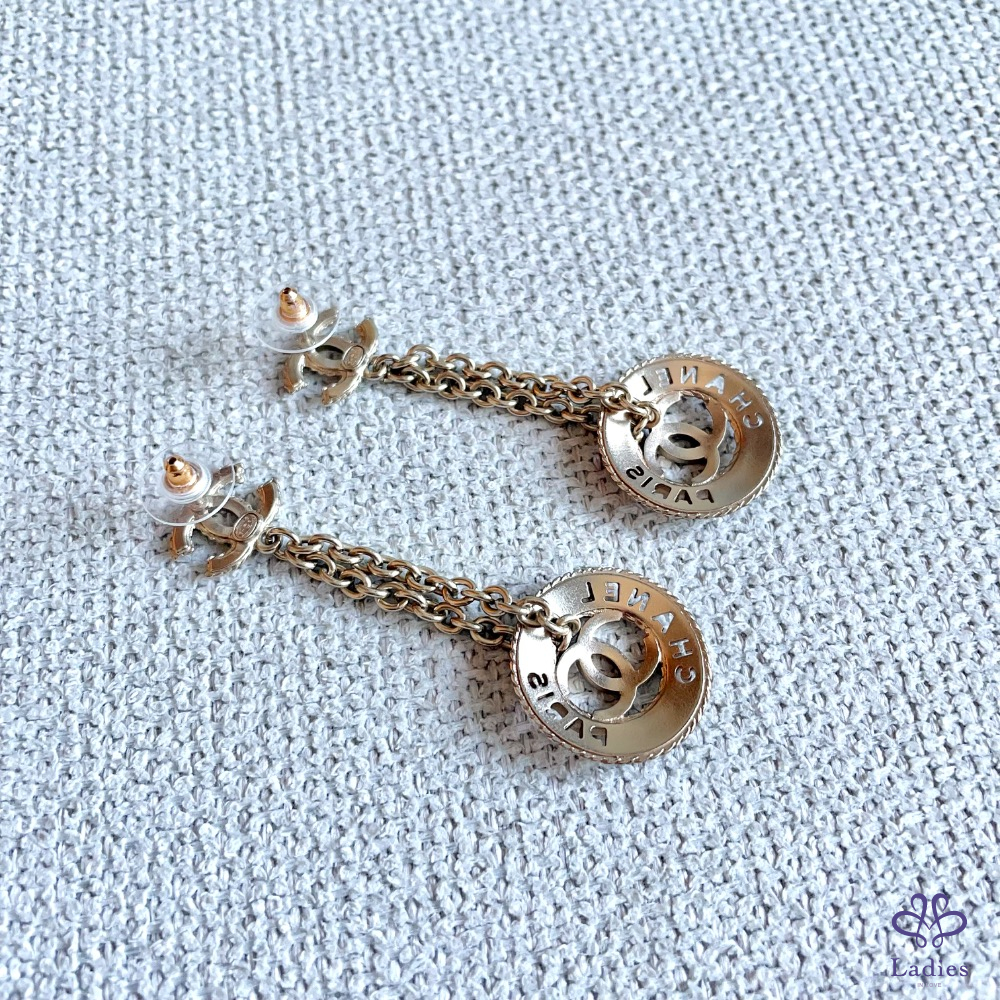 Chanel 圓盤鏤空字母長耳釘 淡金