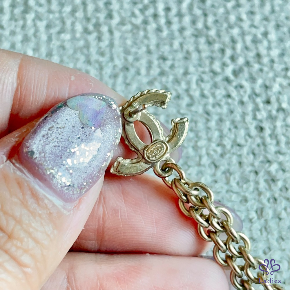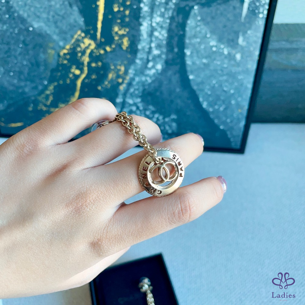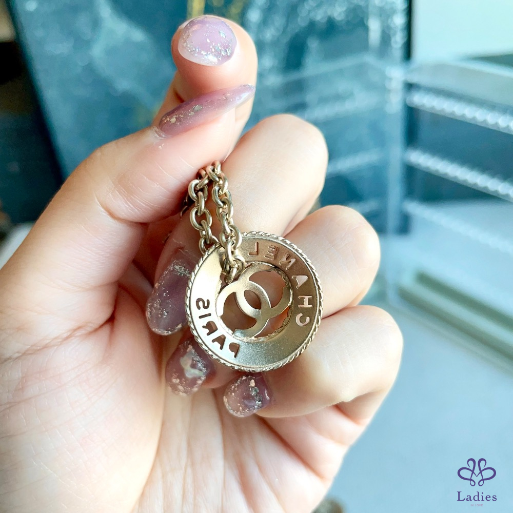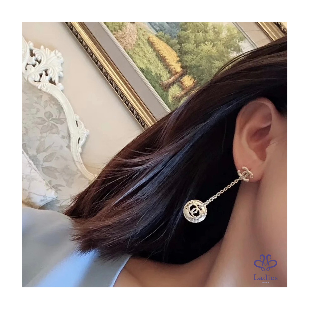 Chanel 圓盤鏤空字母長耳釘 淡金