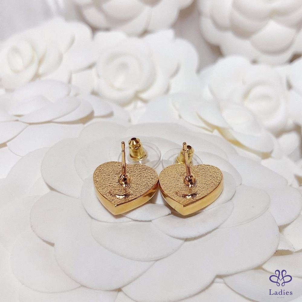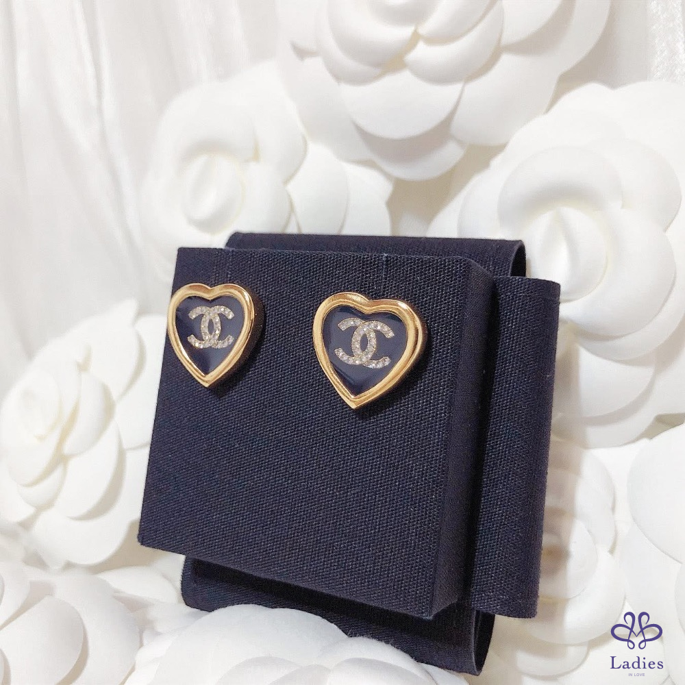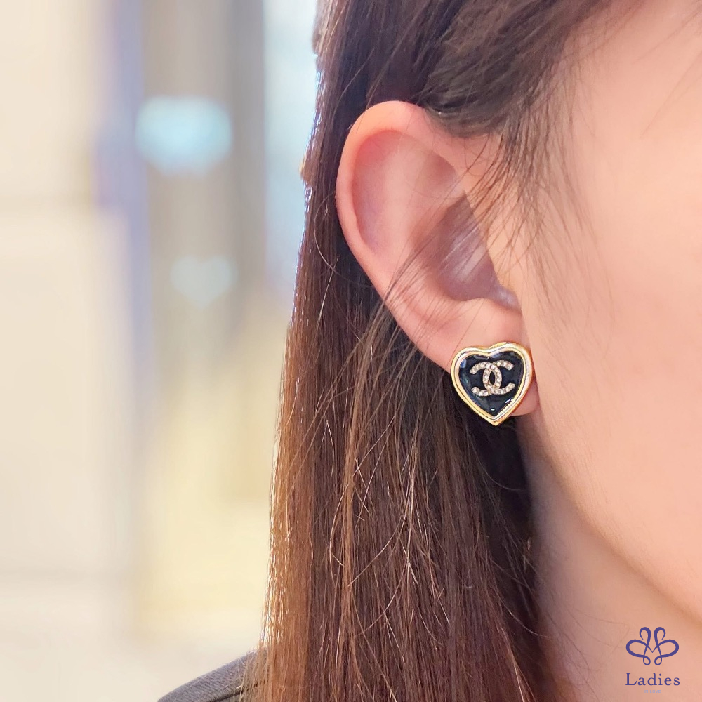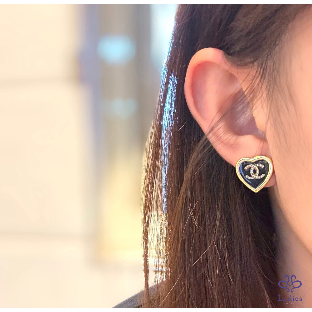 首頁 精品配件 CHANEL 香奈兒 小香 25B 黑色琺瑯 金邊 愛心 水鑽 雙C logo水鑽 針式 耳環 全新✨