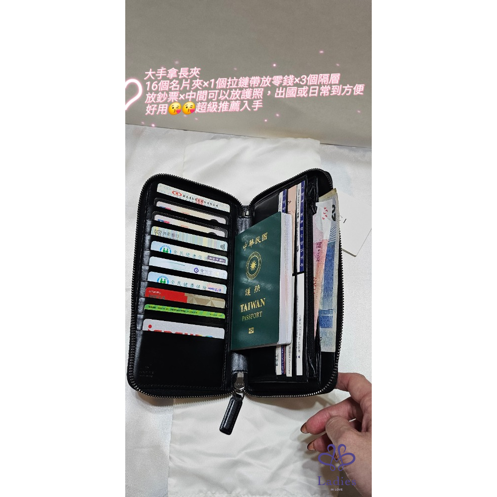 隔層:16個名片夾×1個拉鏈帶×3個鈔票隔層(中間可放大手機或護照)