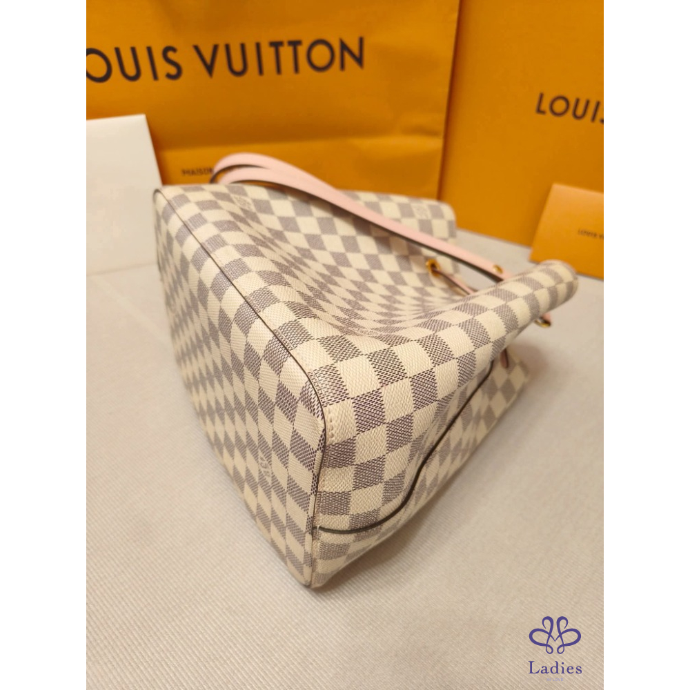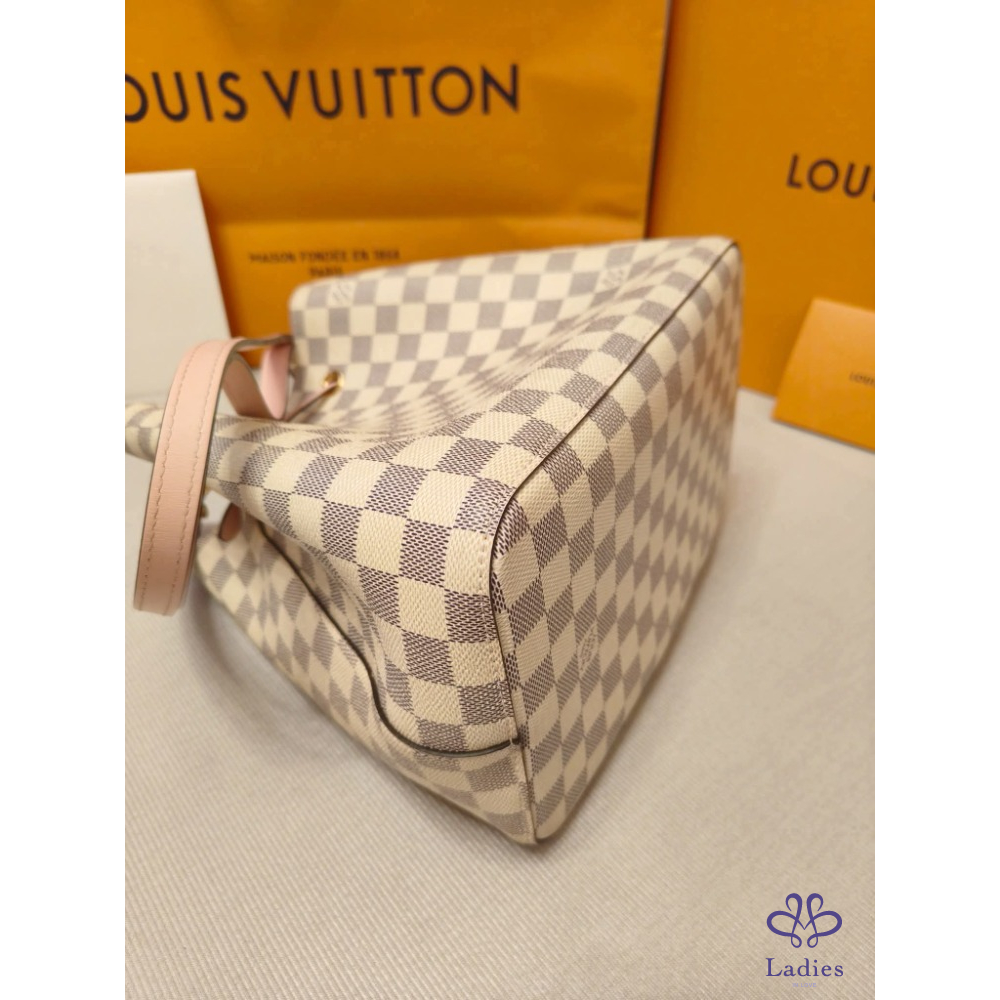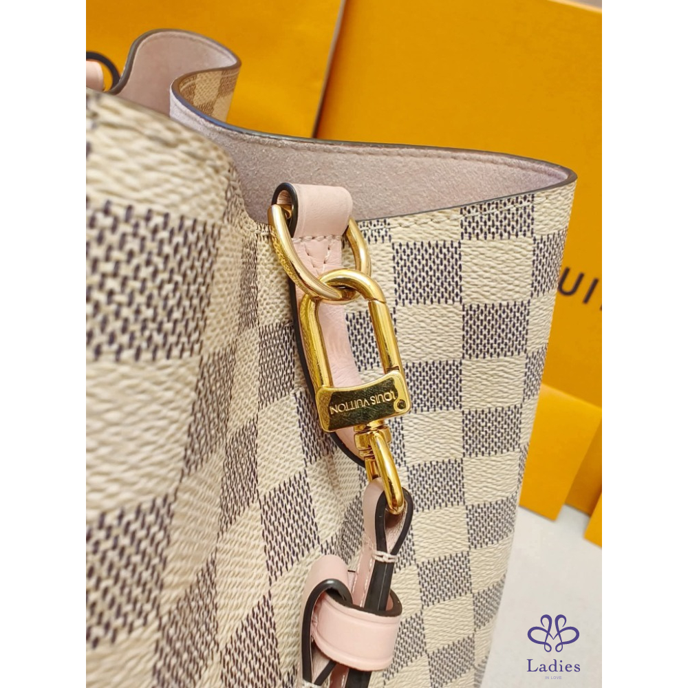 這隻白色棋盤格NÉONOÉ 手袋來自Louis Vuitton 2019春夏限定係列,在經典水桶輪廓上點綴櫻花粉色抽繩和肩帶,散發清新甜美的夏日氣息。半敞開式的束口設計隱約露出粉紅色絨面革裡襯,搭配輕盈且耐用的淺色塗層帆布,讓水桶包煥發年輕活力。