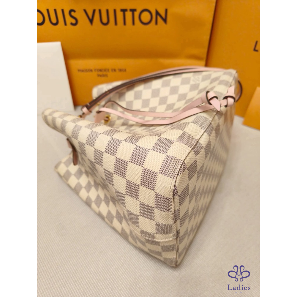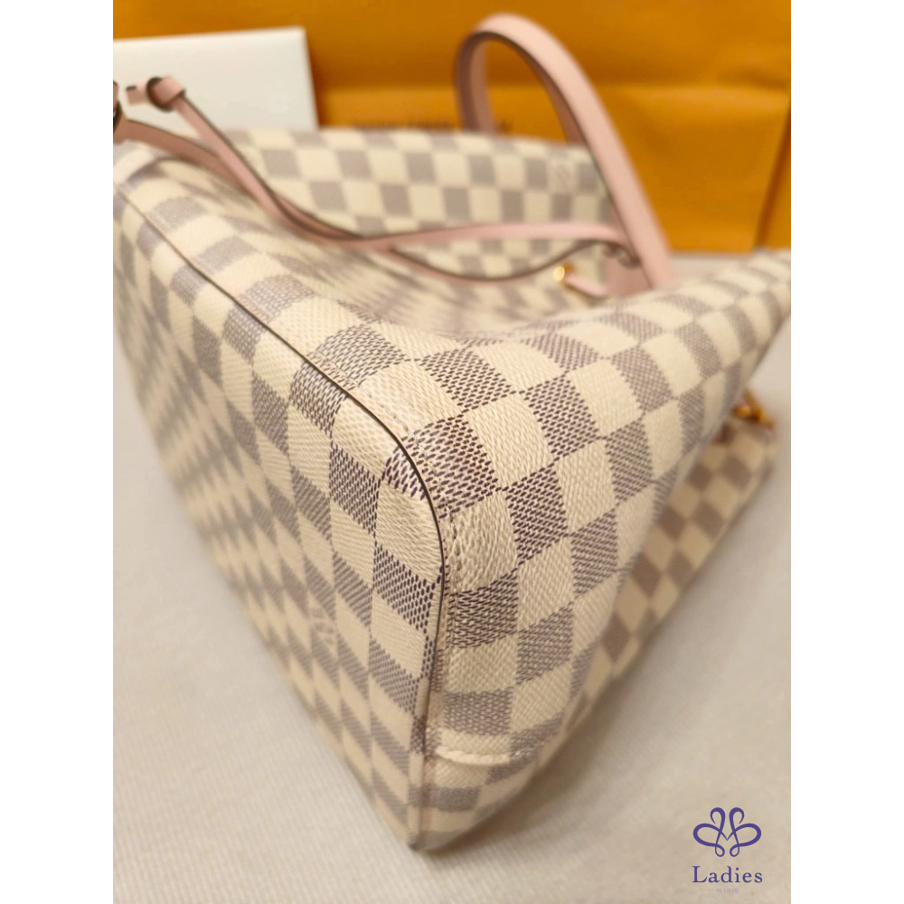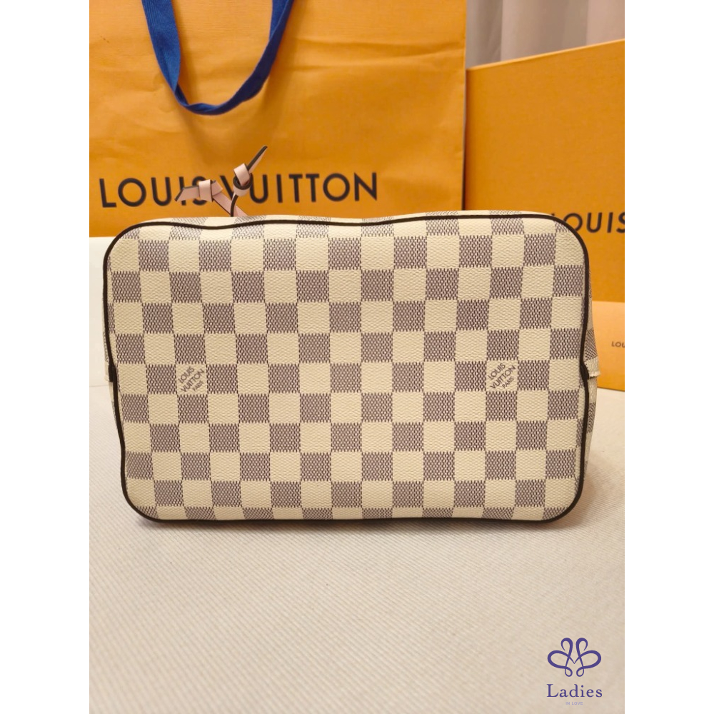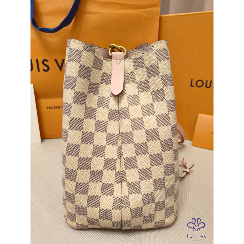 這隻白色棋盤格NÉONOÉ 手袋來自Louis Vuitton 2019春夏限定係列,在經典水桶輪廓上點綴櫻花粉色抽繩和肩帶,散發清新甜美的夏日氣息。半敞開式的束口設計隱約露出粉紅色絨面革裡襯,搭配輕盈且耐用的淺色塗層帆布,讓水桶包煥發年輕活力。