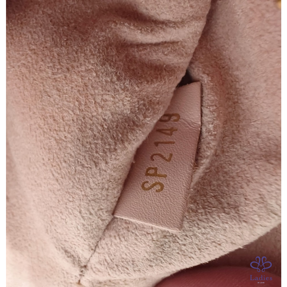 包包以皮革抽繩束口,半敞開式的結構從頂部看像一朵綻放的花朵。其實這種束口設計最初是為了起到加強作用,保證放在裡面的香檳瓶不會晃動或傾倒。相較於Noé 手袋的8孔式束帶設計,NéoNoé 的抽繩減少為4孔,並在包內兩側以皮革扣加固,不易滑脫。正面繫帶簡化為抽繩設計,方便單手操作,自然垂落的兩根粉紅色束帶也為包包增加靈動細節。