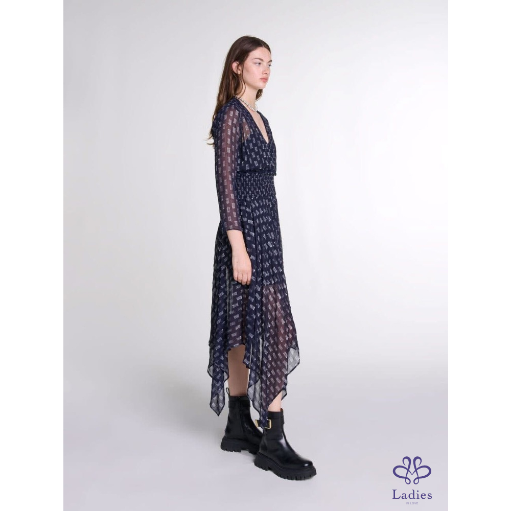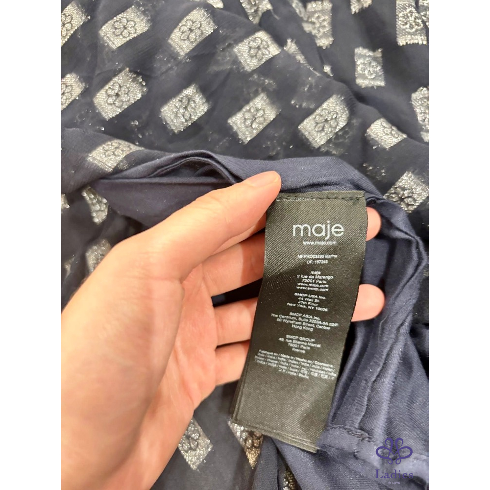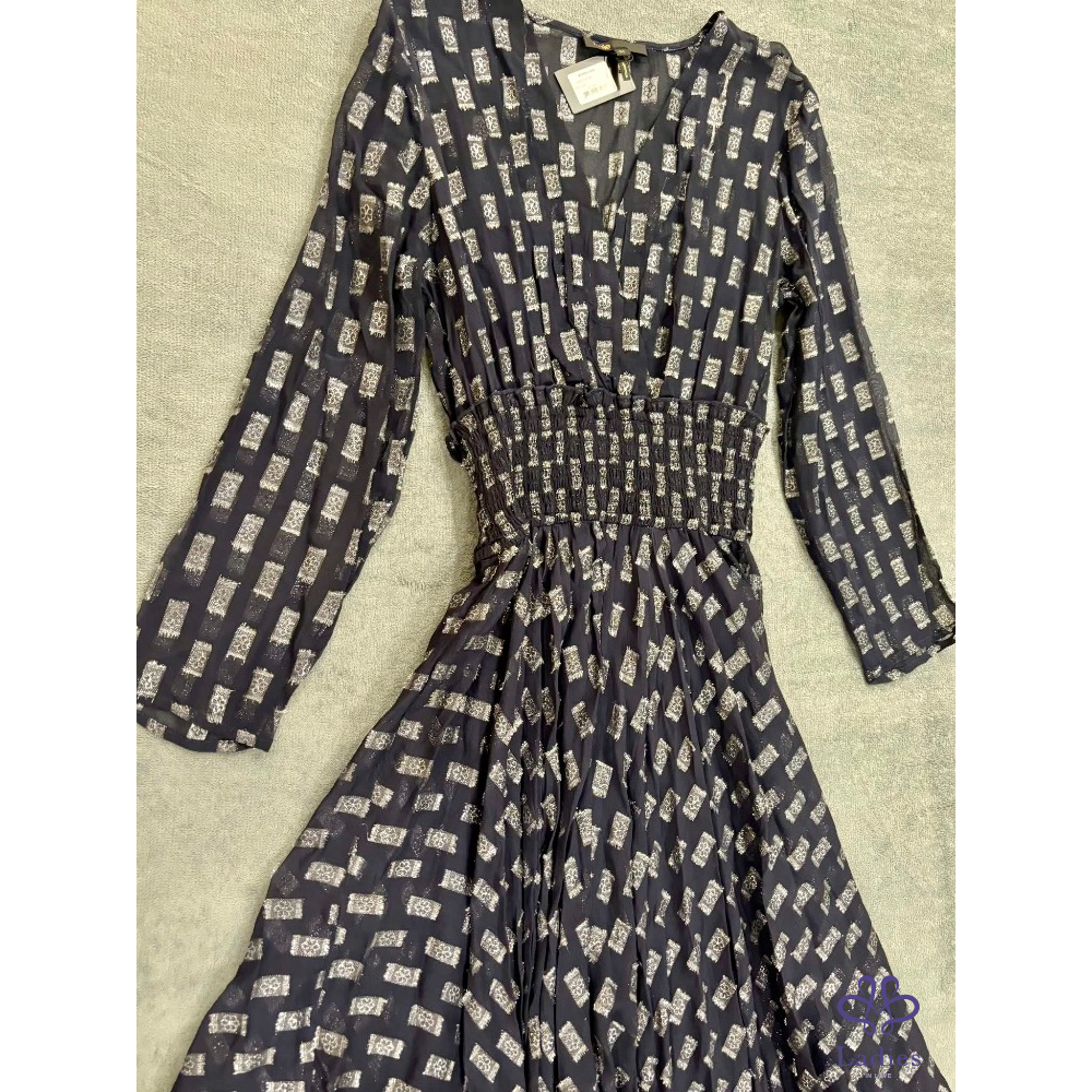 MAJE 幾何銀紗印花深藍垂墜感洋裝