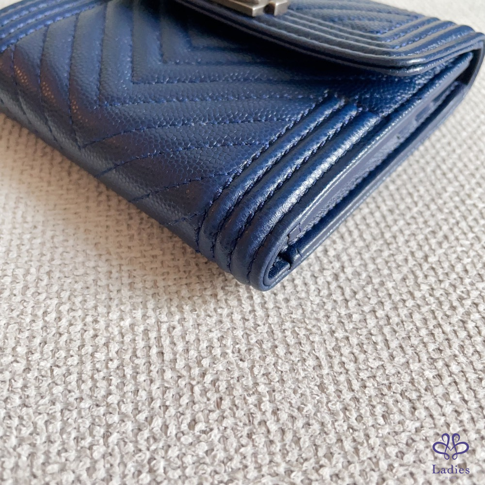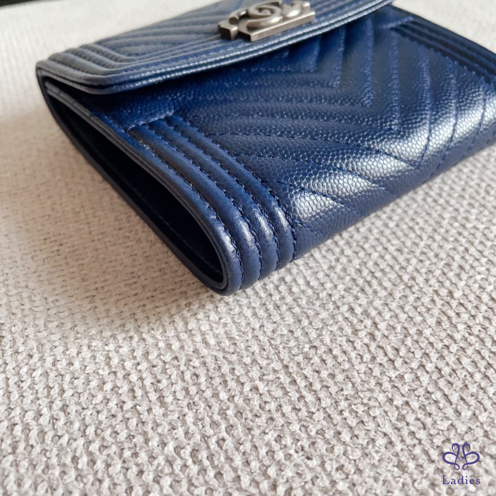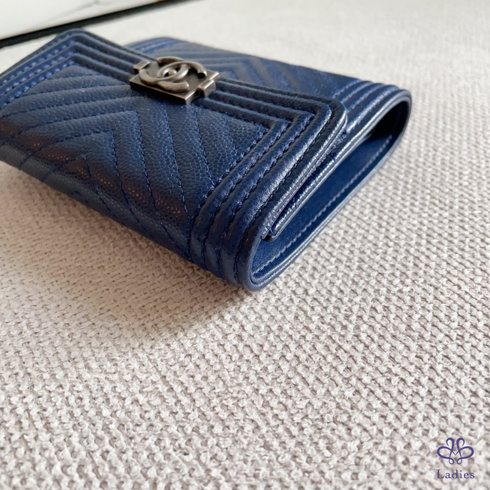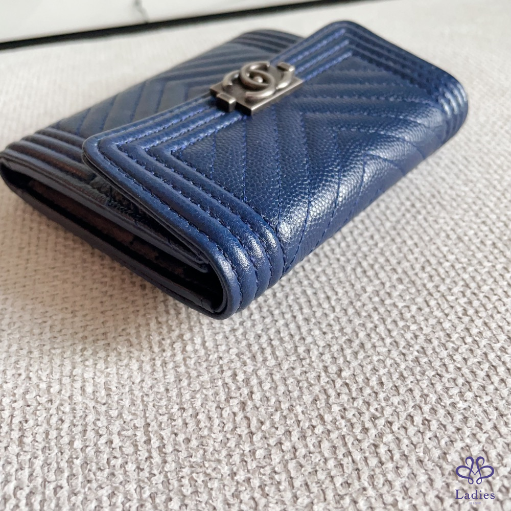Chanel Boy 三折短夾 藍色銀釦山型紋