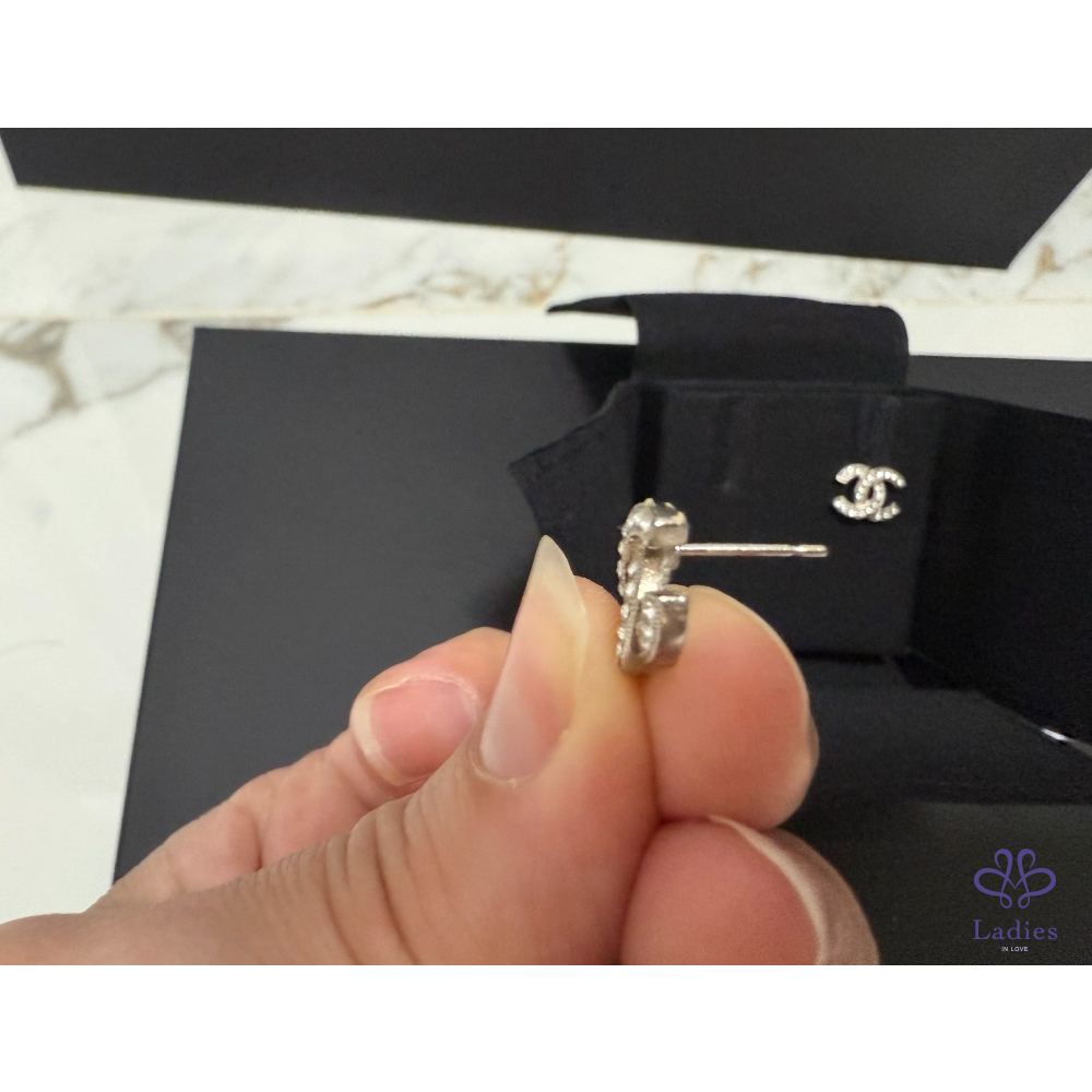 CHANEL 小 雙C帶鑽耳環 銀色